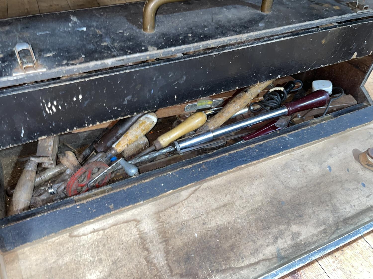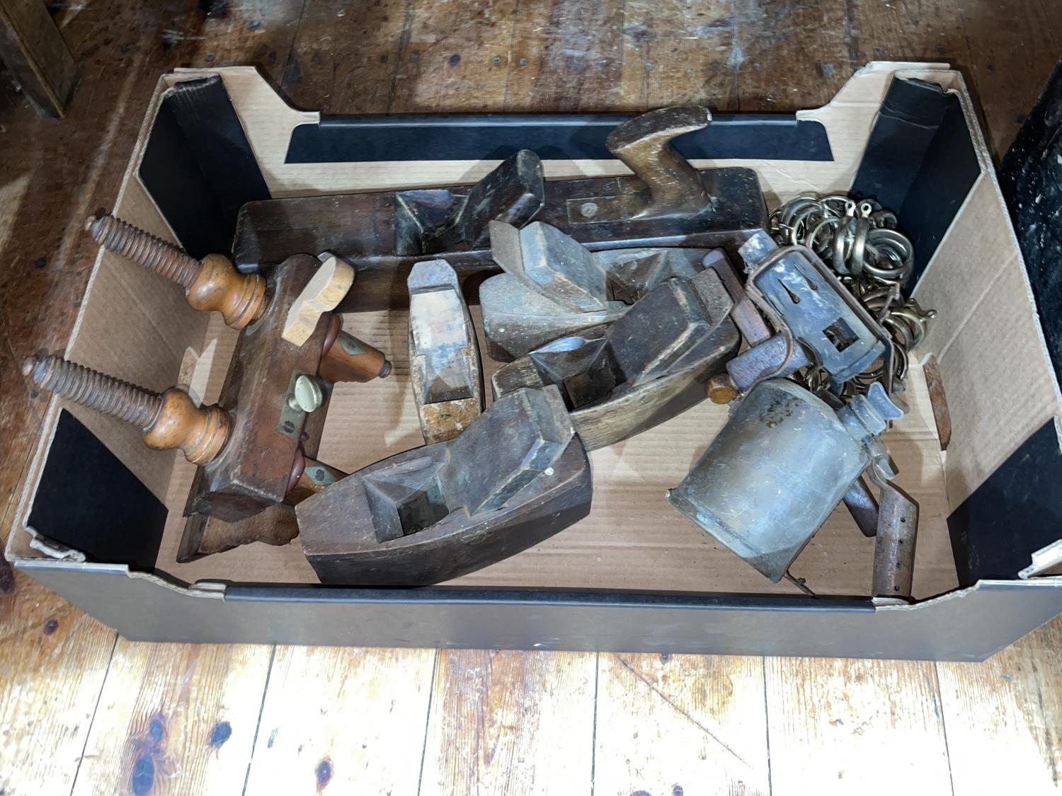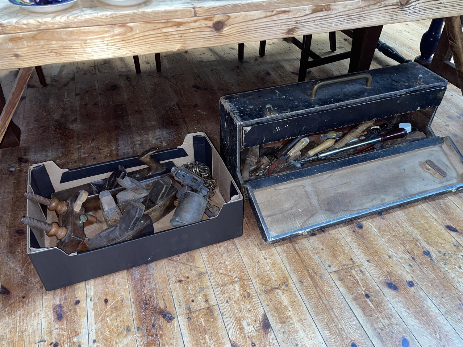 Collection of wood planes, vintage tools, tool box, etc.