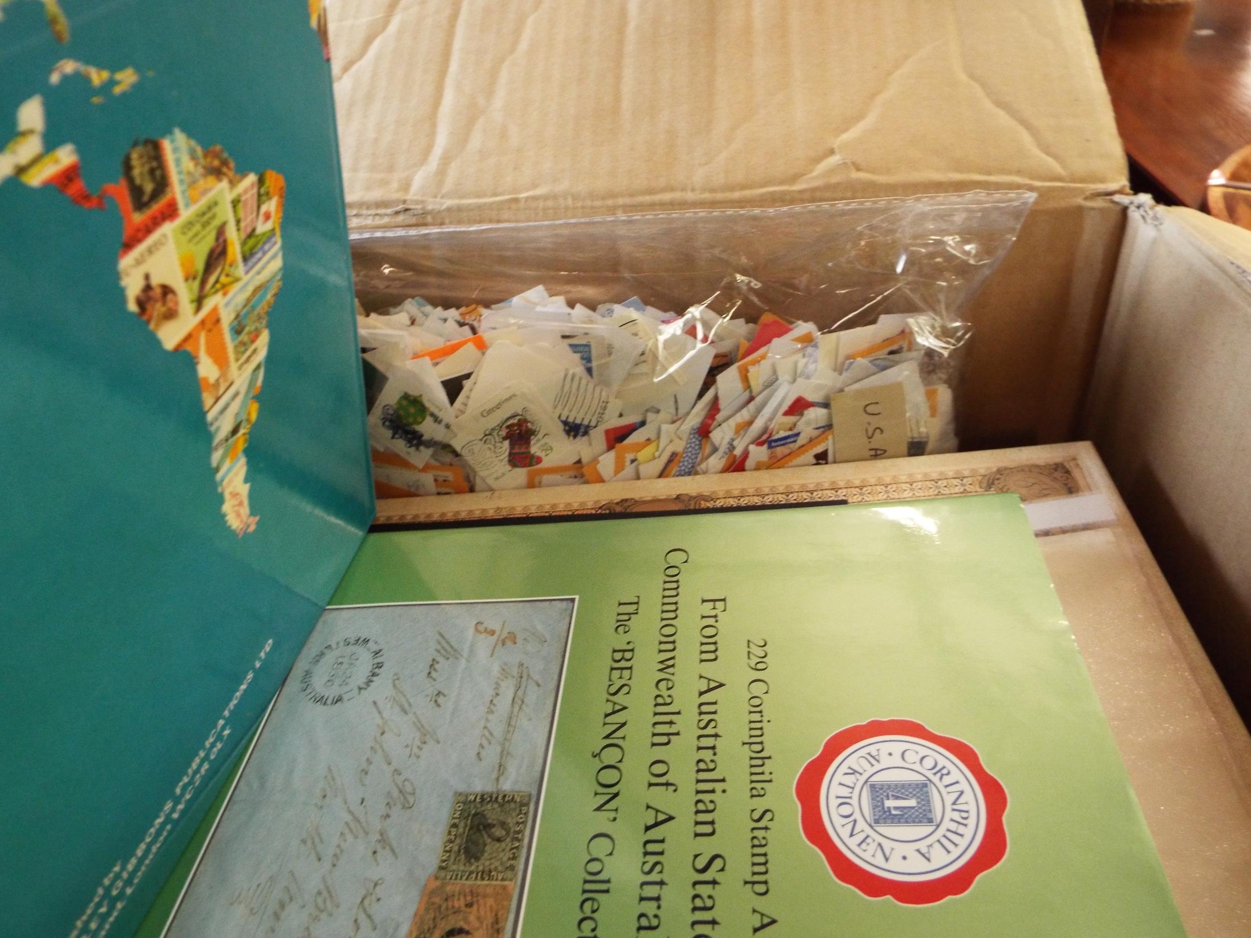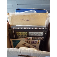 A large box of assorted stamps in albums, catalogues, First Day Covers etc