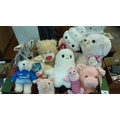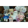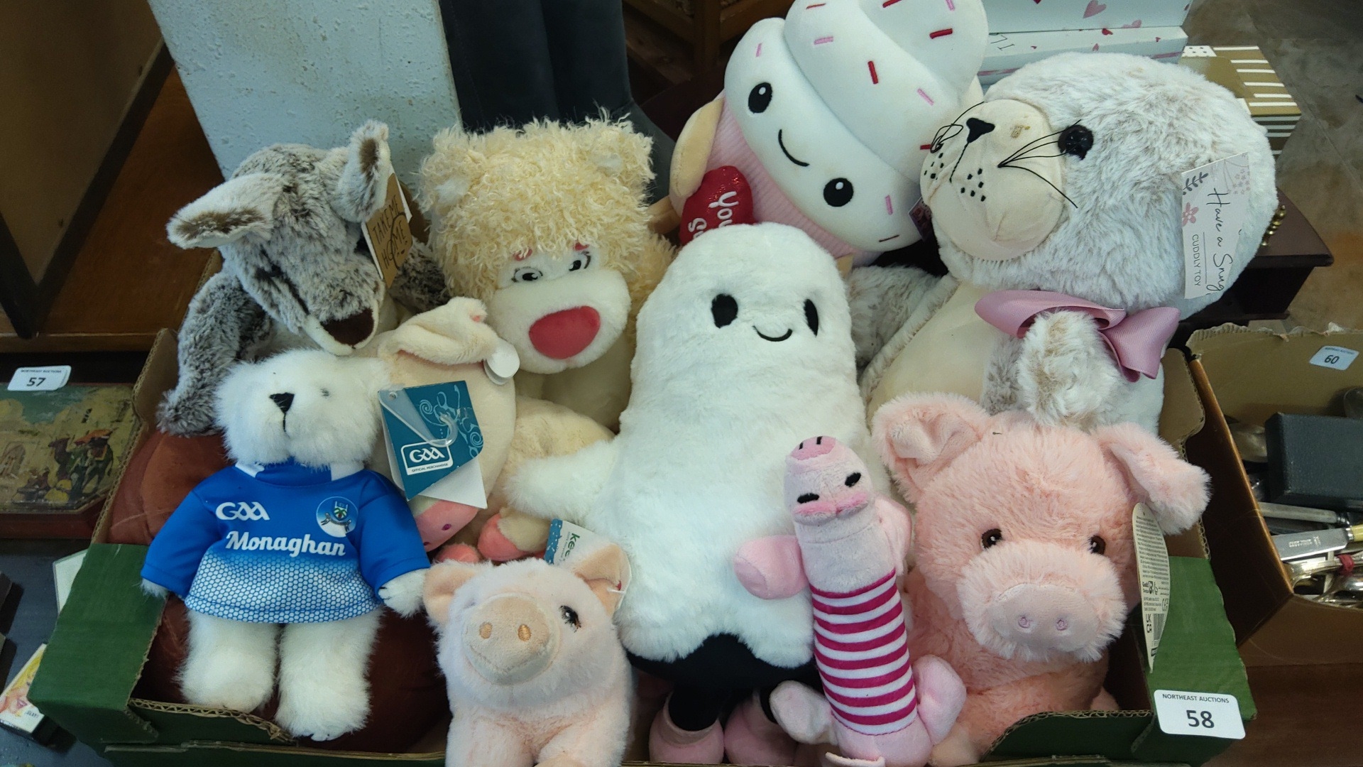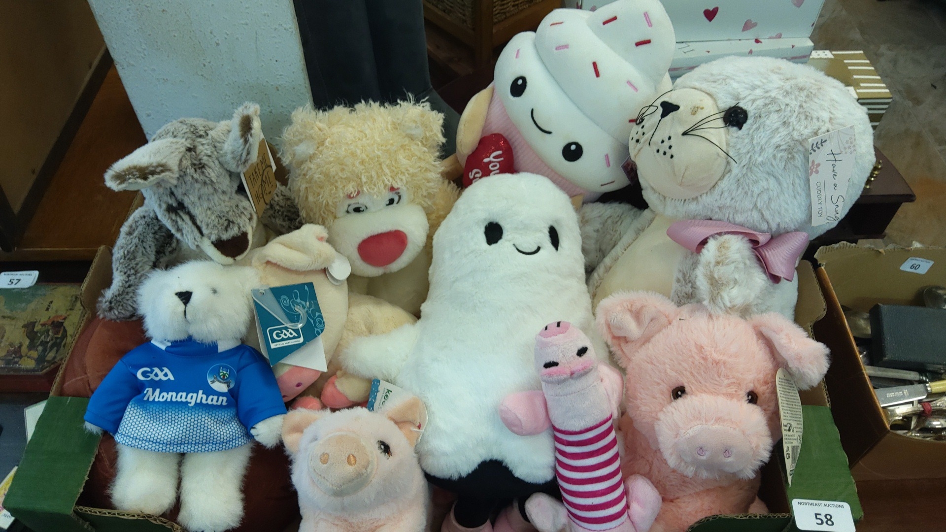 A group of assorted plush toys including a GAA Monaghan teddy bear, a lamb, a grey rabbit, a seal with ribbon collar, a pig, and novelty character soft toys, various makers’ tags.