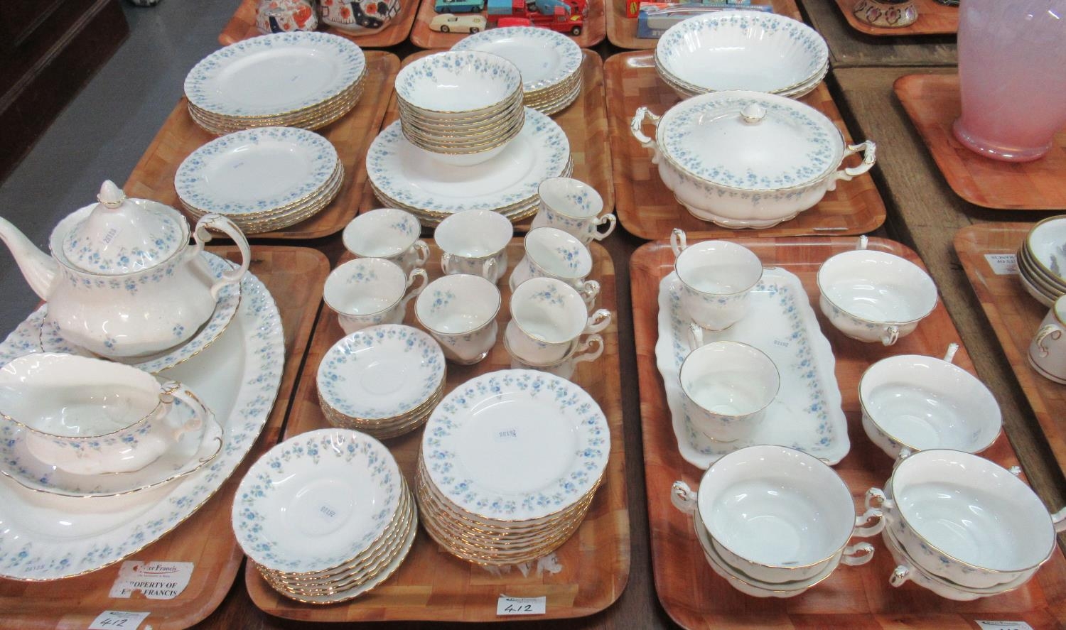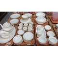 Six trays of Royal Albert 'Memory Lane' tea and dinner ware to include: 12 dinner plates, 14 side plates, 12 tea plates, 8 small bowls and 3 large bowls, 6 double-handled soup bowls, 6 tea cups and saucers, and 6 coffee cups and saucers, lidded vegetable dish, teapot, gravy boat and stand, oval meat plate, oblong platter, and 1 soup plate. (6)