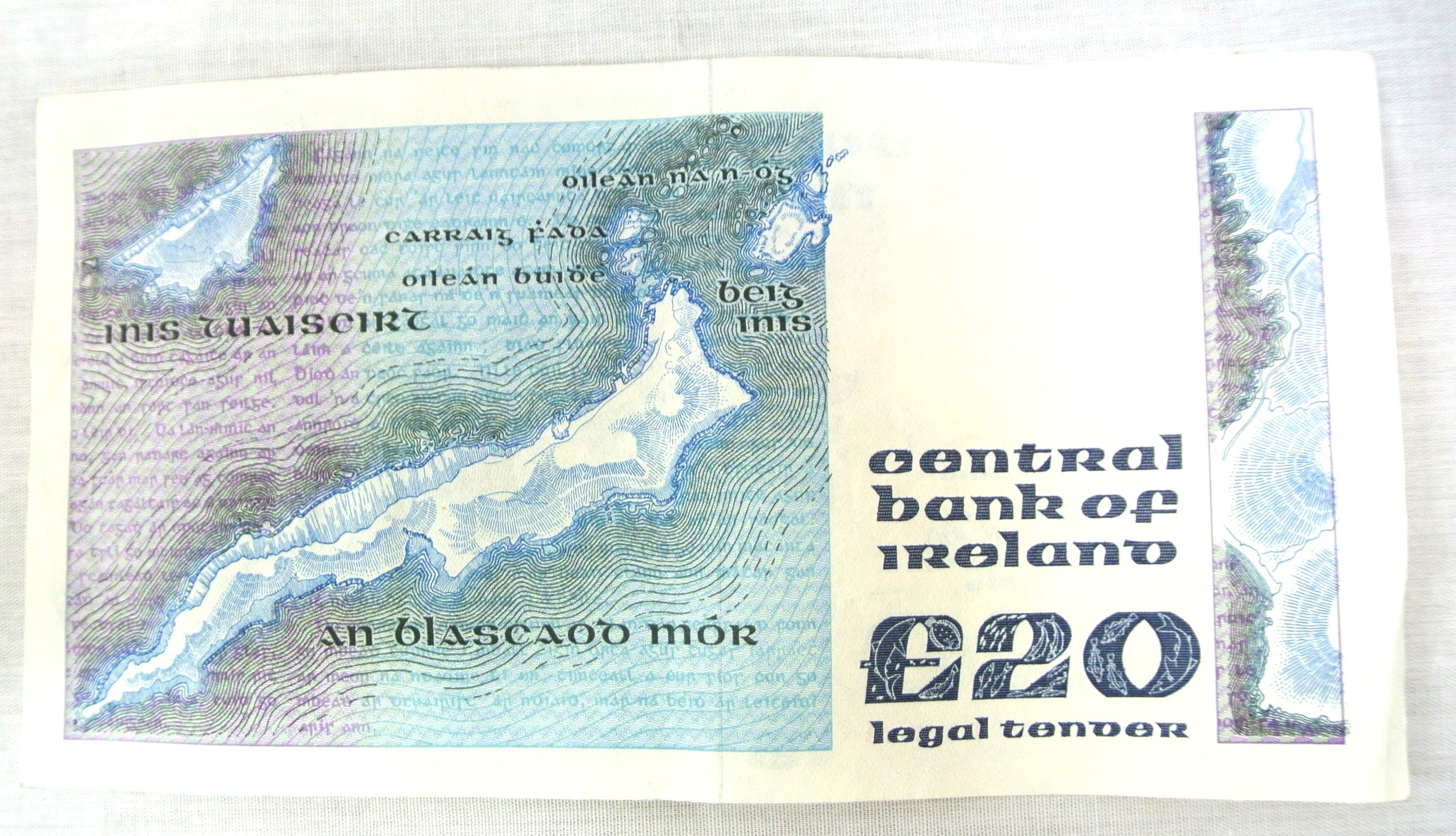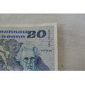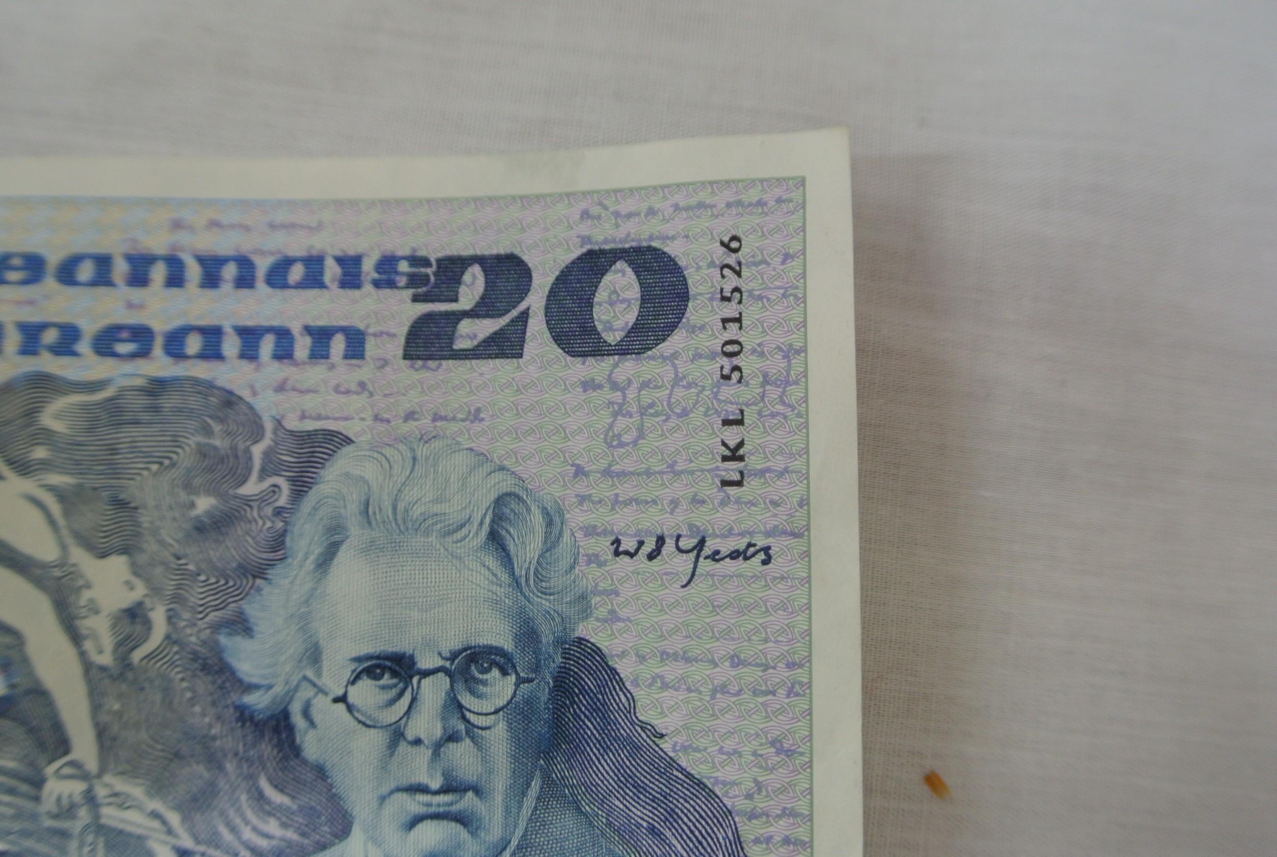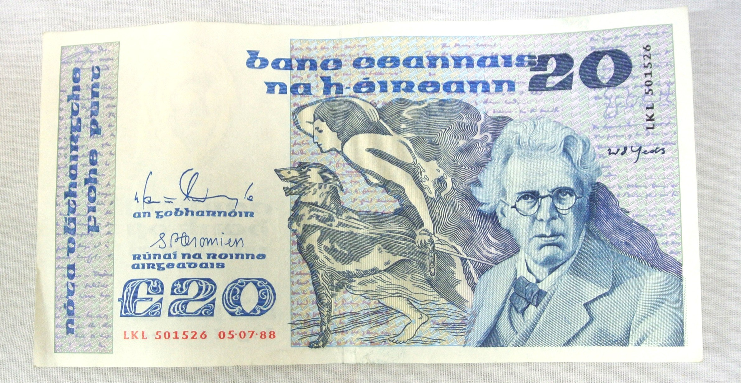 'Irish Writers, Philosophers and Artist' series £20 note, 05.07.1988. Maurice F Doyle and Sean P Cronin signatures. Used clean note LKL 501526 05.07.88