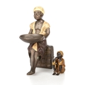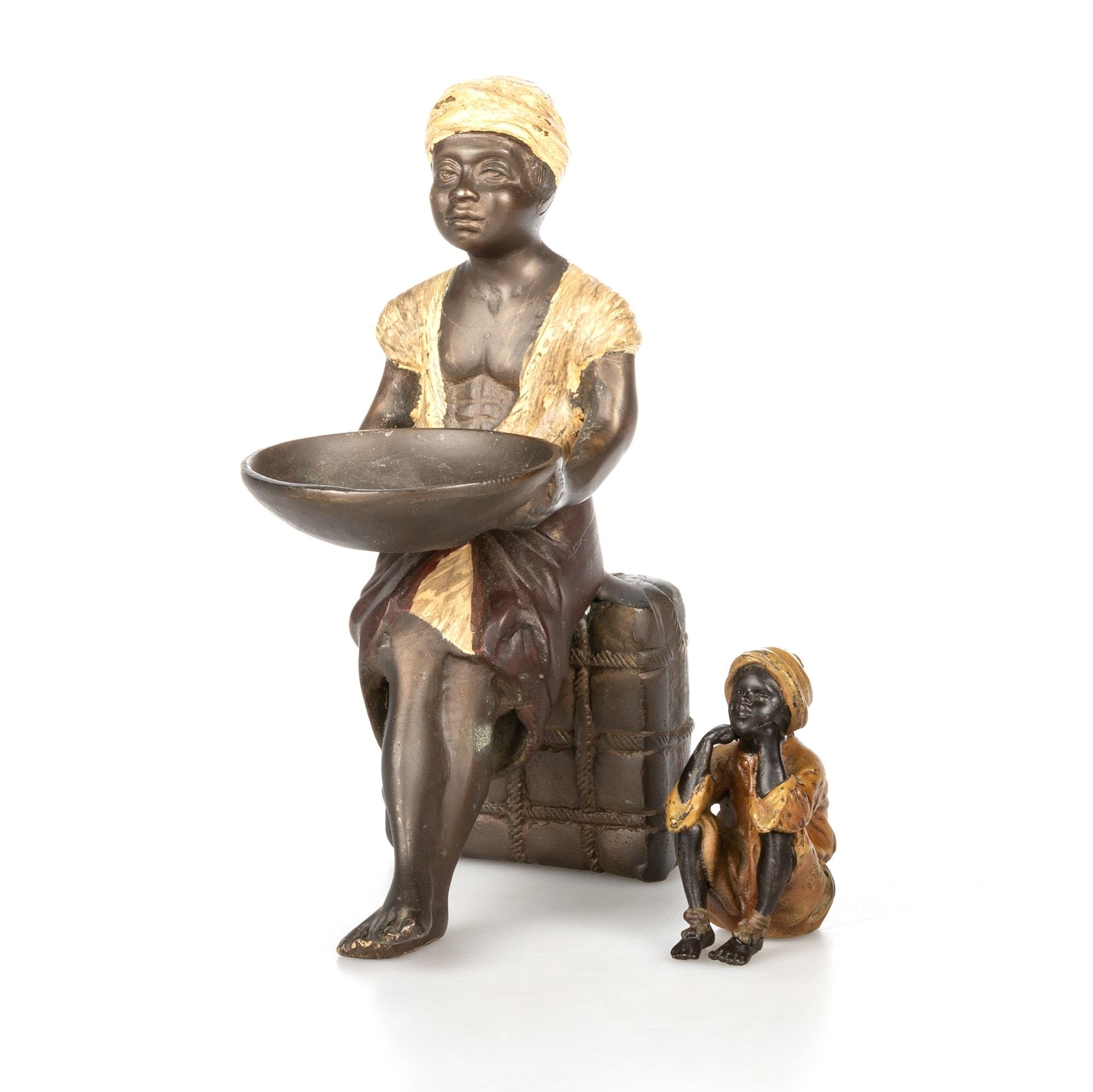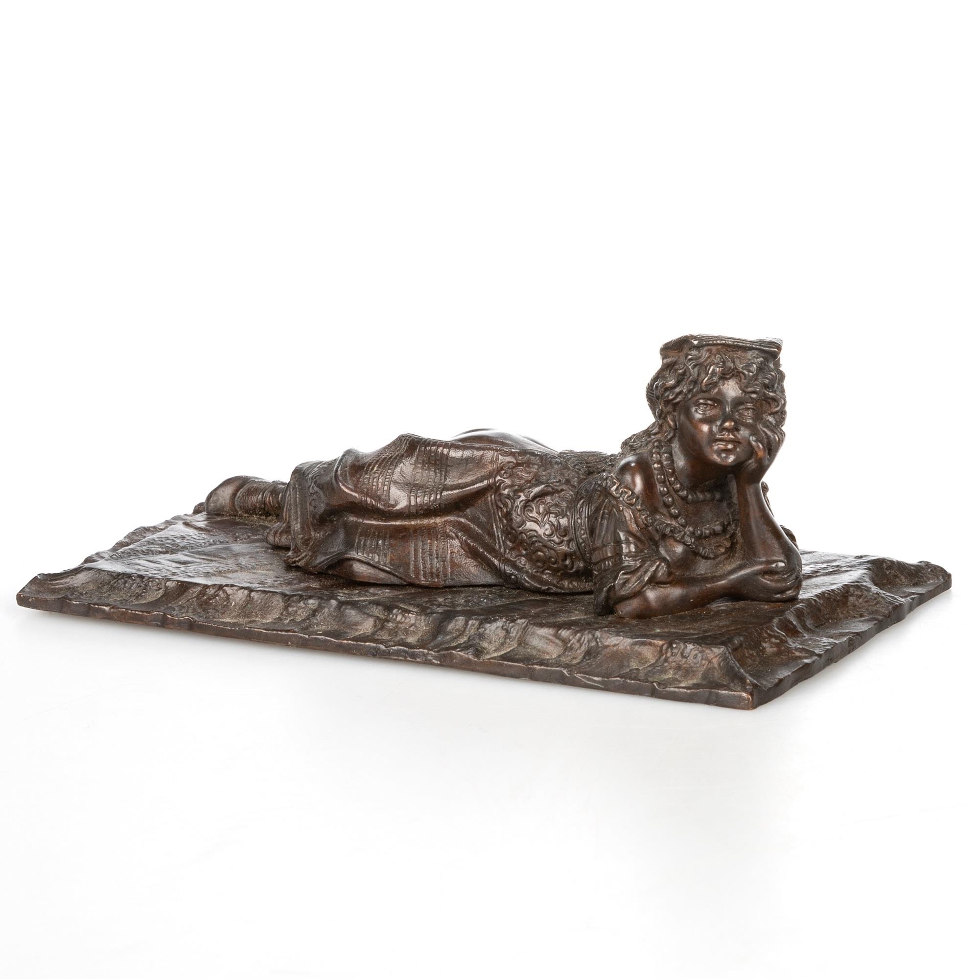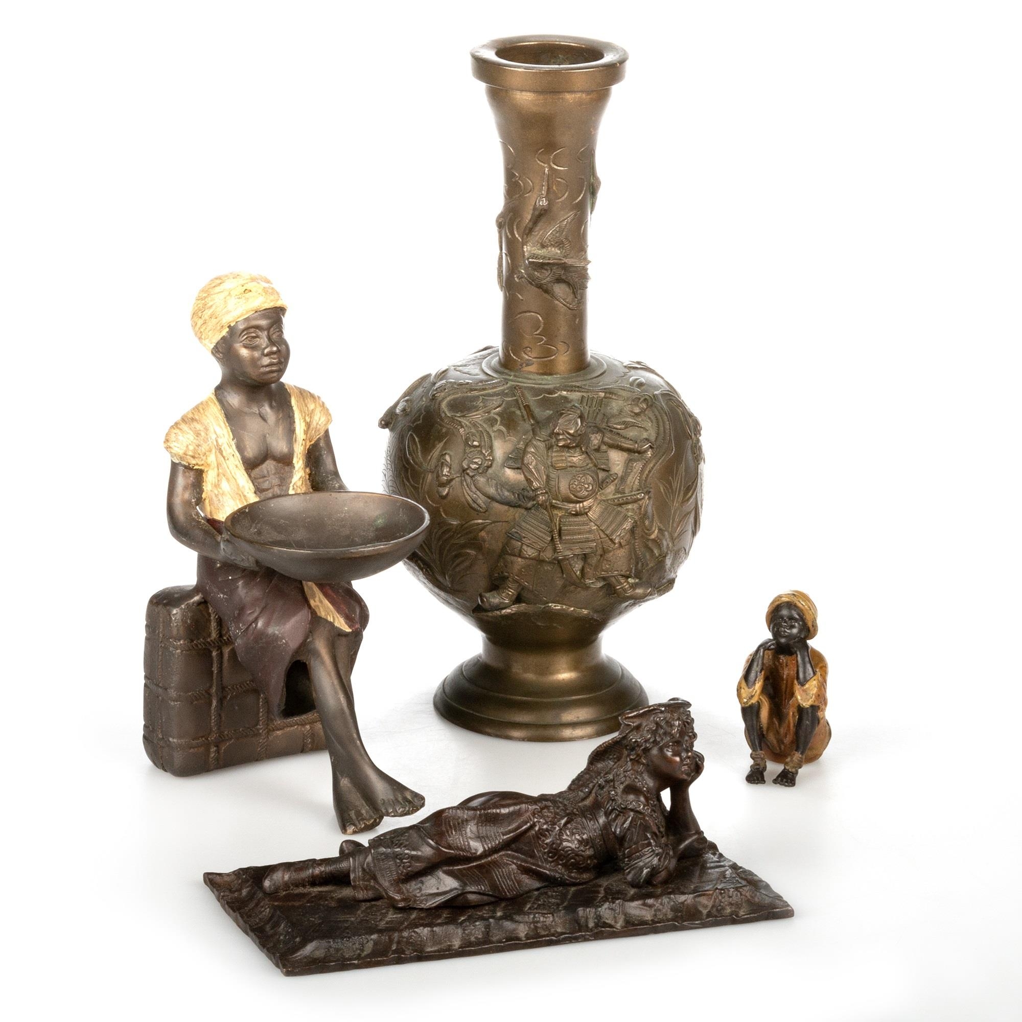including a Japanese vase, 25.5cm high; a figure of a street seller, 18cm high; a figure of a seated boy, bears Bergman marks, 6.5cm high; and the figure of a girl lying on a carpet, bears BERGM mark, 18cm wide. (4)