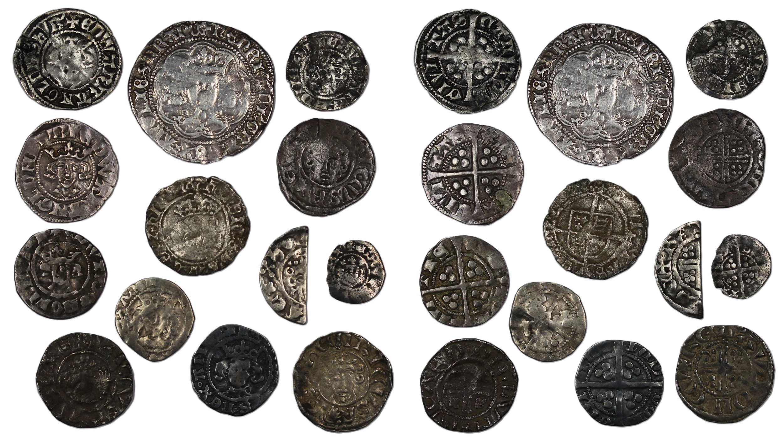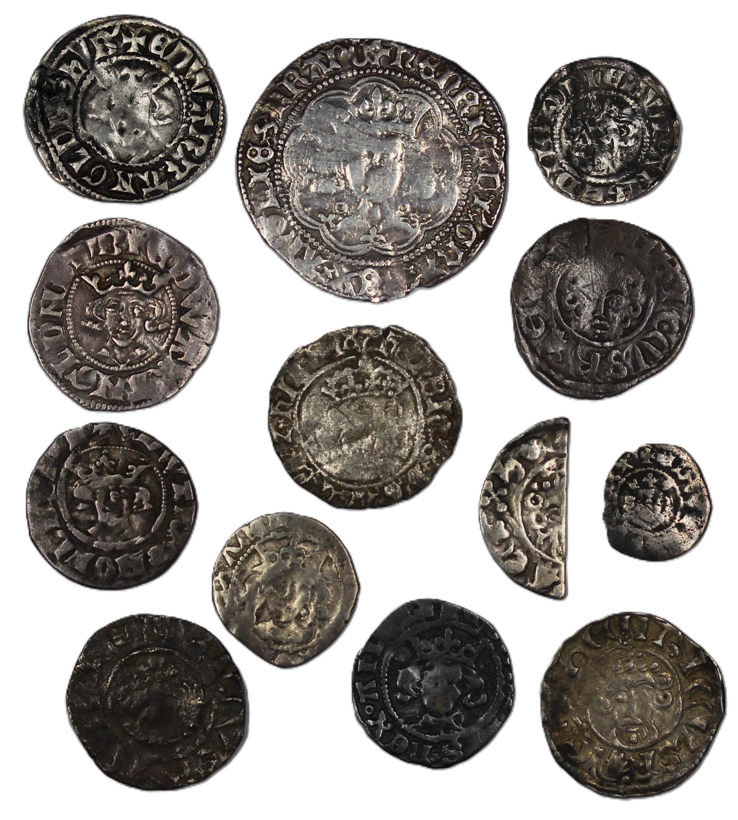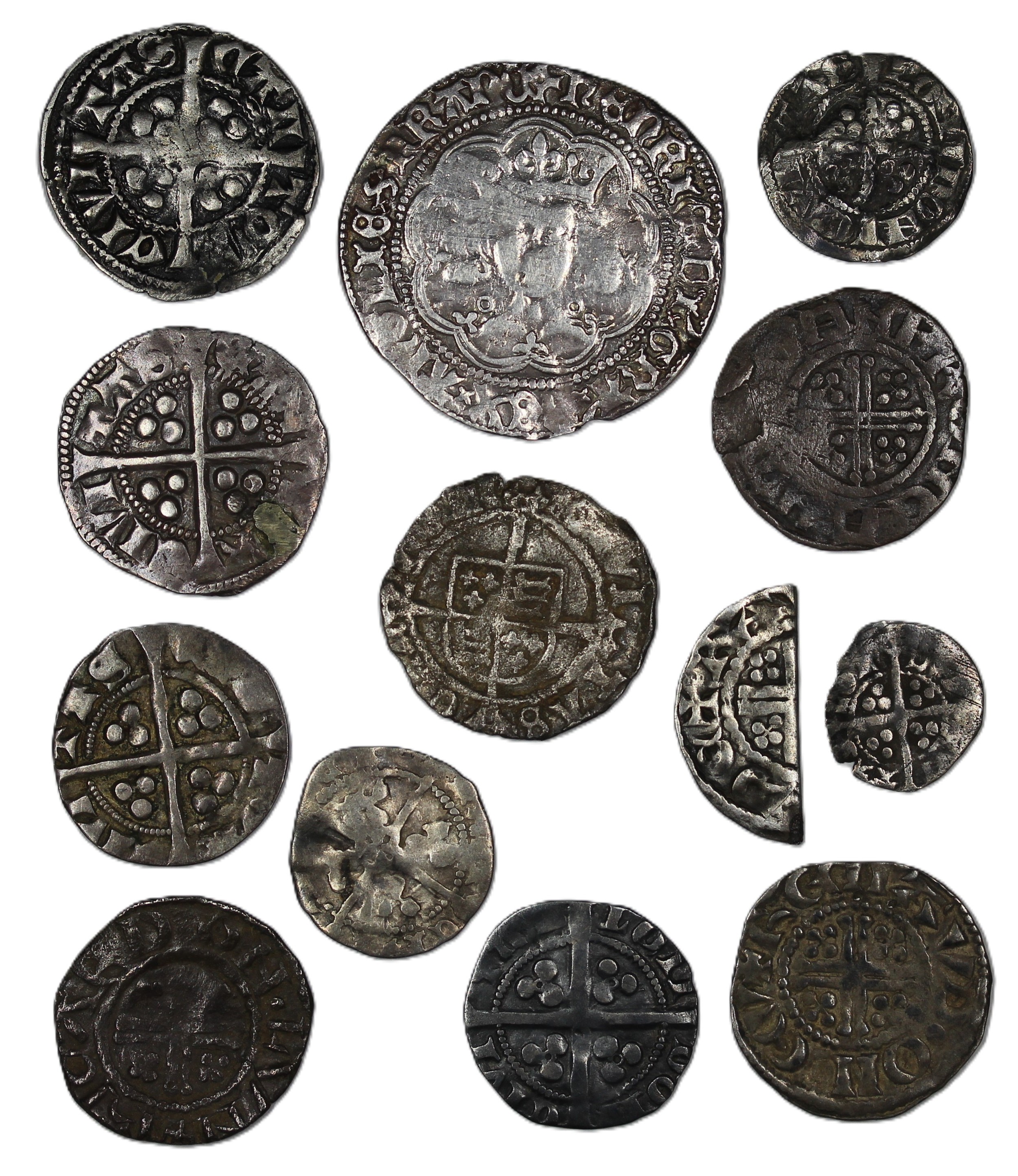 Assorted hammered coins (13) of varying denominations form groat to farthing to include cut half. Of mixed grades, plenty appealing.