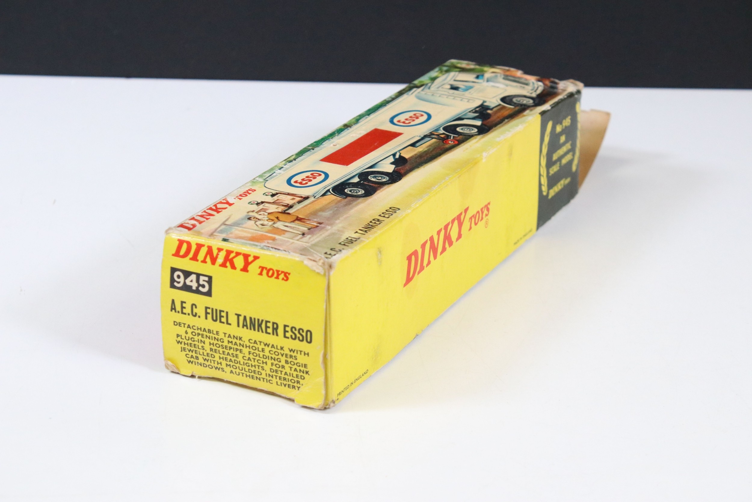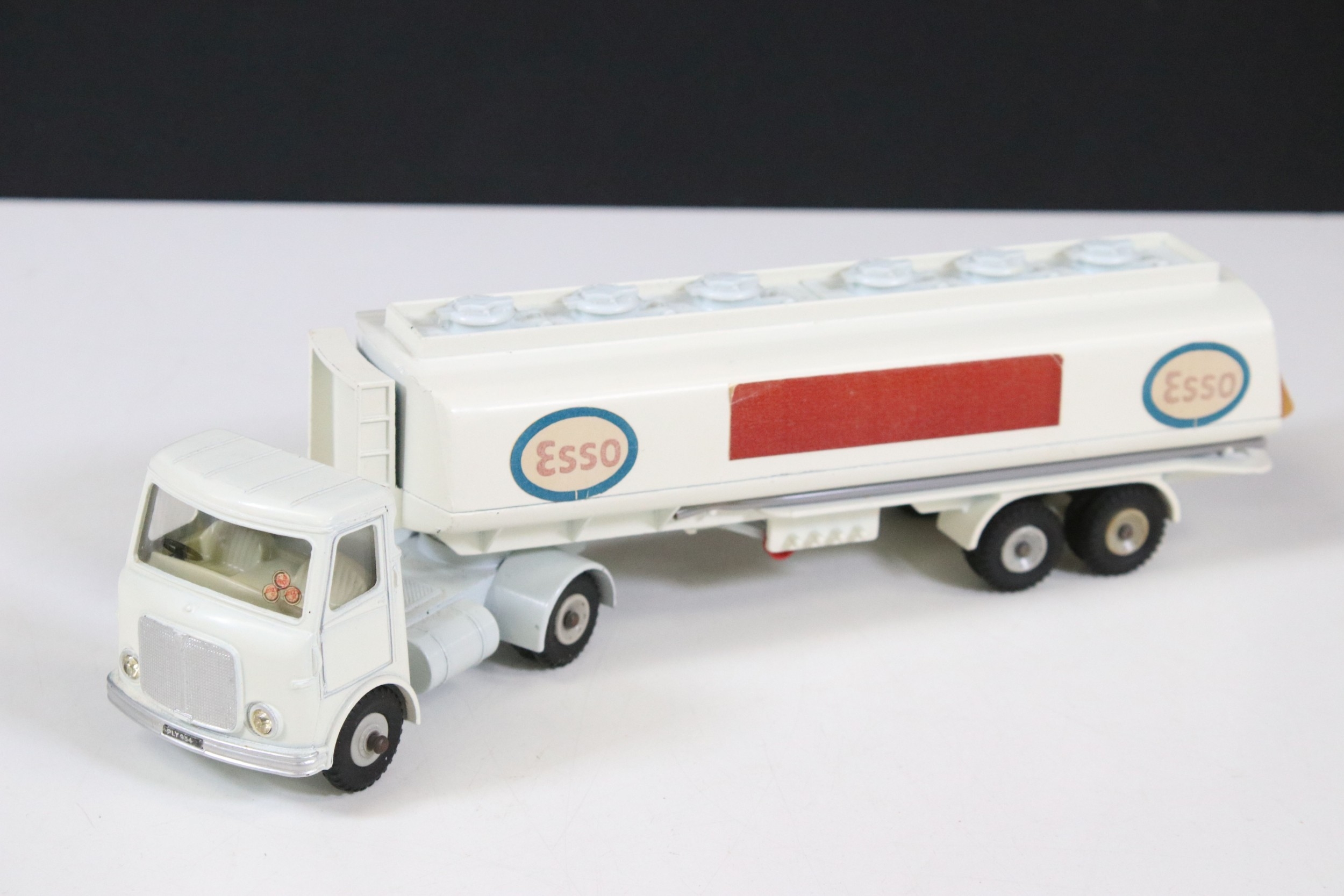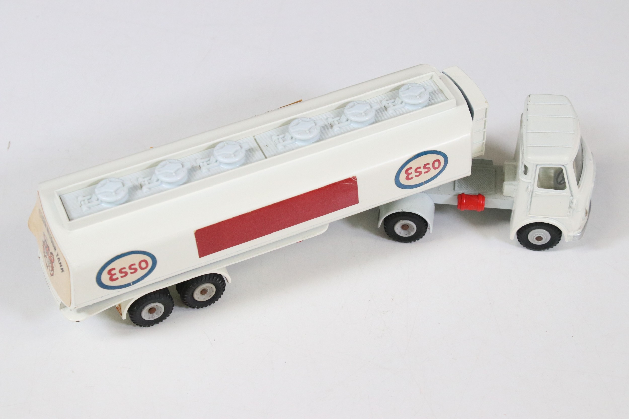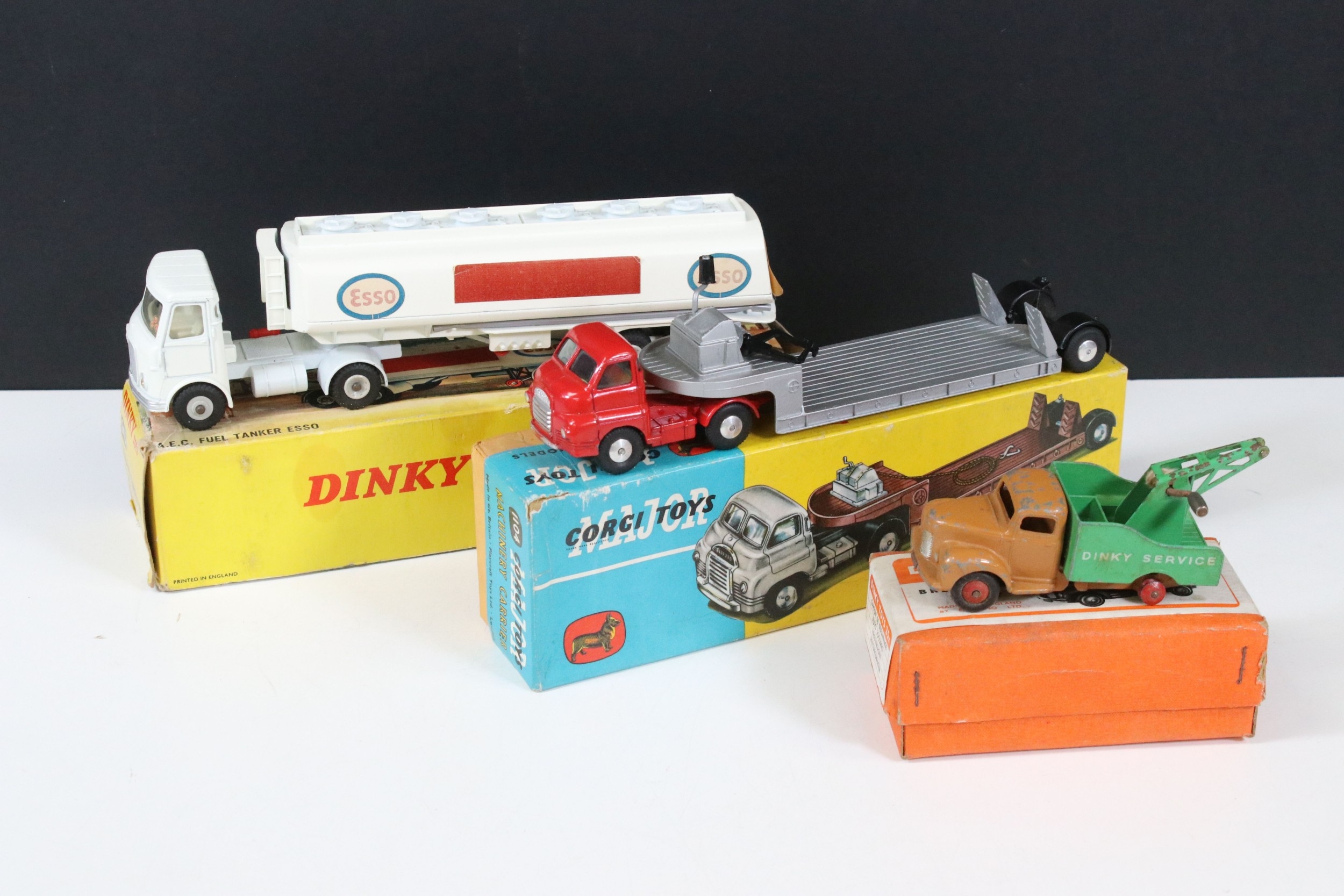 Three boxed Corgi and Dinky diecast models to include Corgi Major 1104 Carrimore Detachable Axle Machinery Carrier with Corgi Model Club leaflet, Dinky 945 AEC Fuel Tanker ESSO (One end flap broken) and Dinky 25X Breakdown Lorry, diecast varies in condition from playworn to vg, boxes showing signs of storage and edge wear and light grubbiness