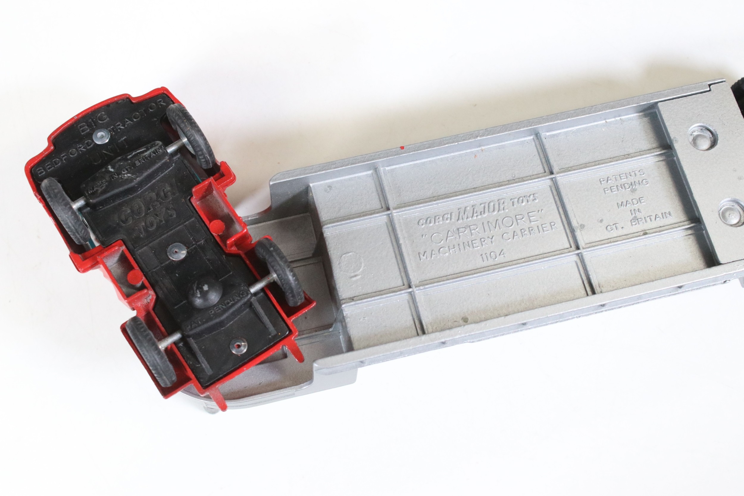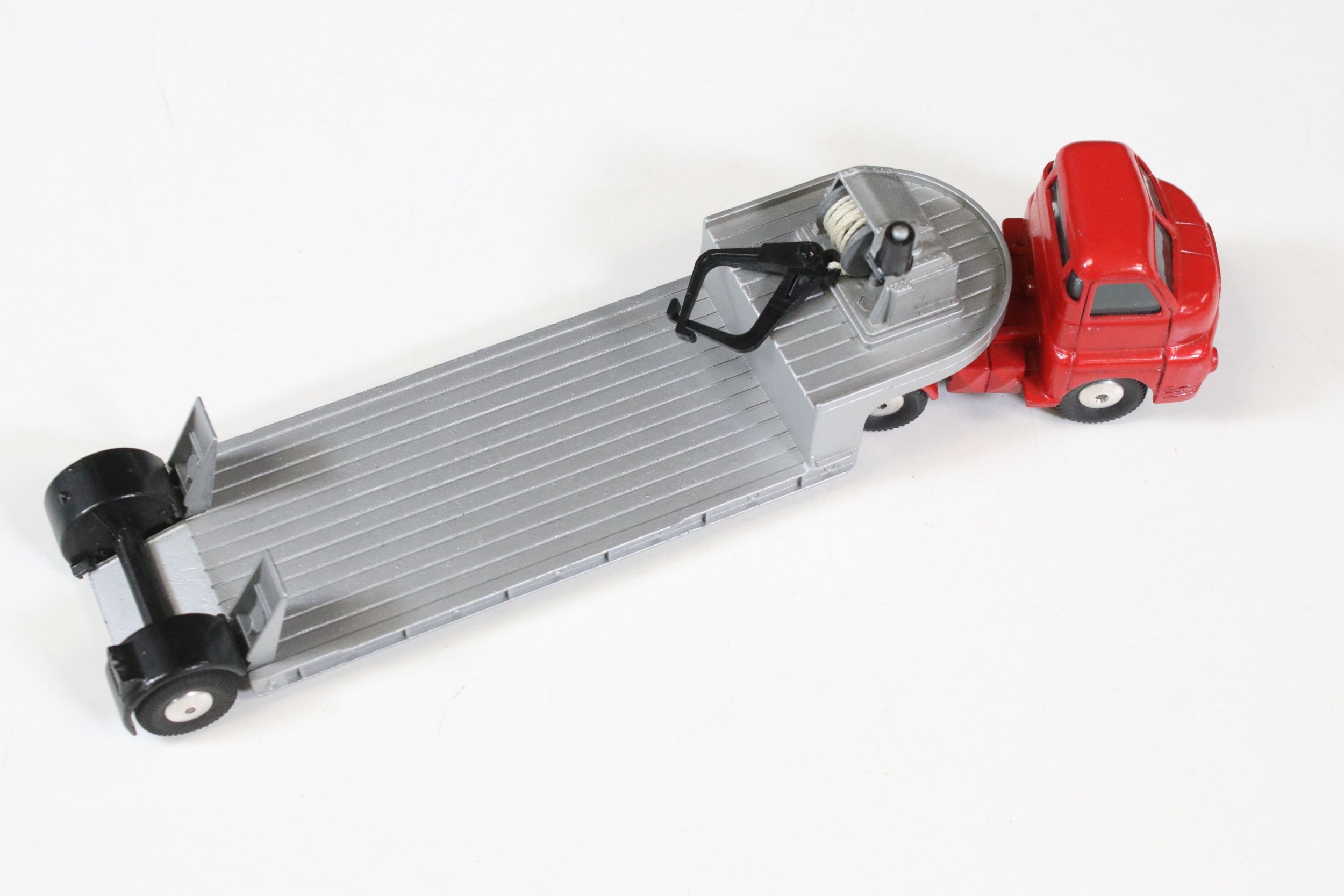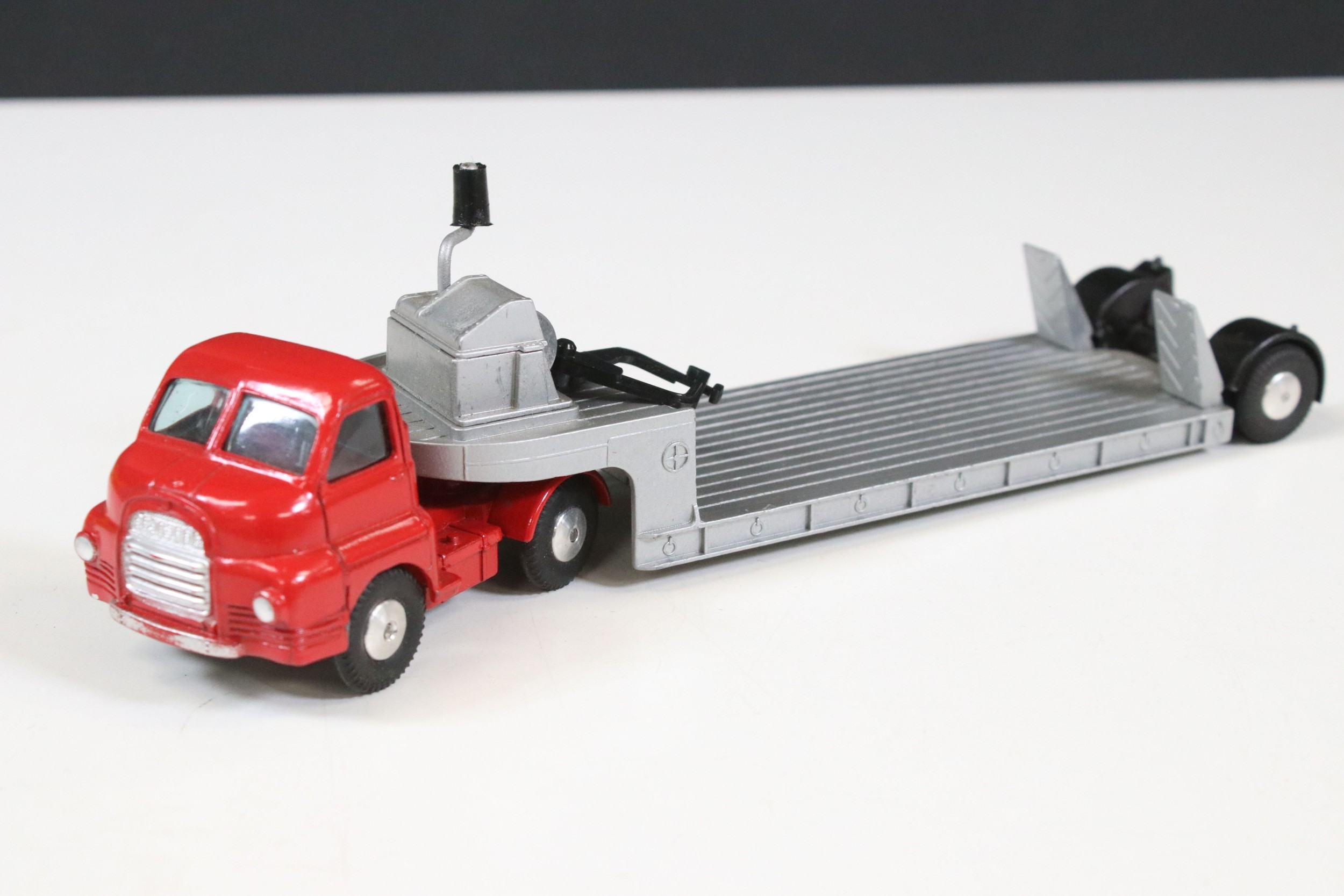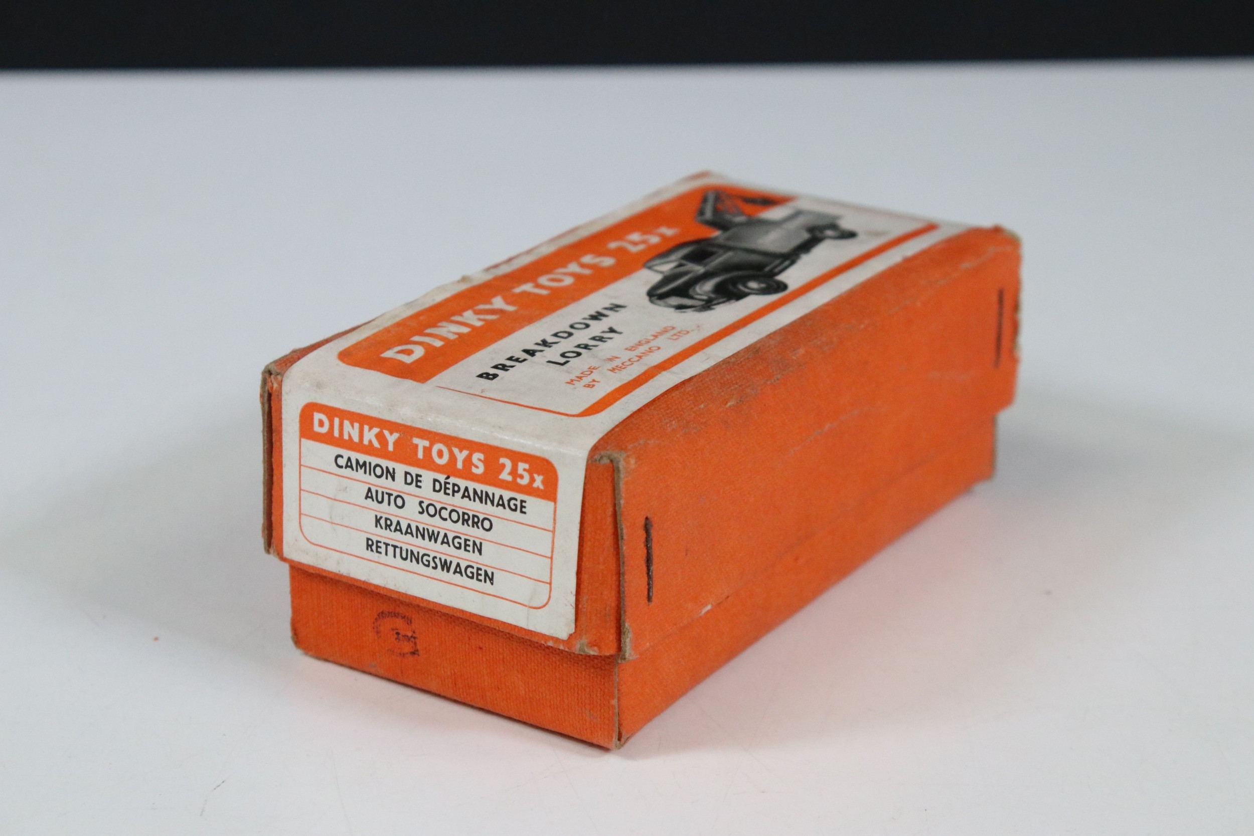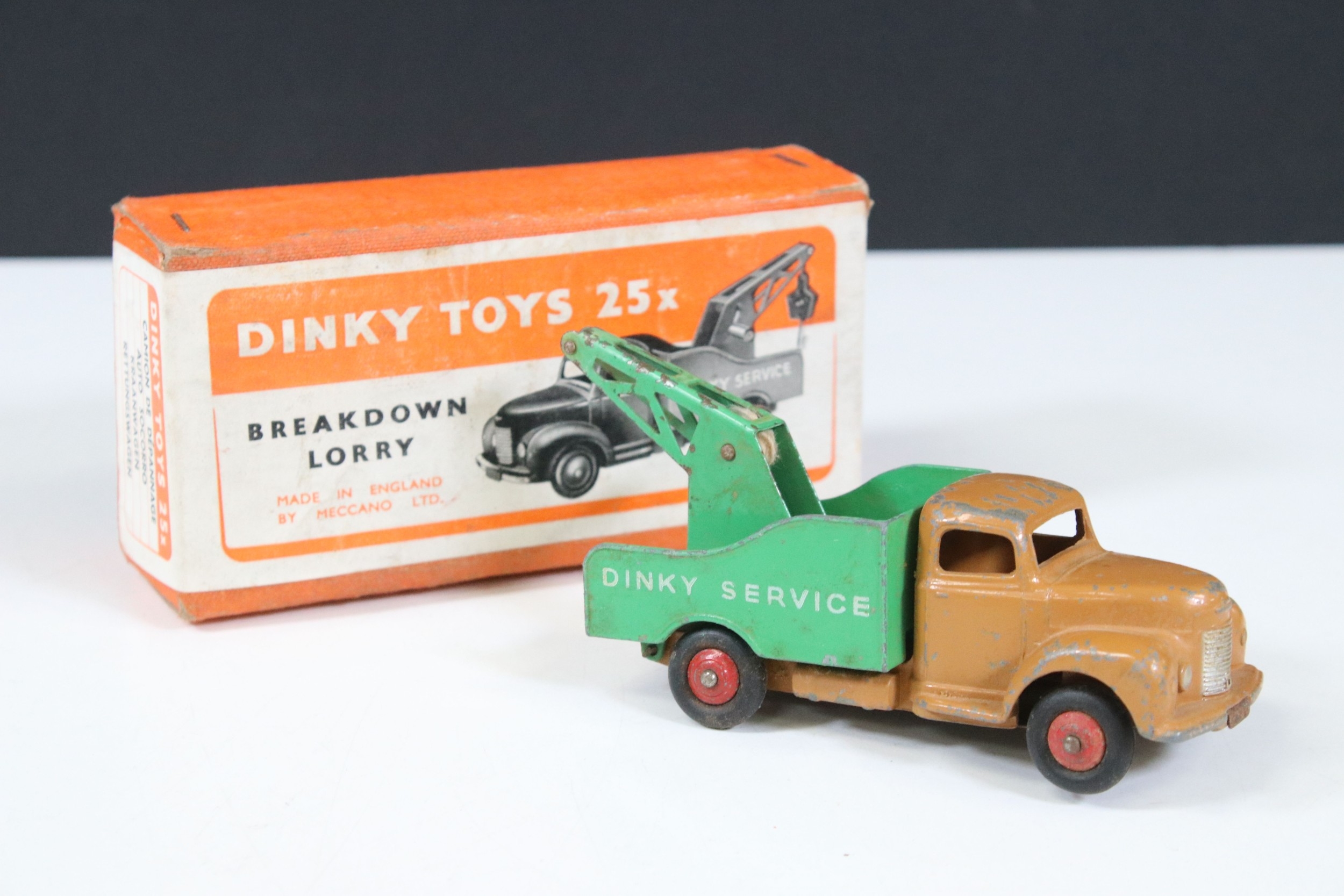 Three boxed Corgi and Dinky diecast models to include Corgi Major 1104 Carrimore Detachable Axle Machinery Carrier with Corgi Model Club leaflet, Dinky 945 AEC Fuel Tanker ESSO (One end flap broken) and Dinky 25X Breakdown Lorry, diecast varies in condition from playworn to vg, boxes showing signs of storage and edge wear and light grubbiness