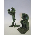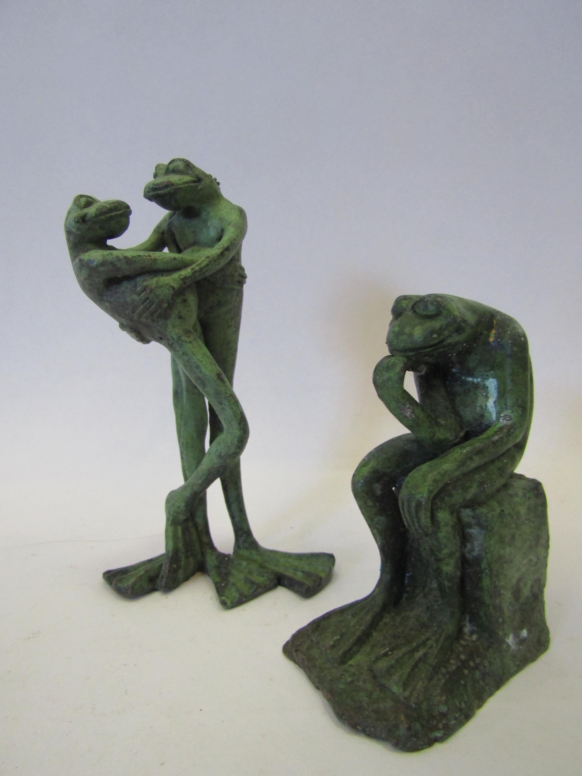 Two verdigris bronze frog figures by David Meredith, 9cm and 12cm tall