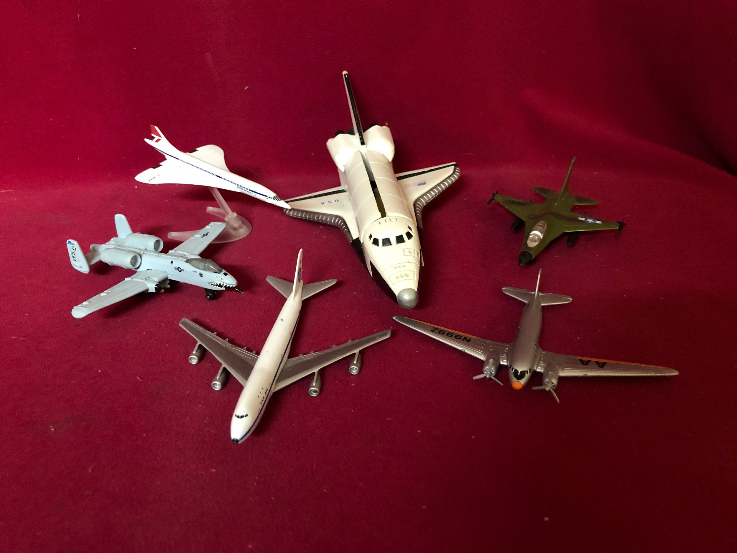 Selection of die cast planes including a Corgi Pan AM N753PA, Concorde, a DC3 AA N999Z, a Matchbox Thunderbolt, and a ERTL SPace Shuttle