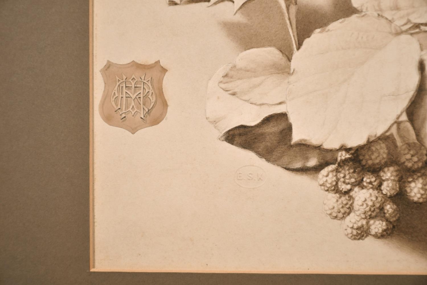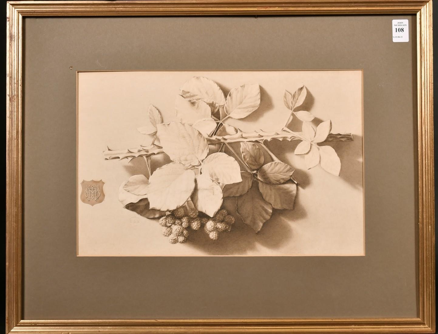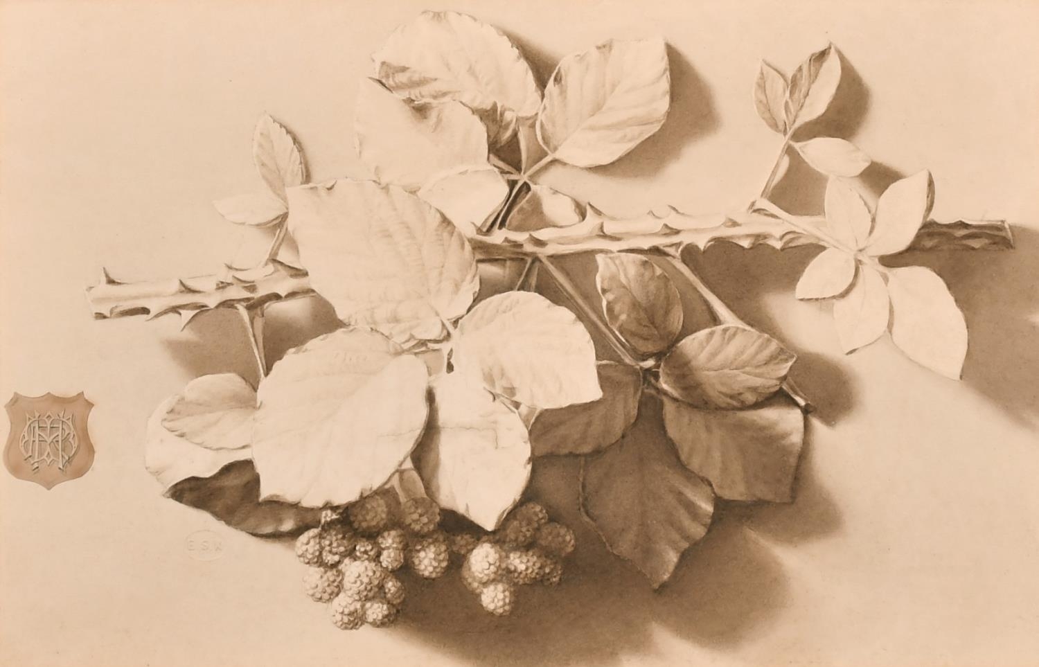 Henry Robert Witherspoon, An ink and watercolour study of a spray of blackberries, watercolour, bearing monogram and with a blind stamp, 10" x 15".