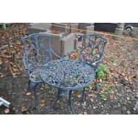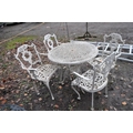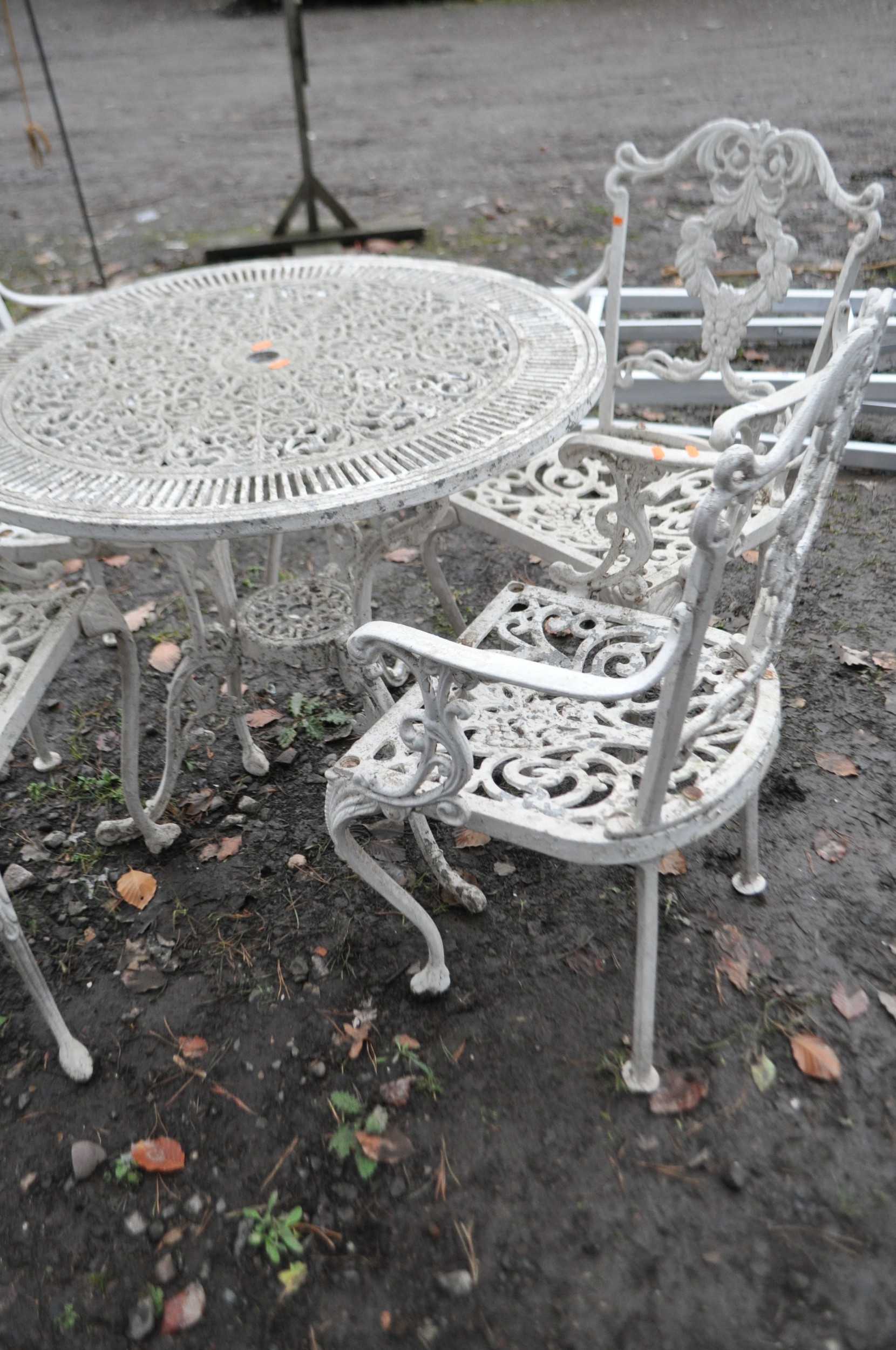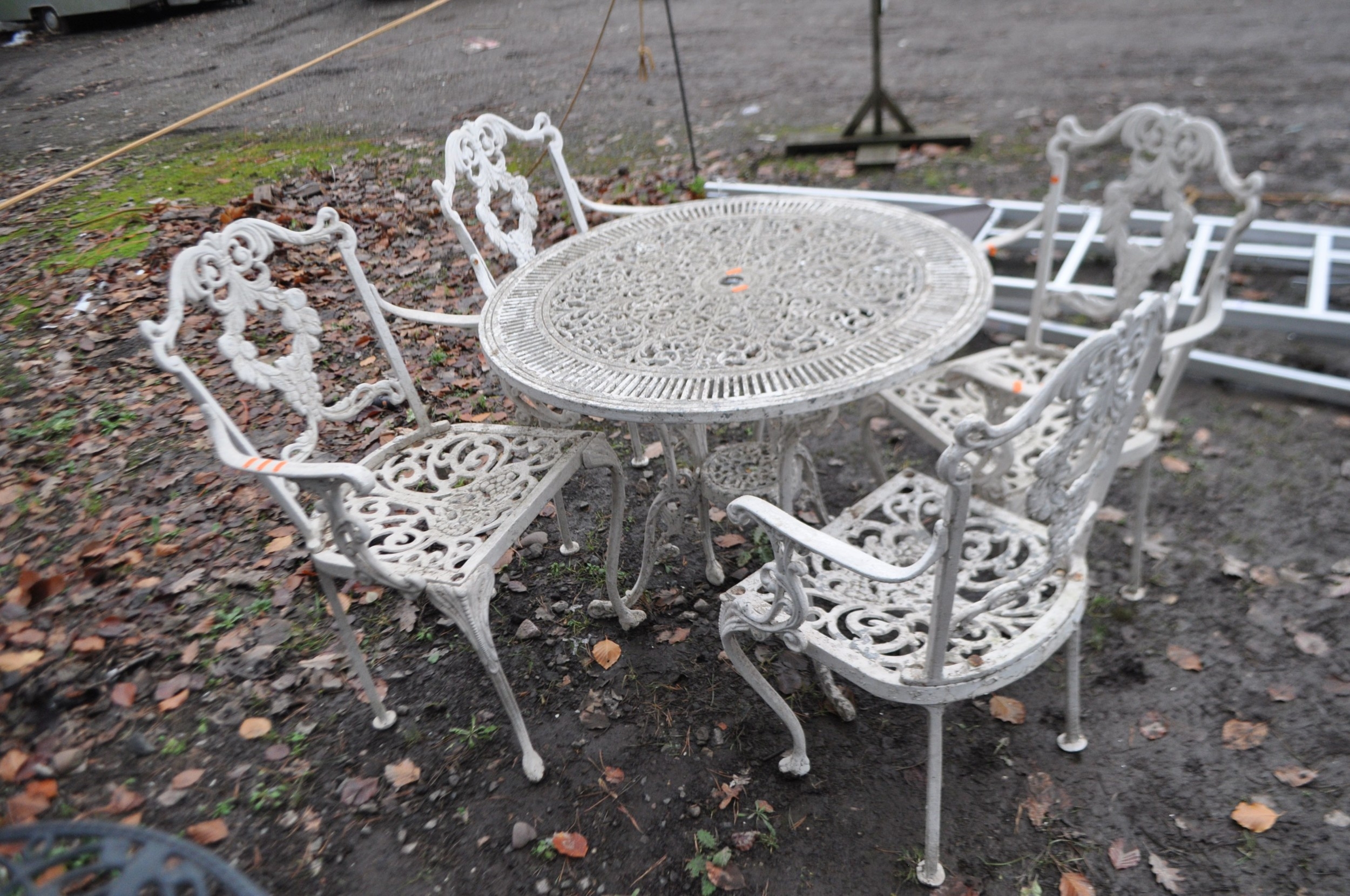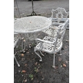 A CAST ALUMINIUM GARDEN TABLE AND FOUR MATCHING CHAIRS table diameter 80cm Condition Report; no obvious damage (5)