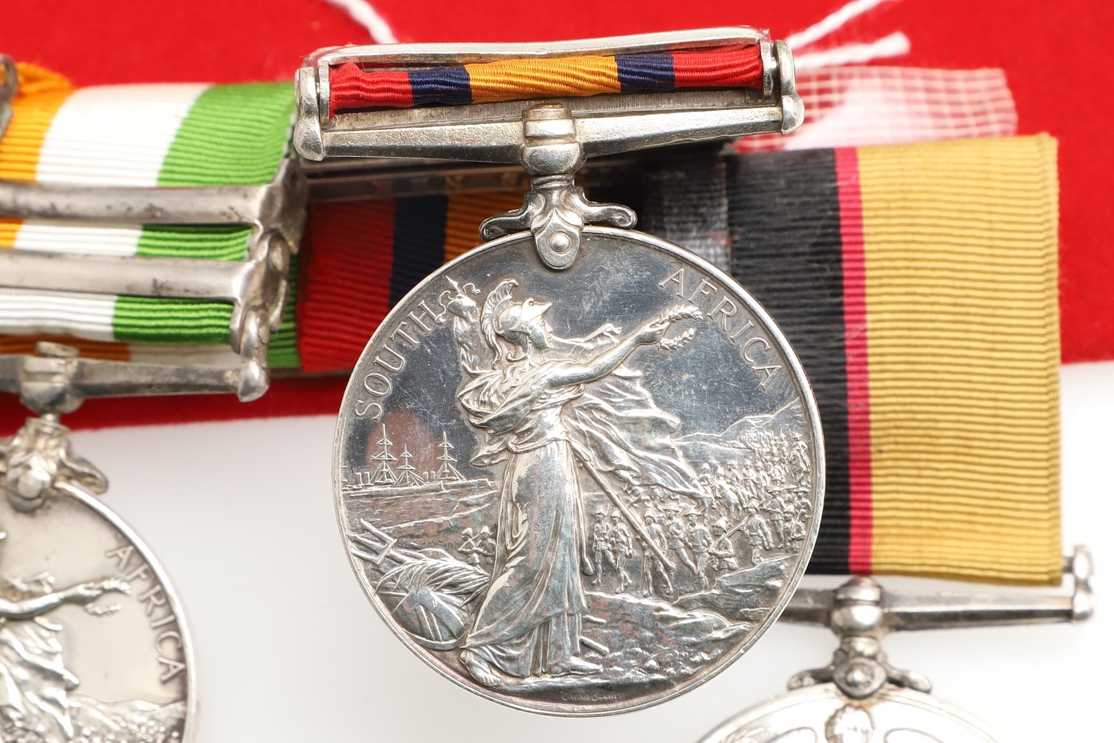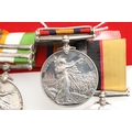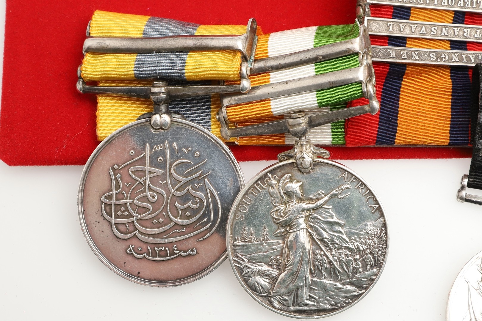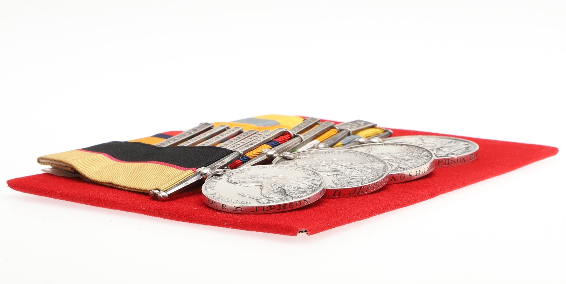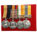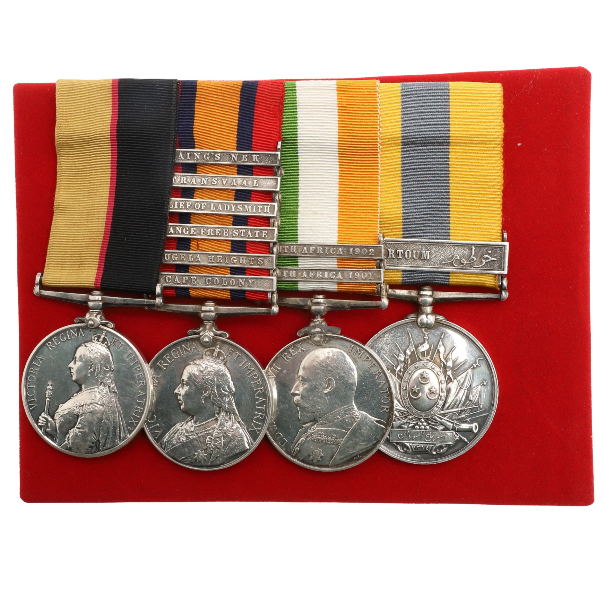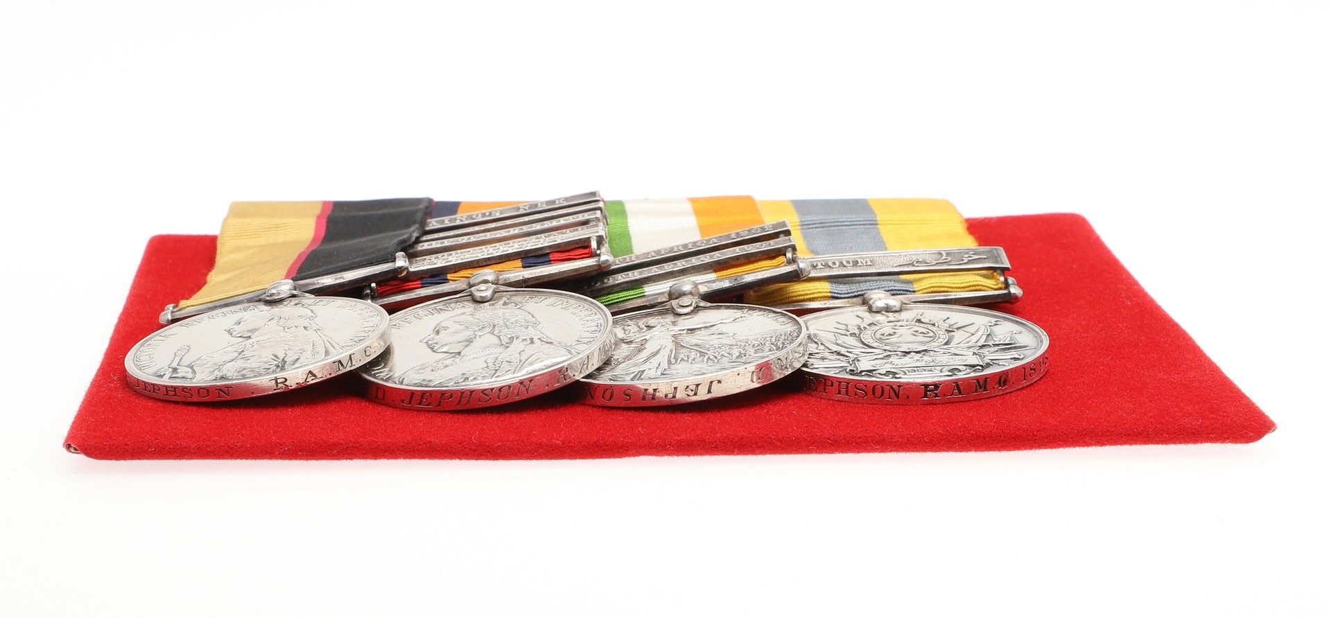 A SUDAN AND BOER WAR GROUP OF FOUR TO THE ROYAL ARMY MEDICVAL CORPS. A group of four comprising Queen's Sudan medal named to Lt RDF. Jephson R.A.M.C., Queen's South Africa medal with Cape Colony, Tugela Heights, Orange Free State, Relief of Ladysmith, Transvaal and Laing's Nek clasps to Capt R.D. Jephson R.A.M.C. King's South Africa medal with South Africa 1901 and 1902 clasps, similarly named and Khedive's Sudan 1896-1908 medal with Khartoum clasp to Lieut Jephson RAMC 1898. Mounted on new ribbons for display. Robert Dalkeith Jephson was born at Kingston, Dublin on the 19th July 1891. He was commissioned on the 28th July 1897 serving on the Nile in Sudan the following year. During the Boer War he served with the 9th Field Hospital. An obituary in the Army and Navy Gazette on the 13th February 1904 reported his death. "Capt. Robert Dalkeith Jephson, R.A.M.C., dies at Rawal Pindi on the 9th inst., from the effects of an accident. He went out shooting in the early morning accompanied by his two dogs, and later on in the day was found in the park (which is in the cantonments) shot through the head, his gun lying near by, and expired before he could be taken to hospital. ... He entered the service in 1897, and was promoted to Captain in July 1900. He served in the Nile Expedition, 1898, and was present at the battle of Khartoum .." At the time of his death he left an estate valued at £1,8668 6s 11d. With extensive copied research. Provenance Spink, London.