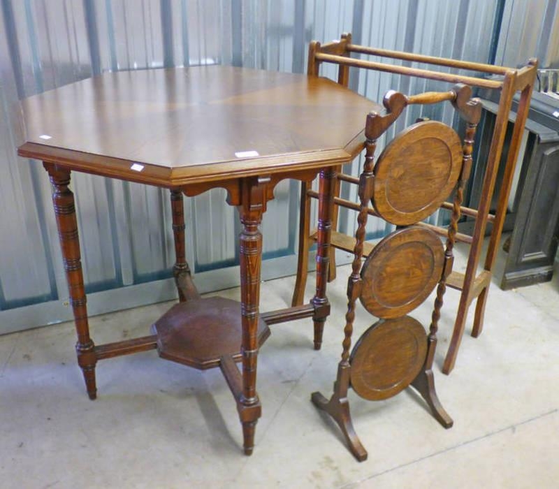 PINE OCTAGONAL TABLE ON TURNED SUPPORTS. WIDTH 80 CM, OAK 3 TIER CAKE STAND WITH BARLEY TWIST AND OAK TOWEL RAIL