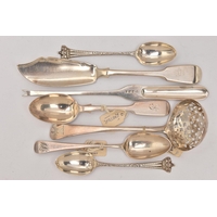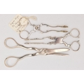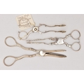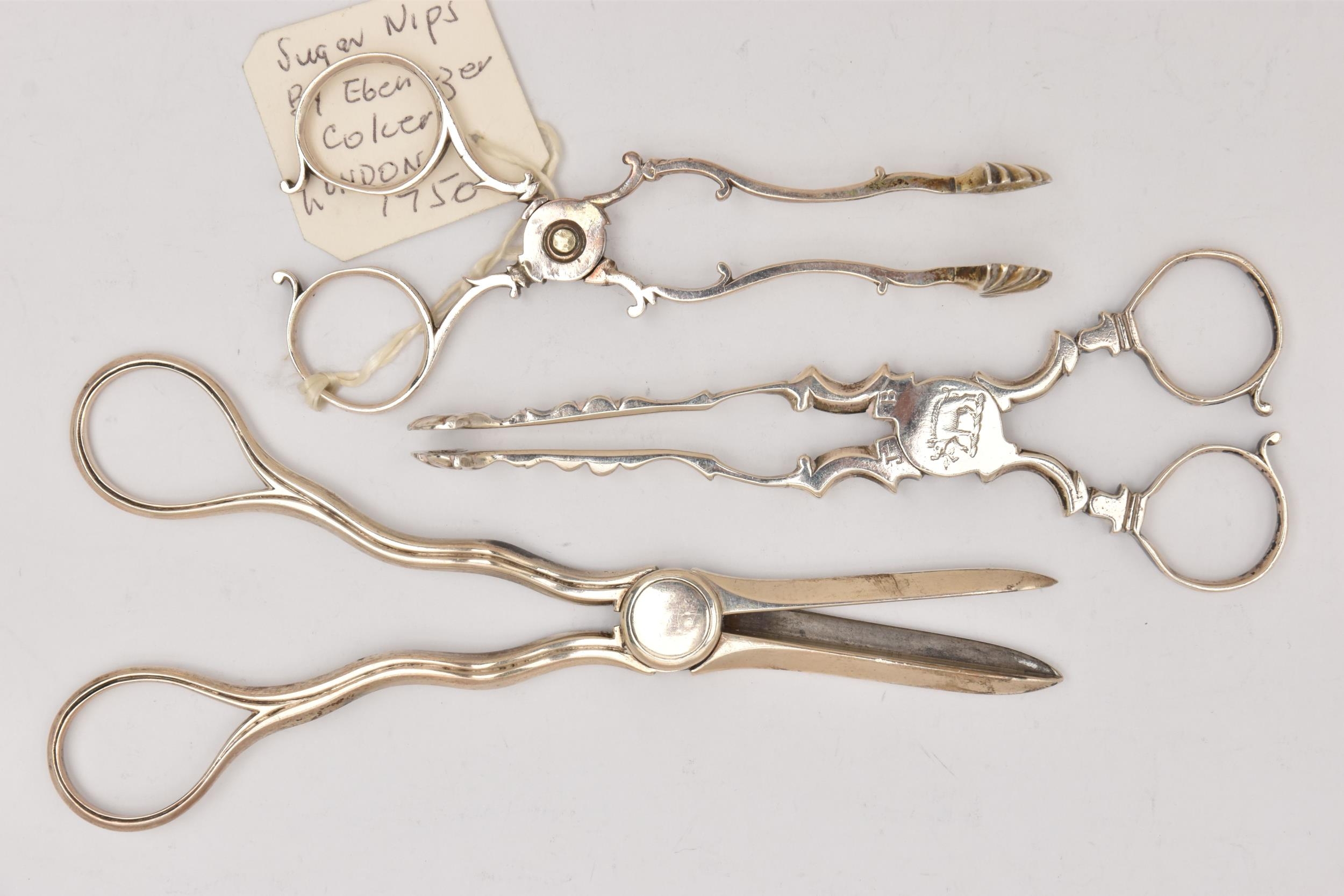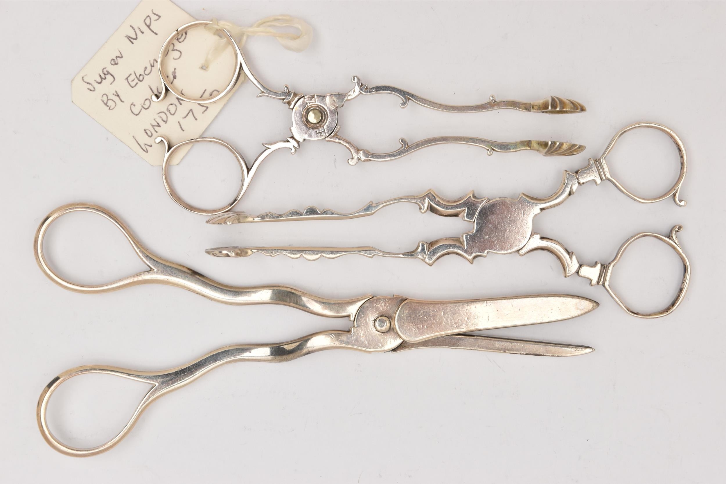 TWO PAIRS OF SUGAR TONGS AND A PAIR OF GRAPE SCISSORS, the first with shell shape nibs, engraved pig and initials 'JB', makers mark 'Ebenezer Coker' London 1750, the other with shell shape nibs, engraved initial 'MT', makers mark 'WD', together with a pair of wavy thread pattern grape scissors, hallmarked 'John Gilbert' Birmingham 1884, approximate gross weight 3.97 ozt, 123.7 grams (condition report: general light wear)