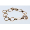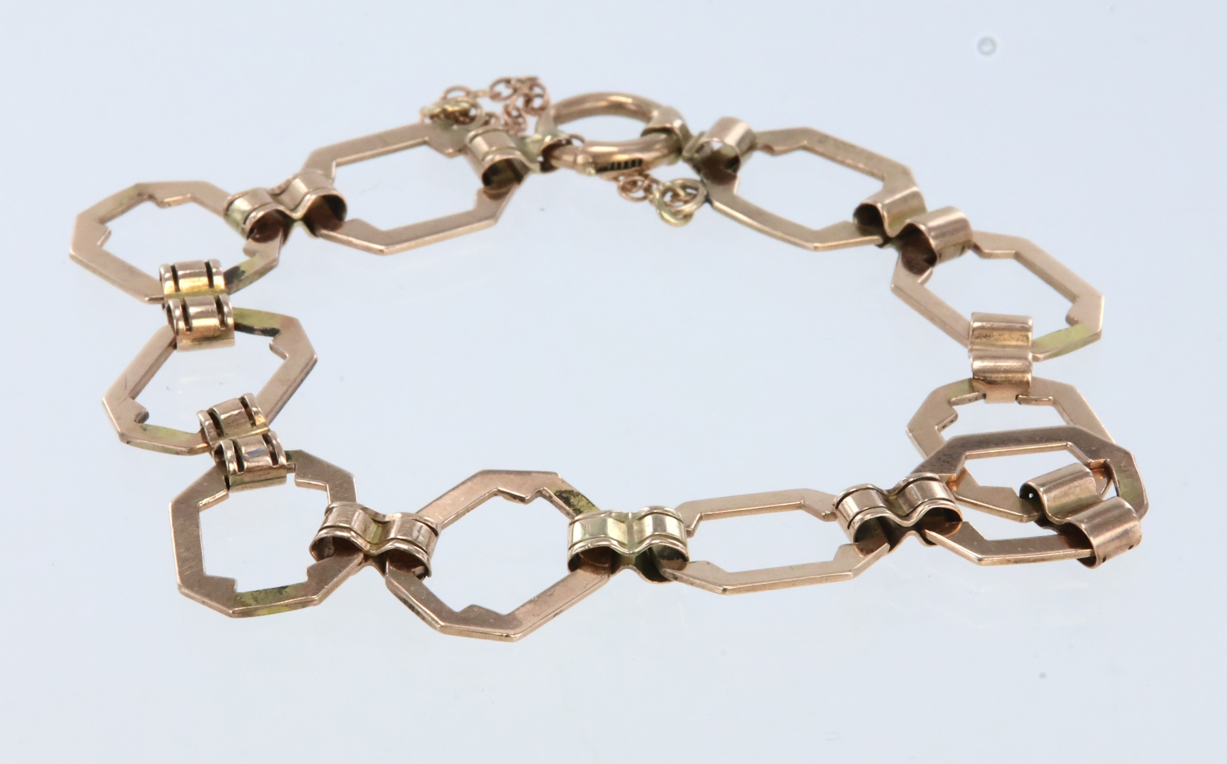 Rose metal (stamped and tests 9ct) bracelet with oversize bolt ring clasp and safety chain, length 17cm, weight 8.6g