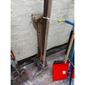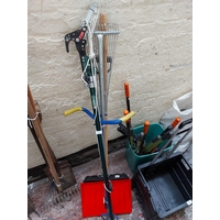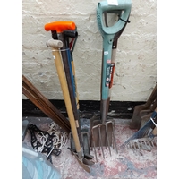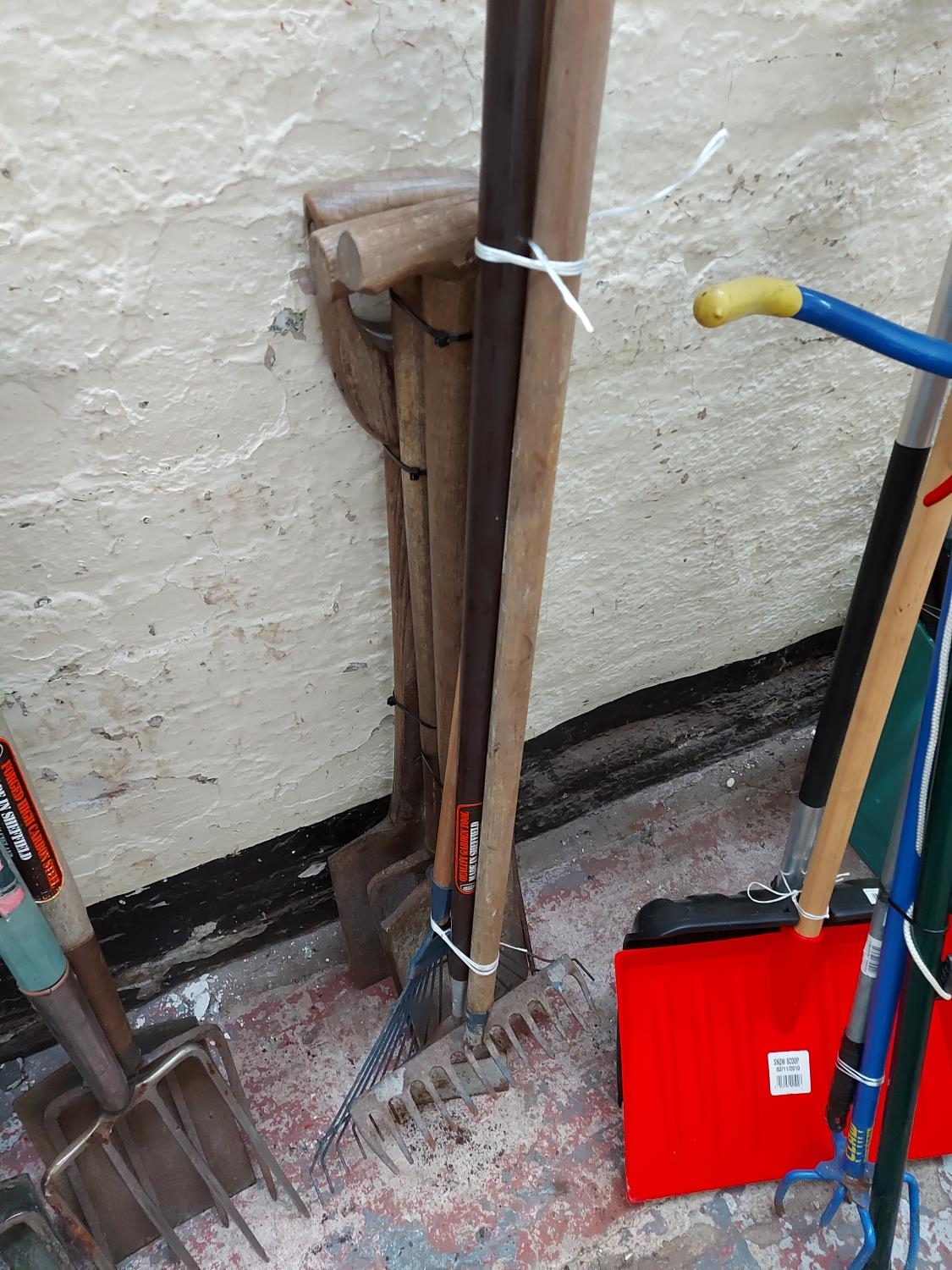 Six gardening hand tools to include wooden shafted spade, rakes, hoe etc.