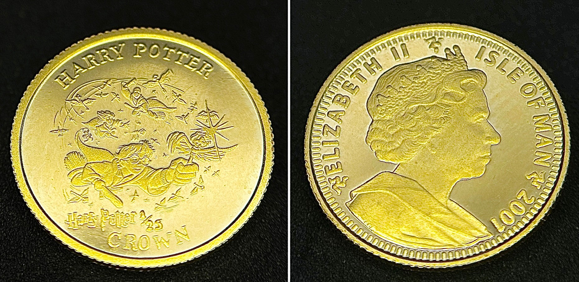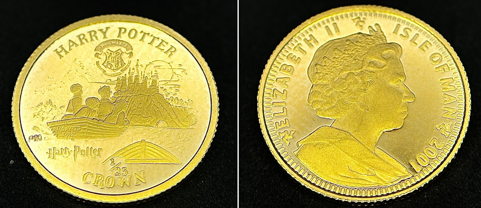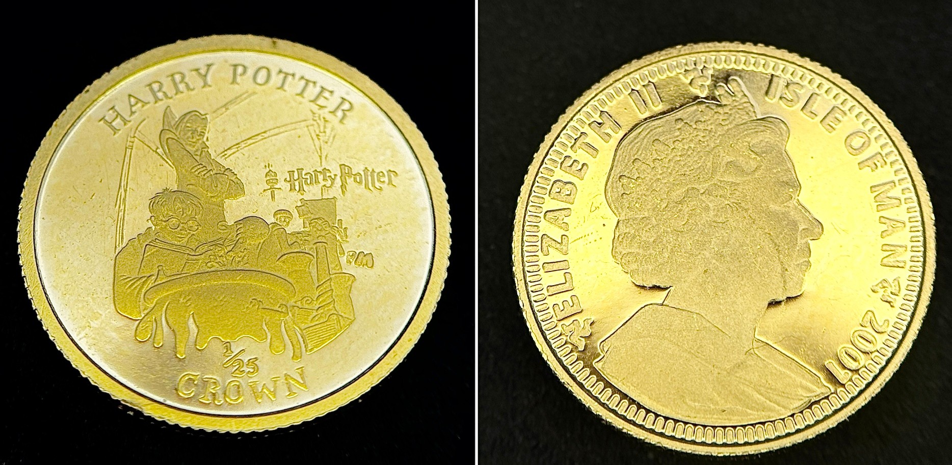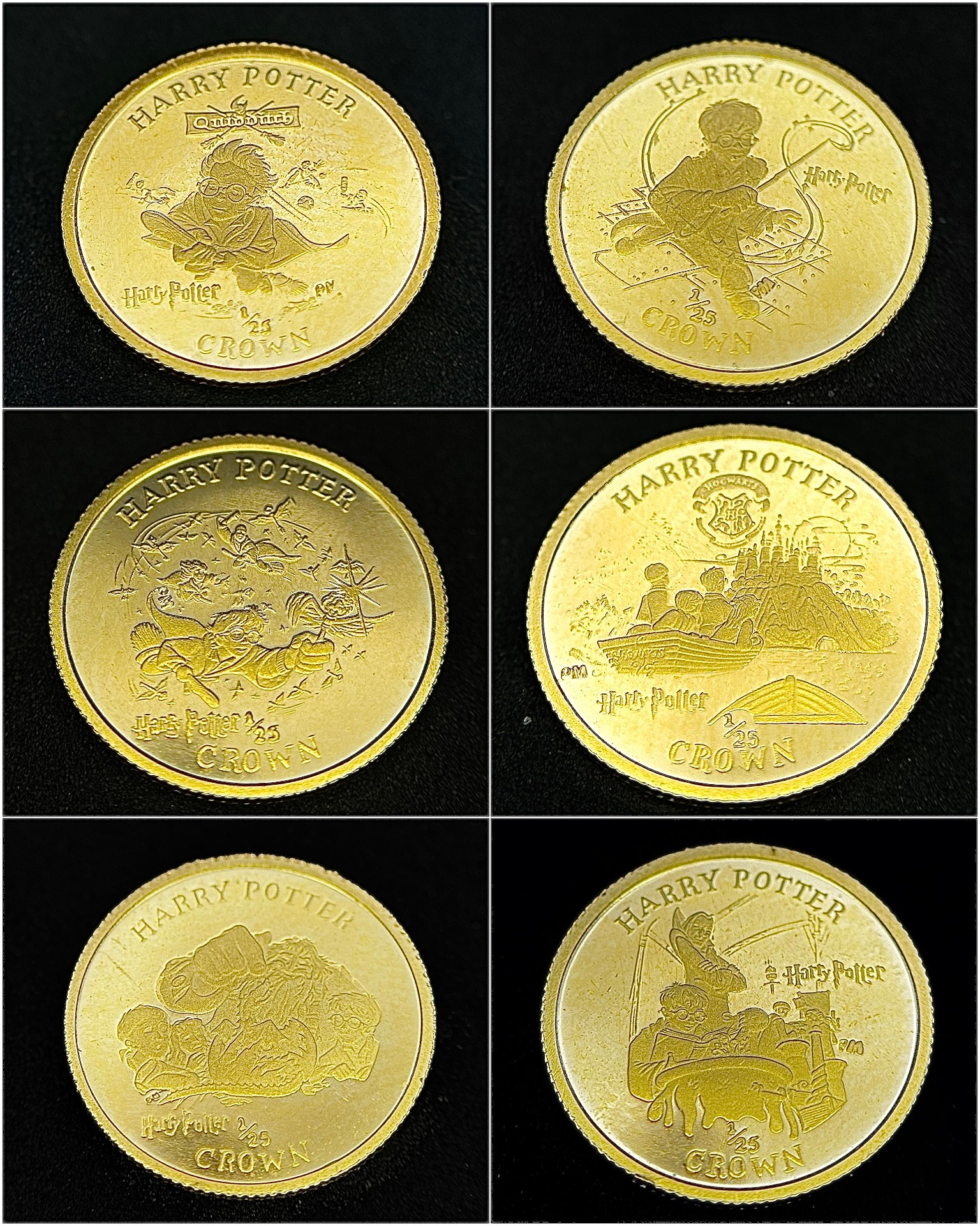 A SET OF 6 HARRY POTTER COMMEMORATIVE 24K GOLD, 1/25 PROOF CROWN COINS - ISLE OF MAN. QUEEN ELIZABETH II 2001 BY POBJOY MINT LIMITED. TOTAL WEIGHT 7.7G. C2025