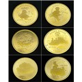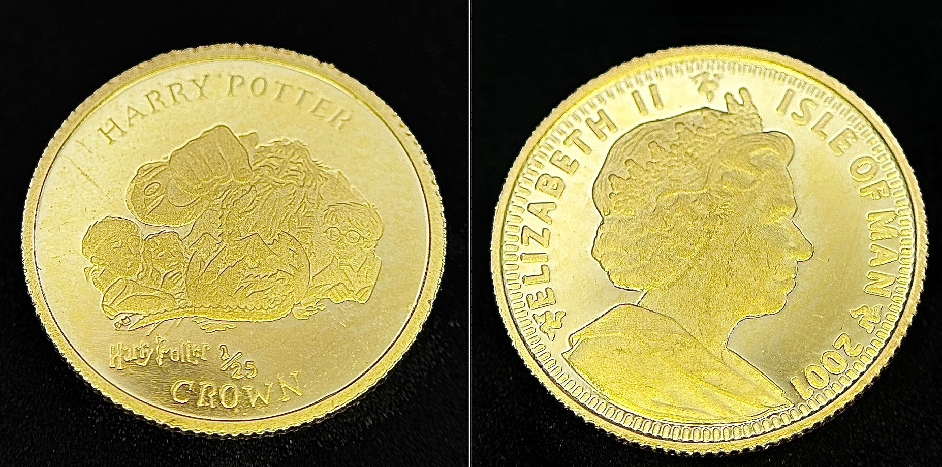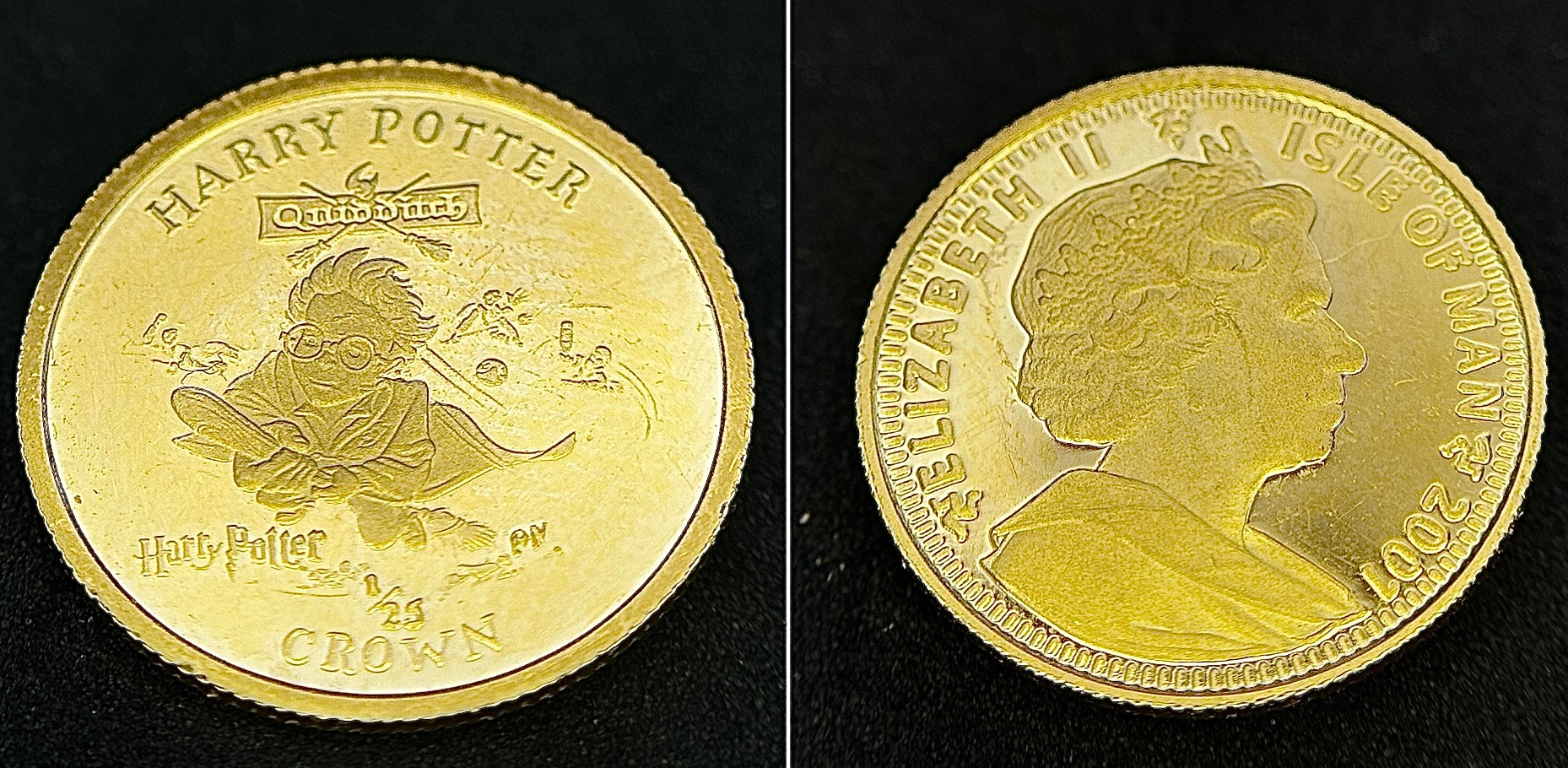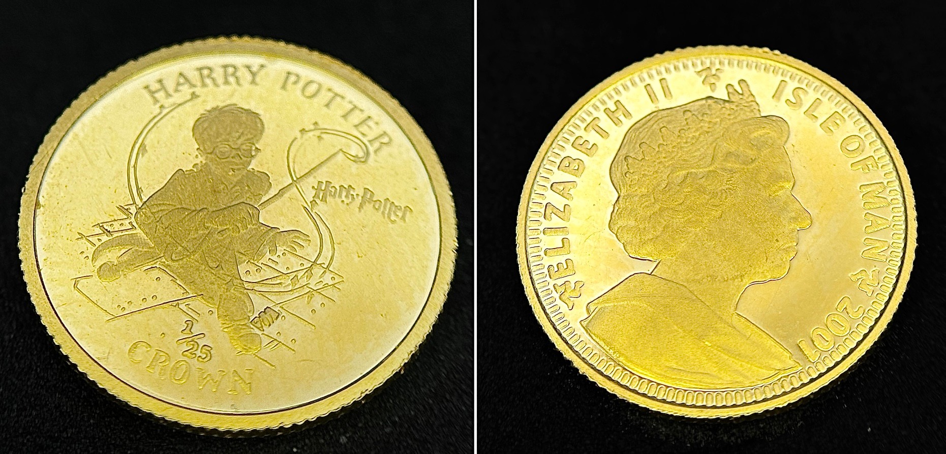 A SET OF 6 HARRY POTTER COMMEMORATIVE 24K GOLD, 1/25 PROOF CROWN COINS - ISLE OF MAN. QUEEN ELIZABETH II 2001 BY POBJOY MINT LIMITED. TOTAL WEIGHT 7.7G. C2025