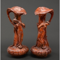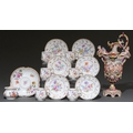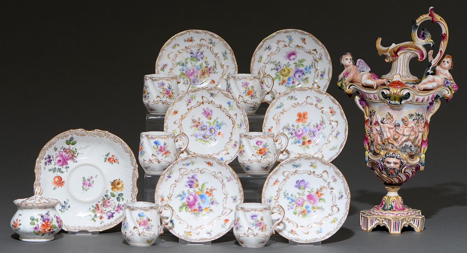 A German porcelain ewer, early 20th c, moulded in relief and applied with bacchanalian figures in Capo di Monte style, 30cm h, underglaze blue crown over N, a German porcelain inkwell, cover and stand, c1900, painted with loose bouquets and gilt, stand 14cm diam and a set of six similar German floral painted coffee cups and saucers