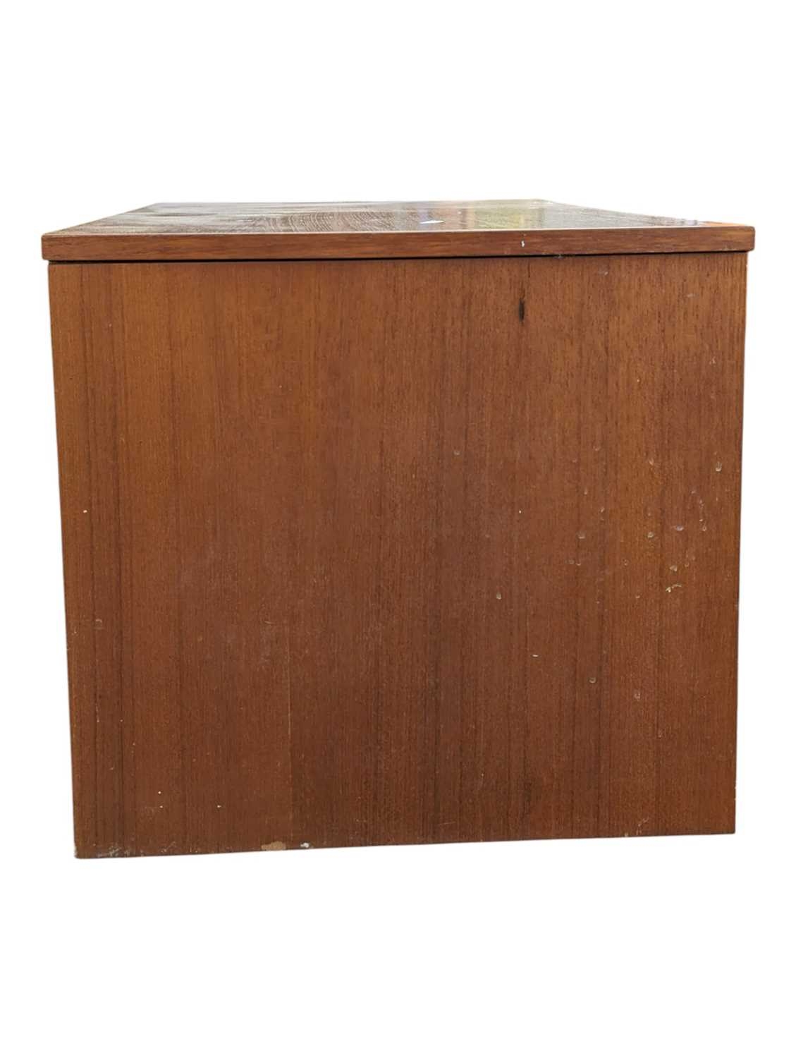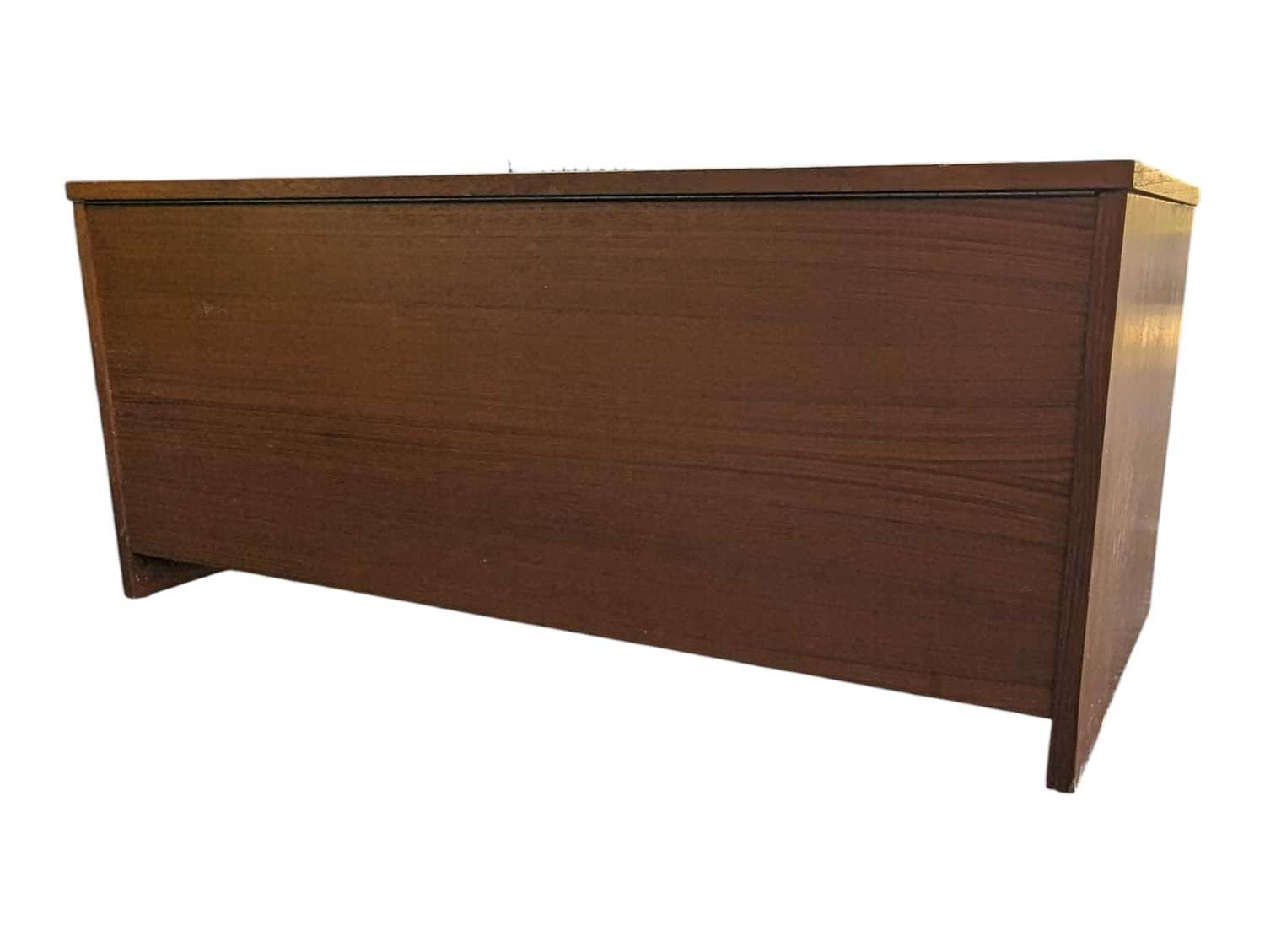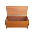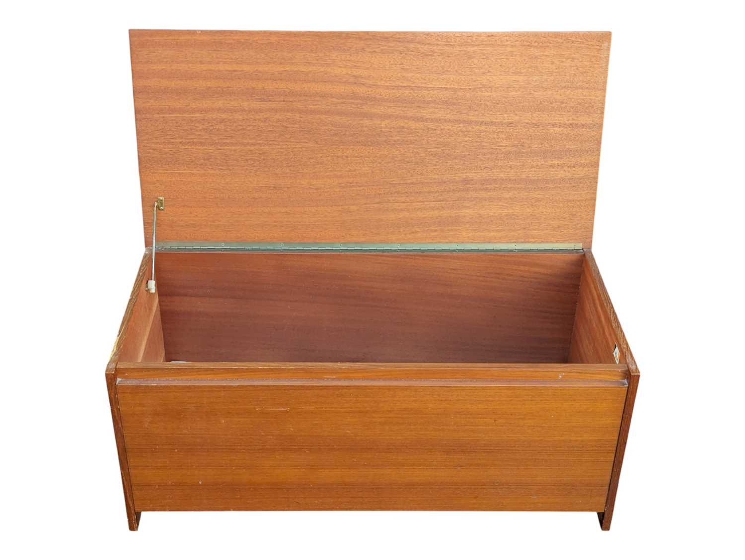 Avalon Furniture- A vintage 20th century teak blanket box chest. Rectangular form with spacious interior, hinged lid with maker's label inside. Measures approx: 40x92x43cm