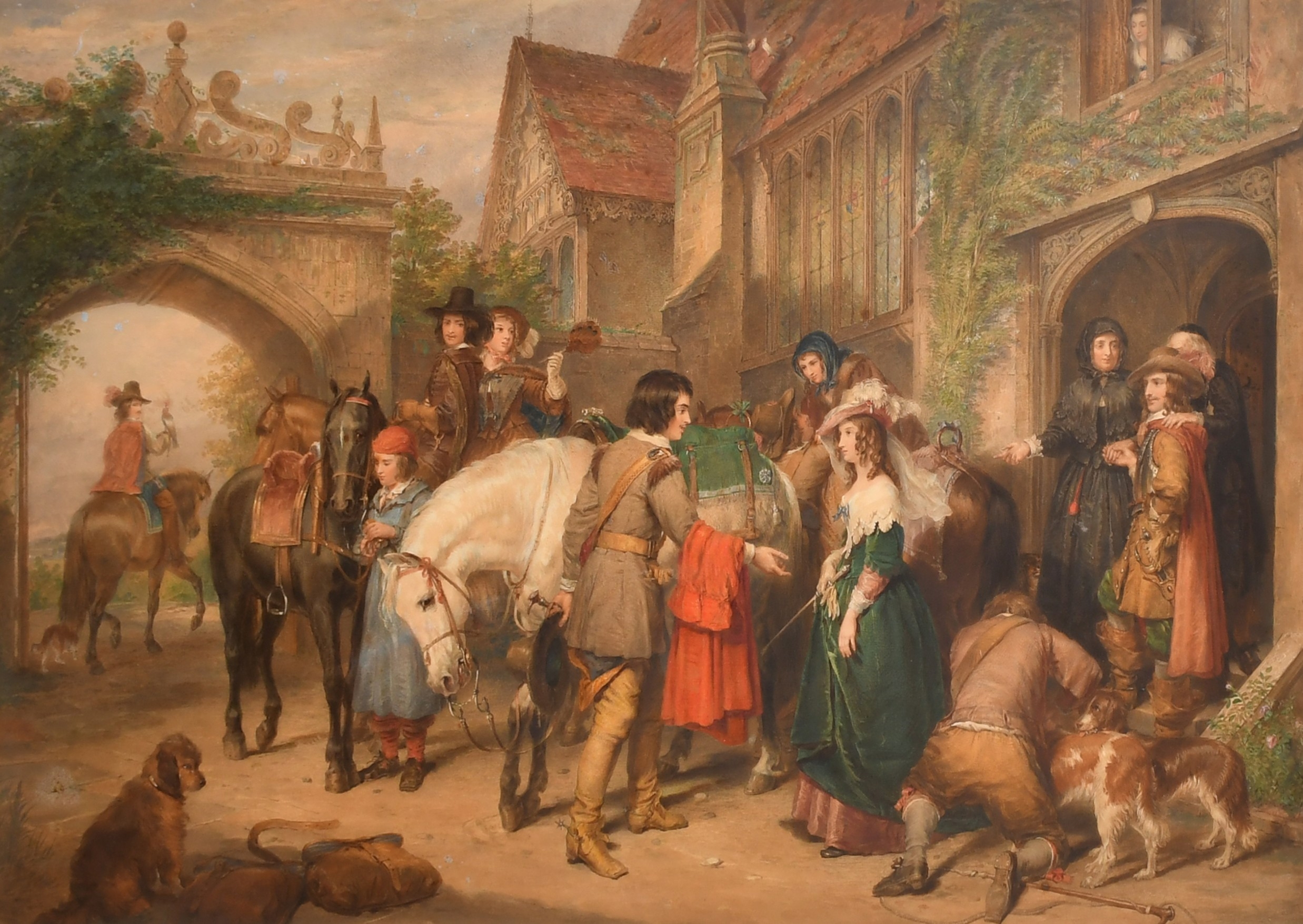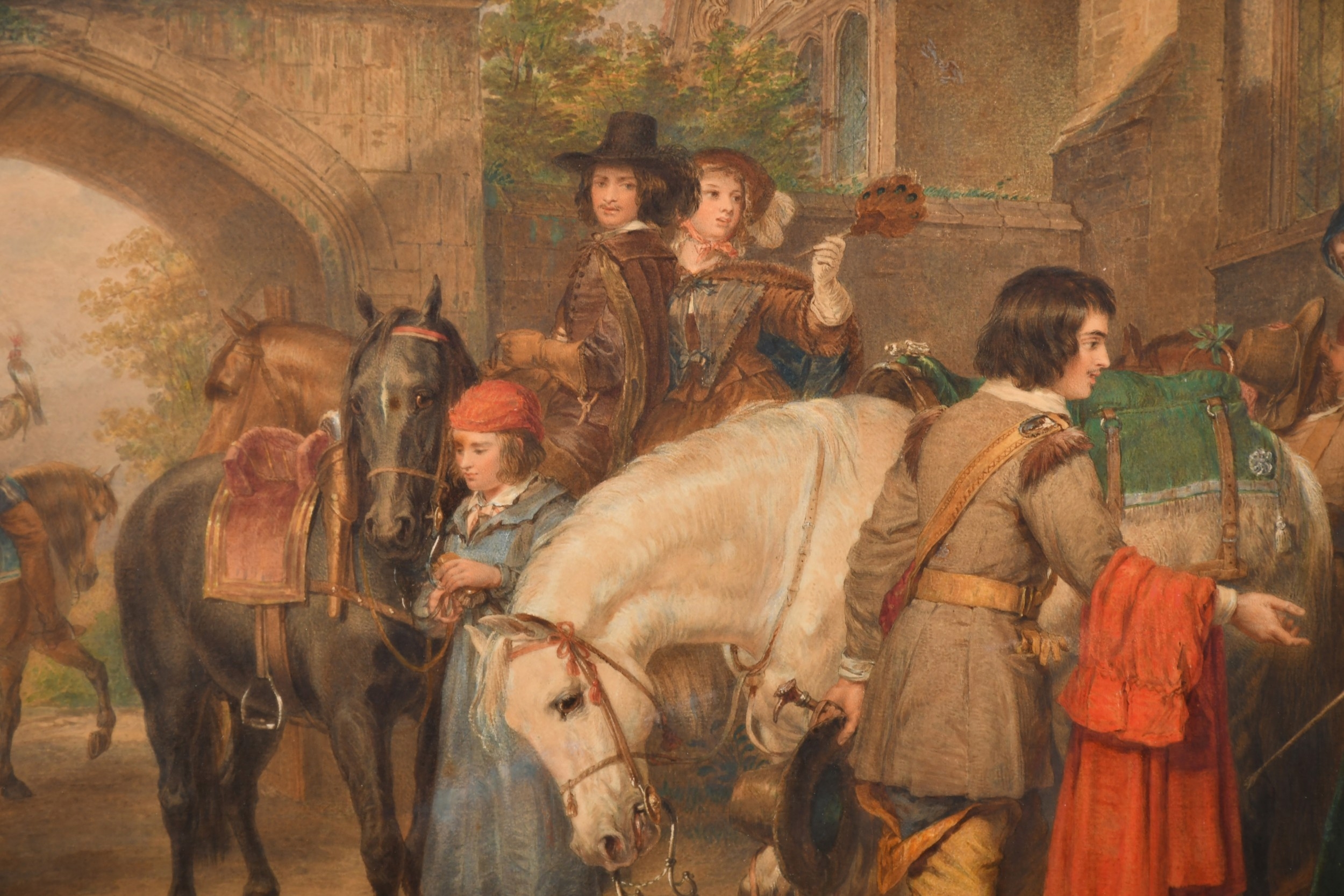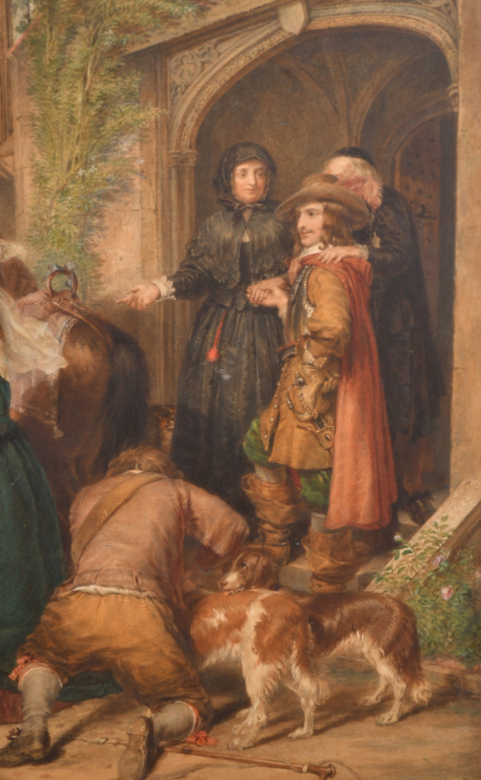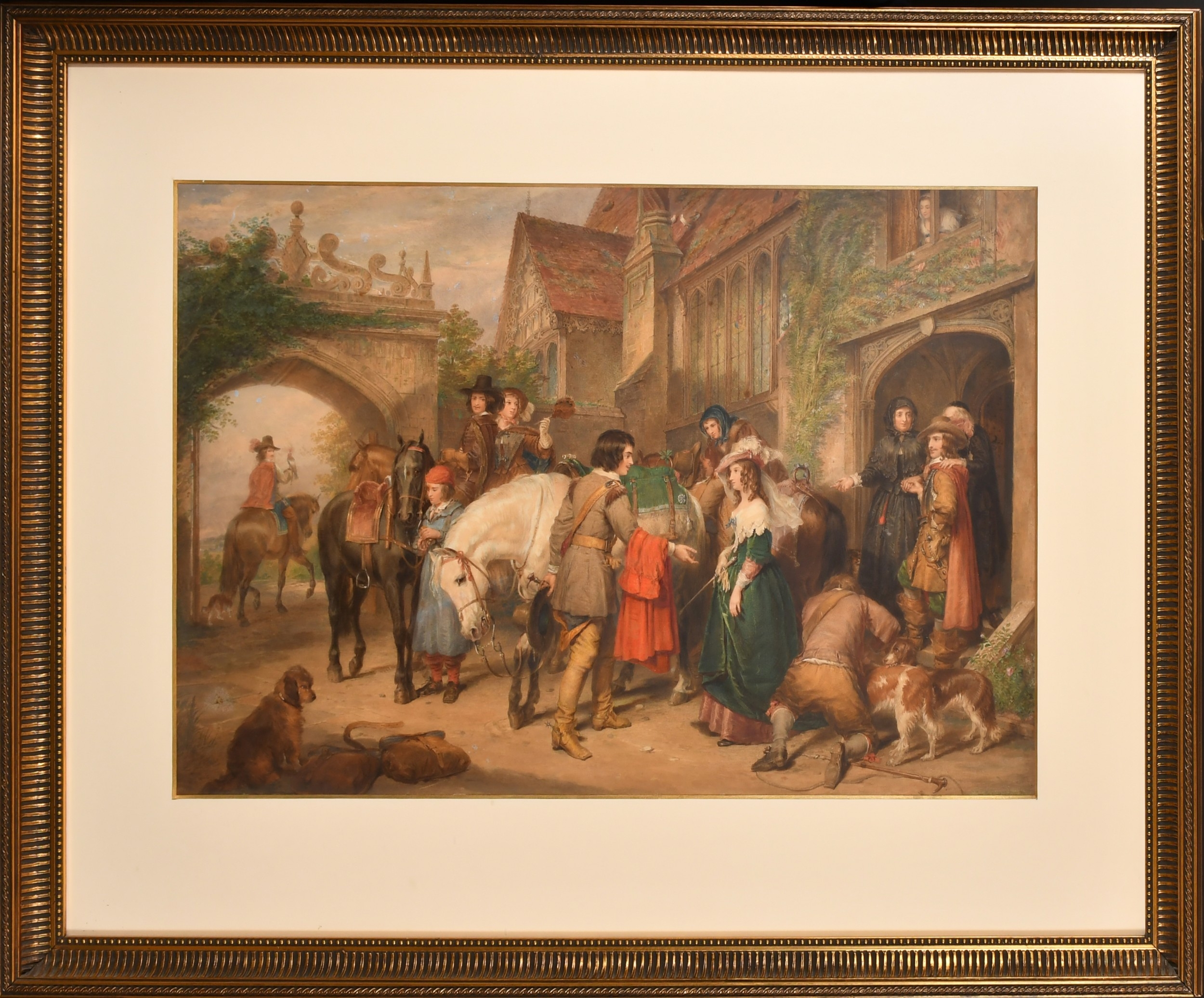 Charles Landseer (1799-1879) British. "The Departure of Charles II from Bentley in Staffordshire, The House of Colonel Lane", Watercolour, Signed, 20" x 30" (50.8 x 76.2cm). Exhibited: Royal Academy, 1842, No.278. Notes (verso): Miss Lane, having obtained a Parliamentary pass to visit her kinswoman, Mrs Norton, who lived near Bristol, it was arranged that the King personating a neighbour's son, should ride double before the young lady. The remainder of the party consisted of her cousin, a Mr Lascelles and his wife, as well as Mr and Mrs Petre. Old Mr and Mrs Lane descended to the courtyard to witness their daughter's departure; Lord Wilmot, proceeding the party with a hawk on his fist and spaniel by his side passed as a stranger in pursuit of his sport- Clarendon