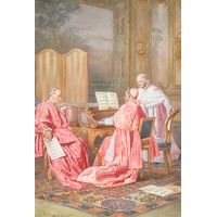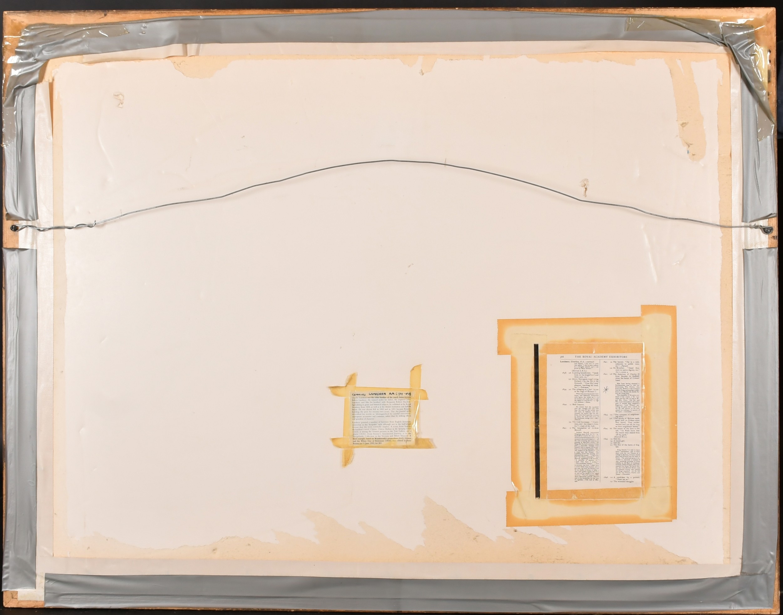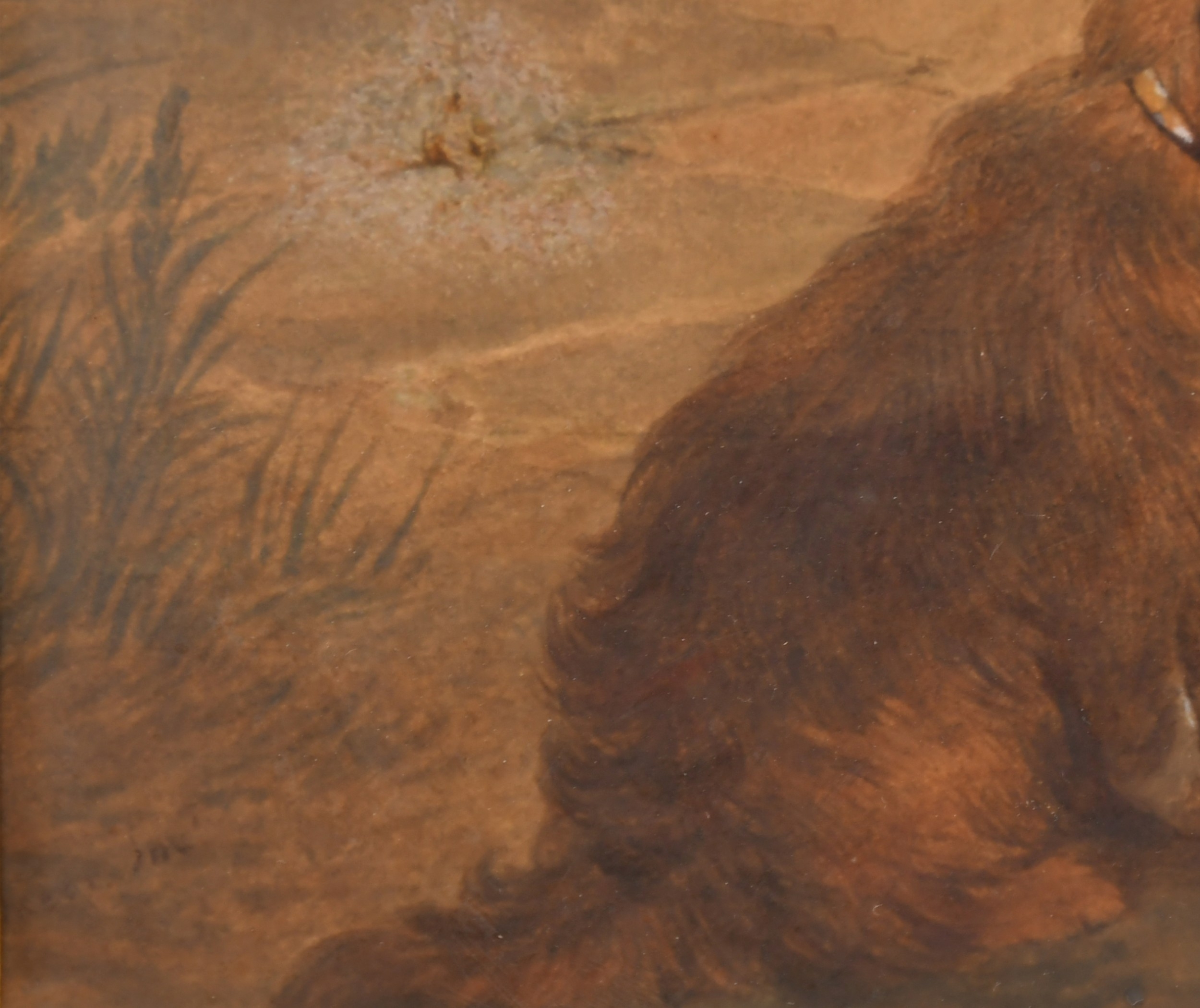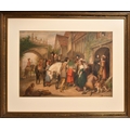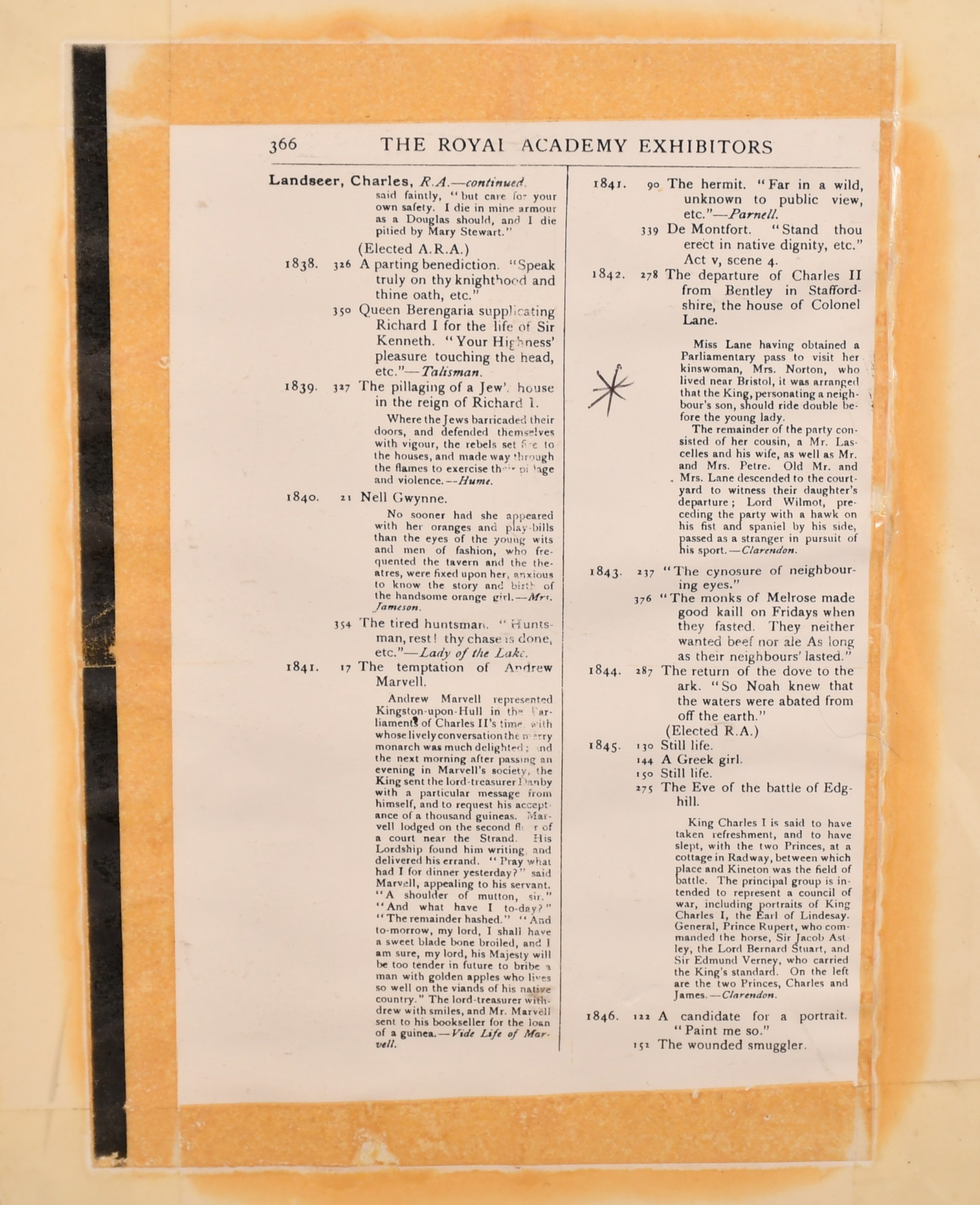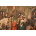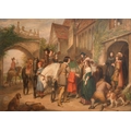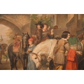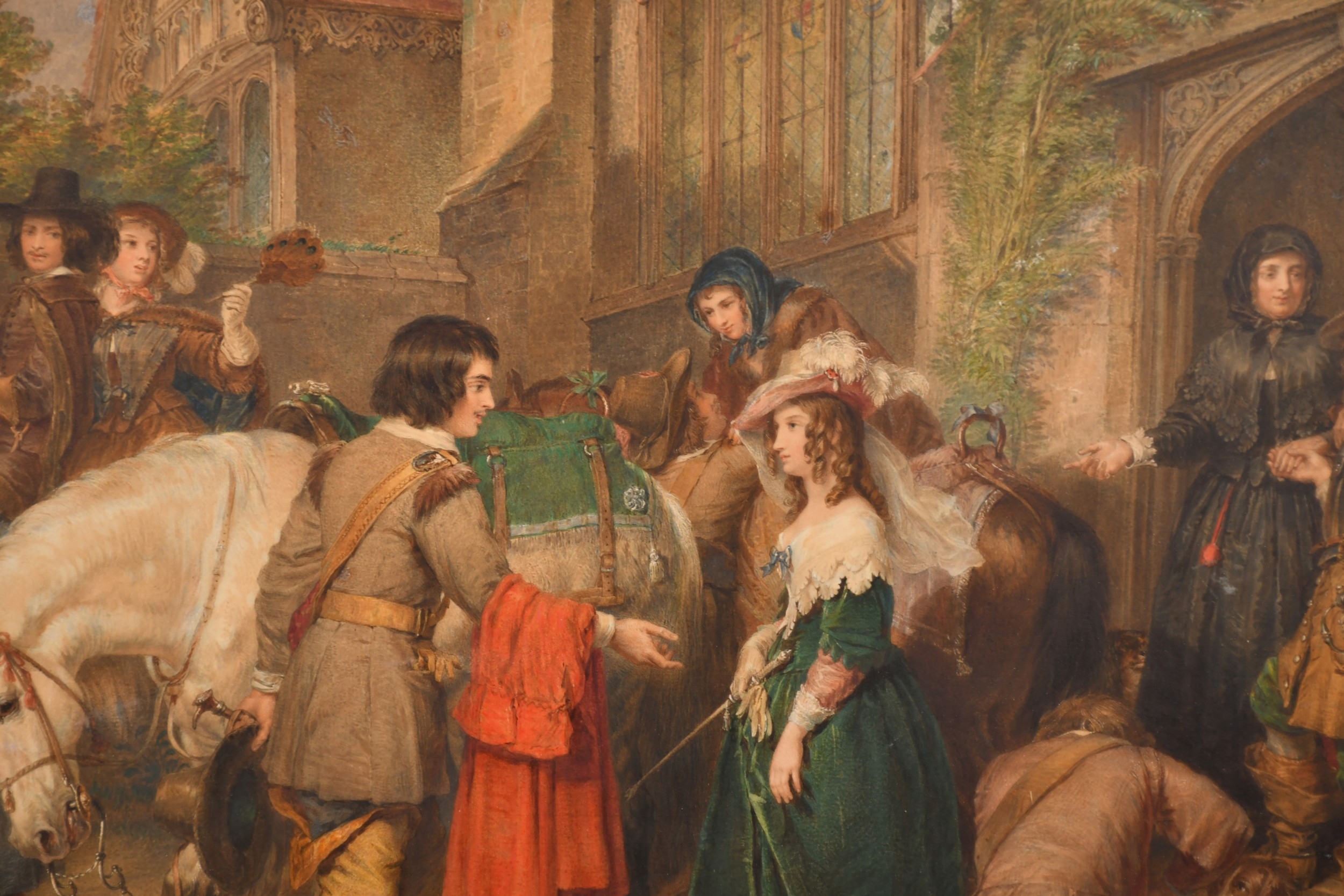 Charles Landseer (1799-1879) British. "The Departure of Charles II from Bentley in Staffordshire, The House of Colonel Lane", Watercolour, Signed, 20" x 30" (50.8 x 76.2cm). Exhibited: Royal Academy, 1842, No.278. Notes (verso): Miss Lane, having obtained a Parliamentary pass to visit her kinswoman, Mrs Norton, who lived near Bristol, it was arranged that the King personating a neighbour's son, should ride double before the young lady. The remainder of the party consisted of her cousin, a Mr Lascelles and his wife, as well as Mr and Mrs Petre. Old Mr and Mrs Lane descended to the courtyard to witness their daughter's departure; Lord Wilmot, proceeding the party with a hawk on his fist and spaniel by his side passed as a stranger in pursuit of his sport- Clarendon