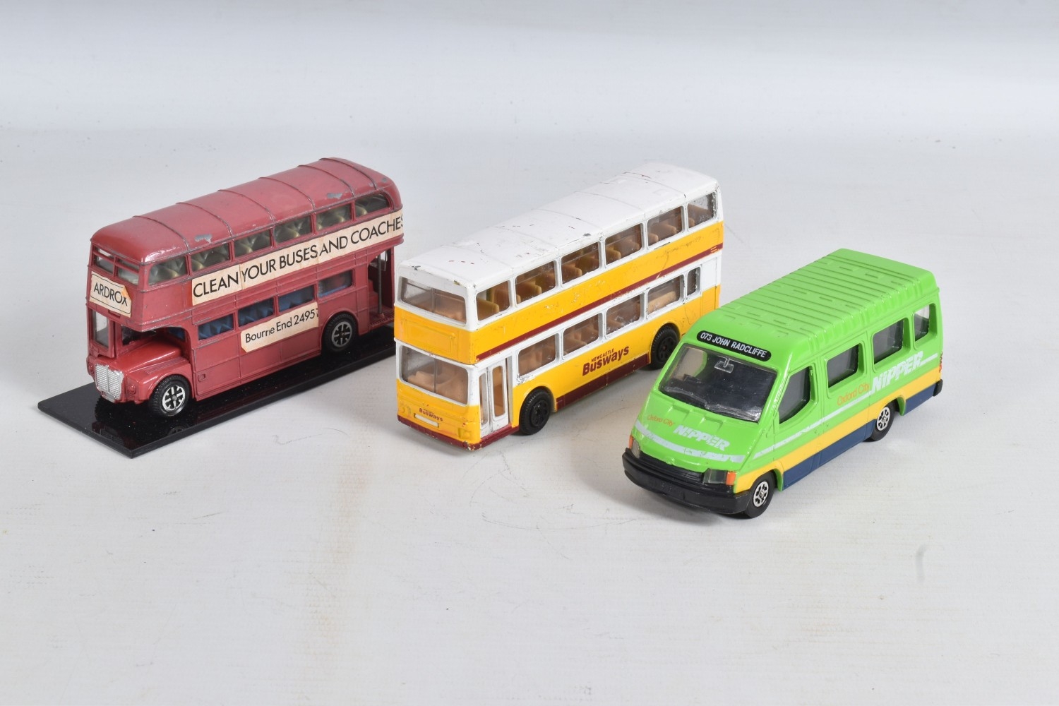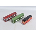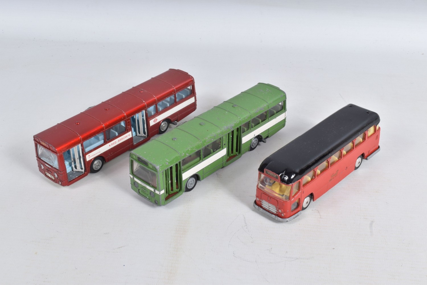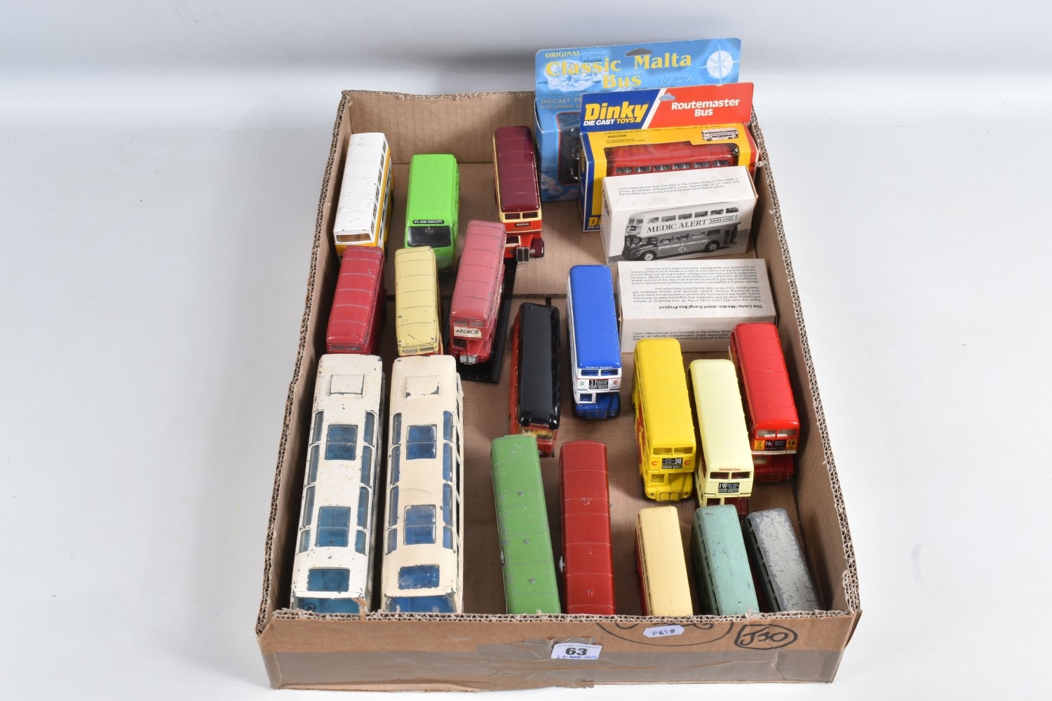 A QUANTITY OF MAINLY UNBOXED CORGI AND DINKY TOYS BUS AND COACH MODELS, to include Corgi B.M.M.O Midland Red CM5T Motorway Coach, No.1120, Corgi Routemasters in Exile - The South set, No.97074, Dinky Toys Double Deck bus, No.29c including two tone green & red and grey examples, 2 x Bedford VAL Duple Vega Major coach, both missing battery box cover, No.952, assorted Dinky & Corgi Routemaster etc., Routemasters in Exile set in good condition, others range from fairly good to poor with paint loss and wear, both Vega Major missing indicator lenses