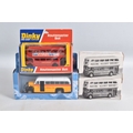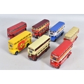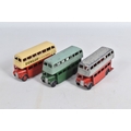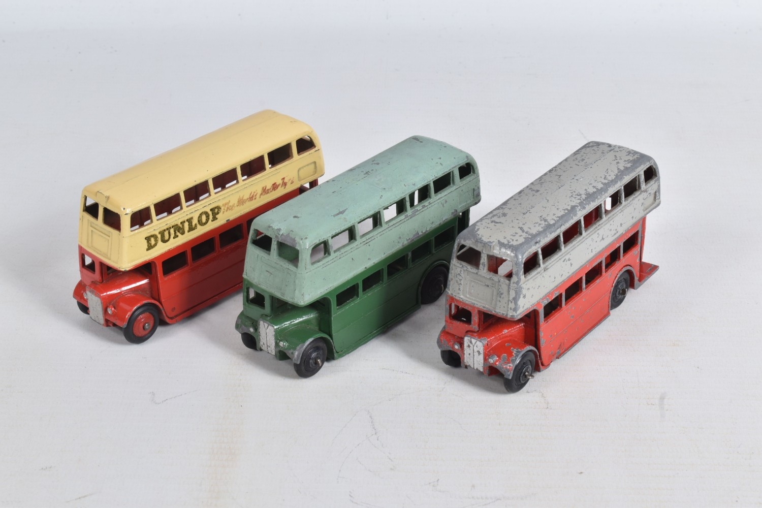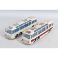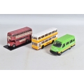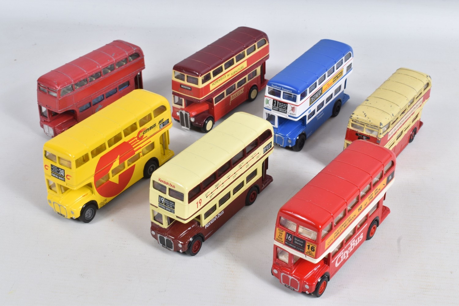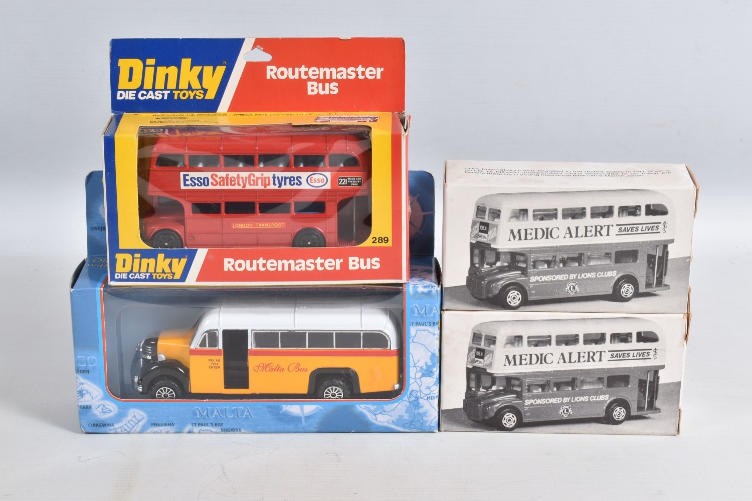 A QUANTITY OF MAINLY UNBOXED CORGI AND DINKY TOYS BUS AND COACH MODELS, to include Corgi B.M.M.O Midland Red CM5T Motorway Coach, No.1120, Corgi Routemasters in Exile - The South set, No.97074, Dinky Toys Double Deck bus, No.29c including two tone green & red and grey examples, 2 x Bedford VAL Duple Vega Major coach, both missing battery box cover, No.952, assorted Dinky & Corgi Routemaster etc., Routemasters in Exile set in good condition, others range from fairly good to poor with paint loss and wear, both Vega Major missing indicator lenses