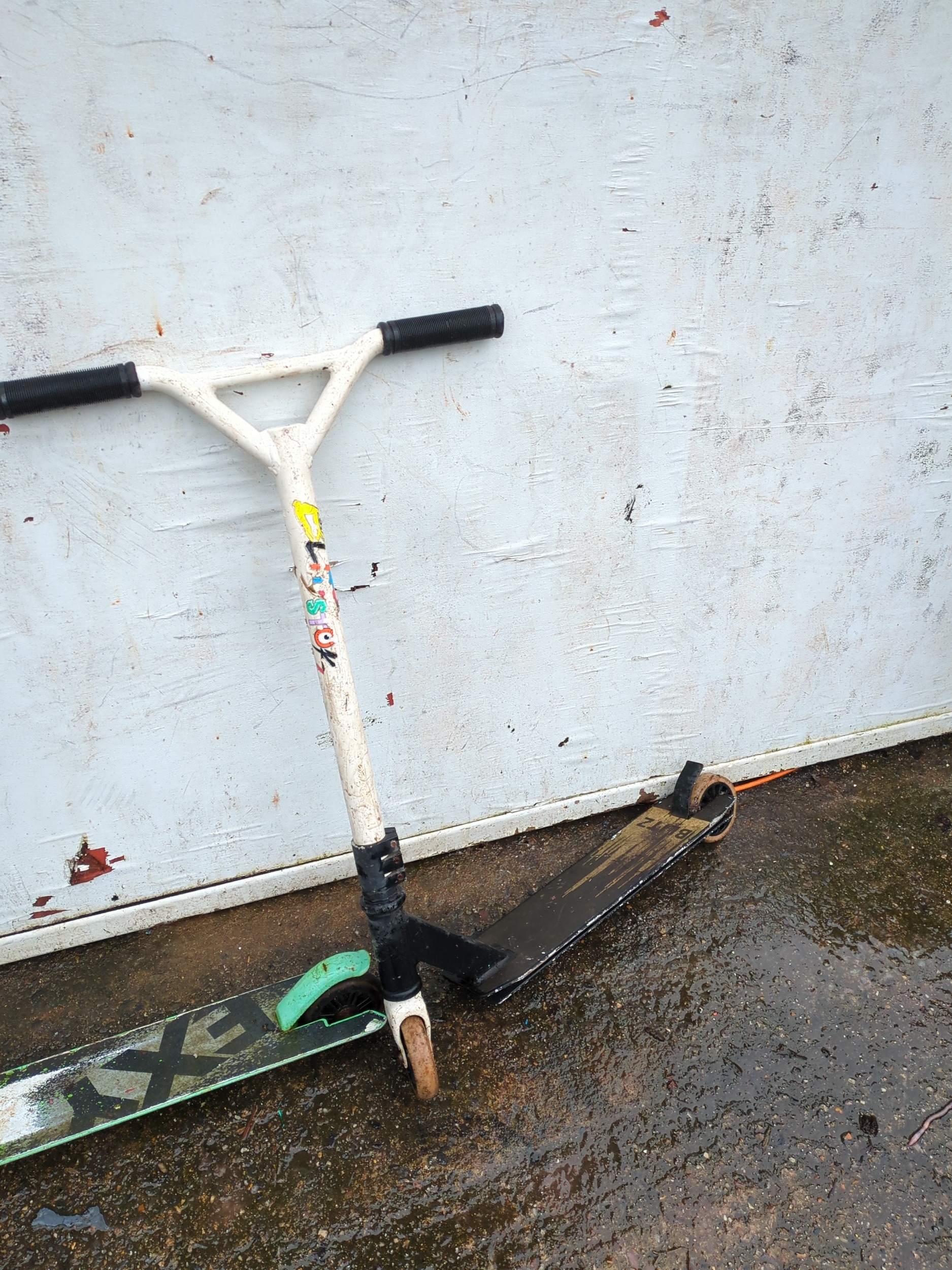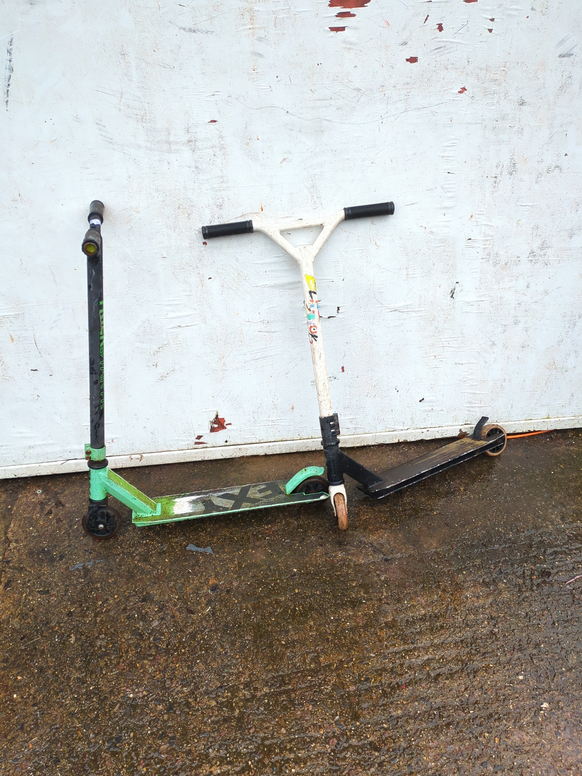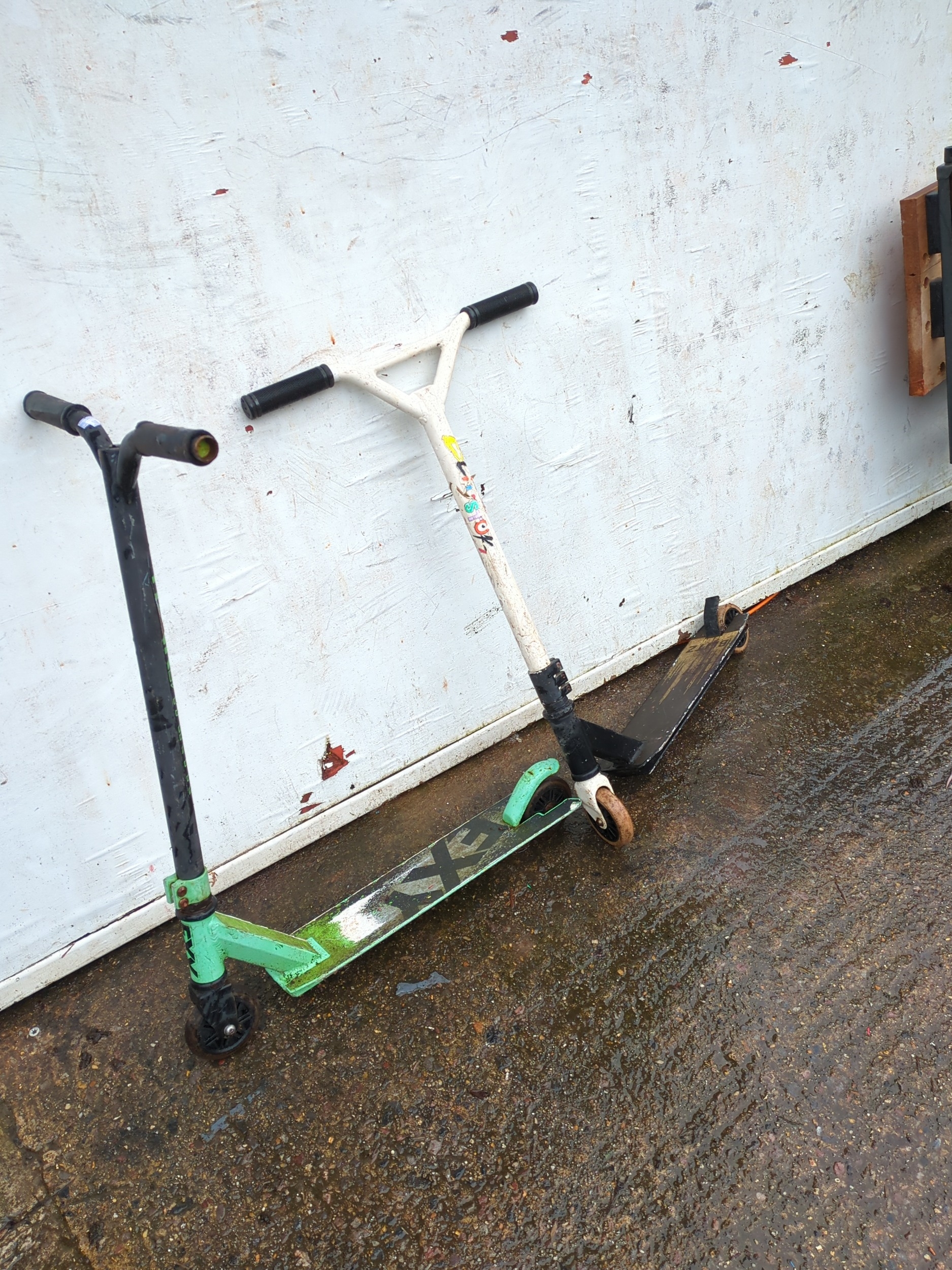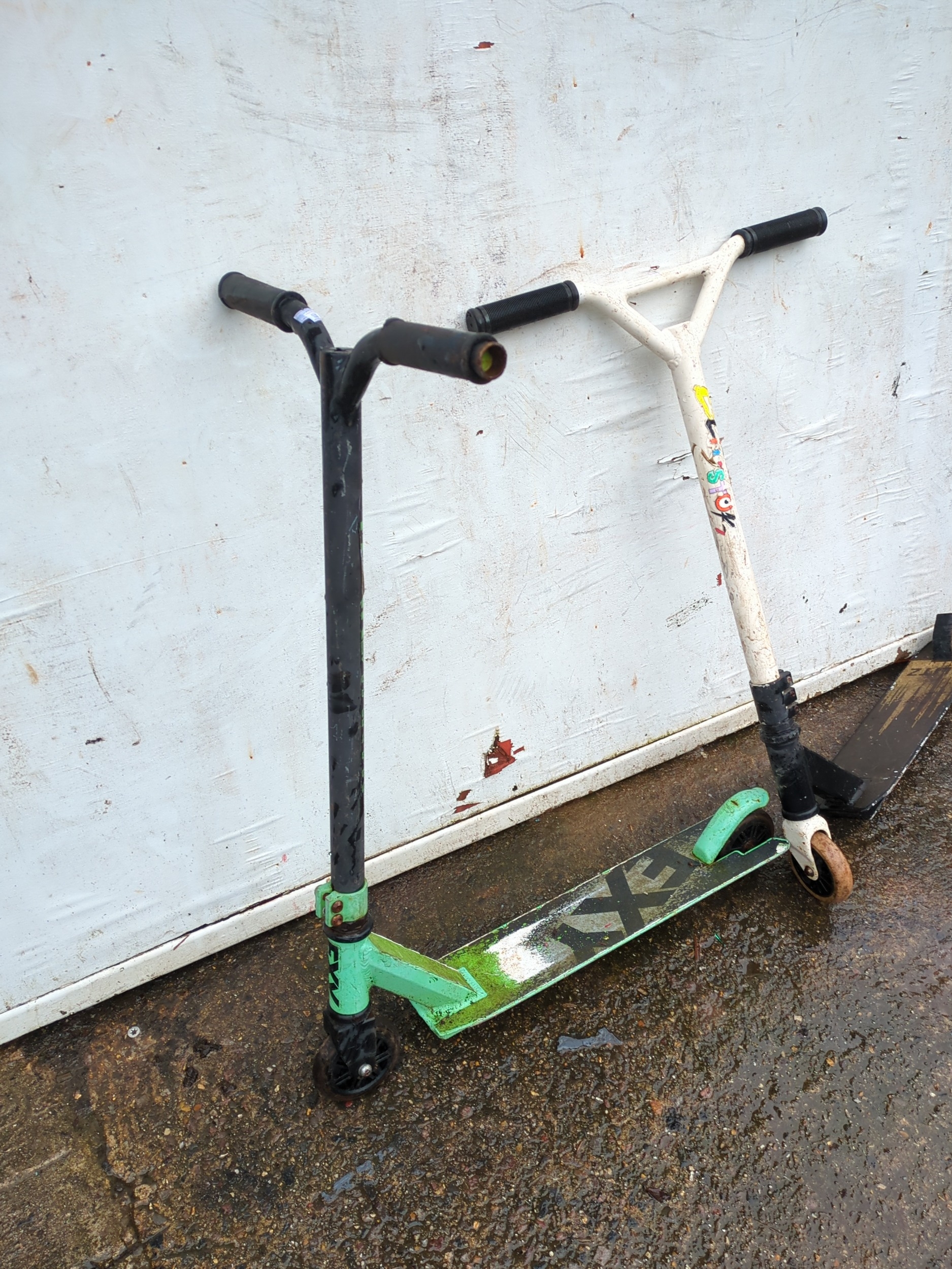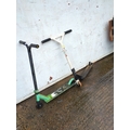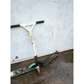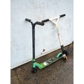 A BMX pro scooter designed for tricks and stunts, featuring a black deck with colourful graphic accents. The scooter has a sturdy white and black handlebar with comfortable grips. Ideal for outdoor use in skate parks or urban environments.