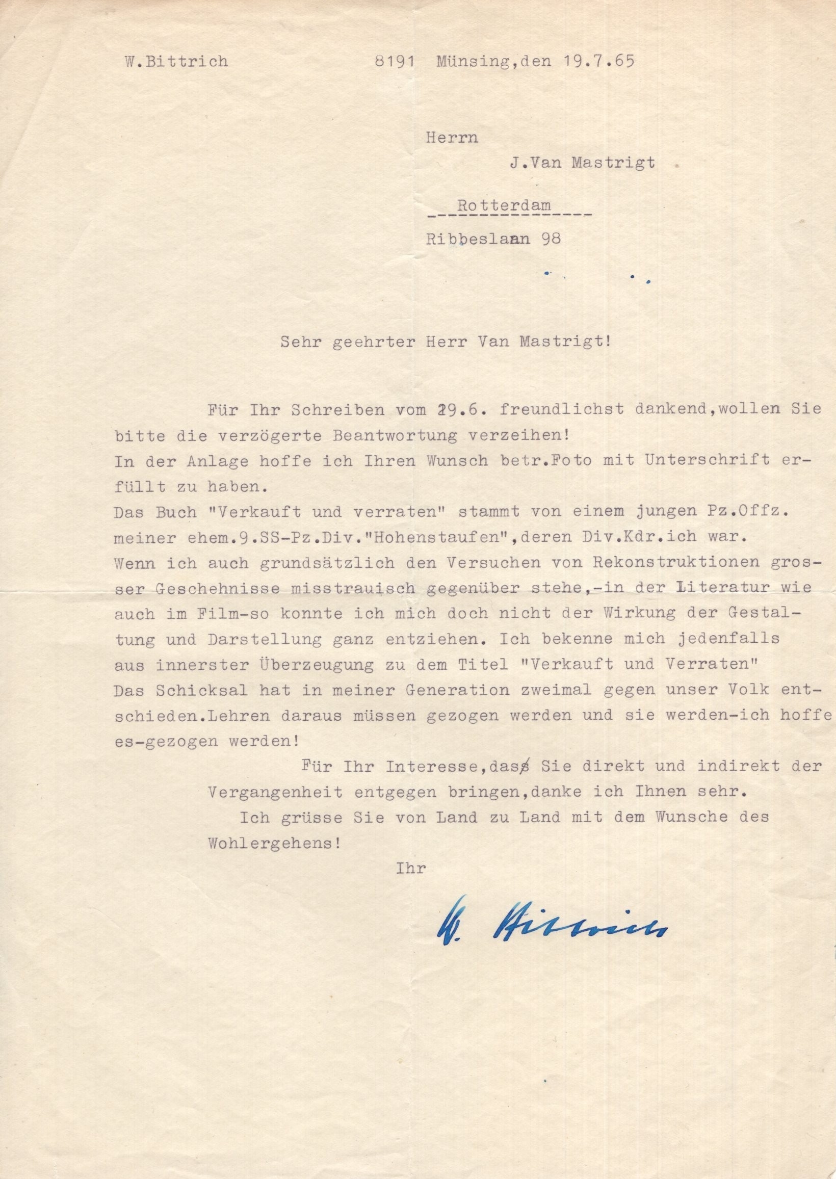 Bittrich, Wilhelm, signed typed letter, approx. A4, Wilhelm Bittrich (26 February 1894 19 April 1979) was a high-ranking Waffen-SS commander of Nazi Germany. Between August 1942 and February 1943, Bittrich commanded the SS Cavalry Division Florian Geyer, in rear security operations in the Soviet Union. From July 1944 until the end of the war Bittrich commanded the 2nd SS Panzer Corps in Normandy, during Market Garden and in Hungary