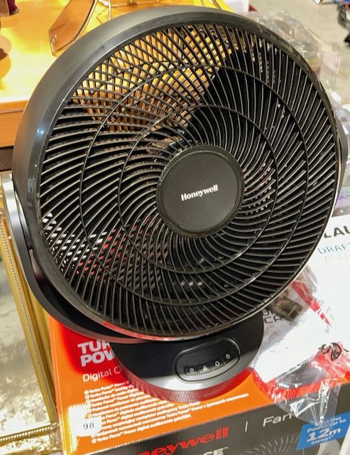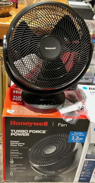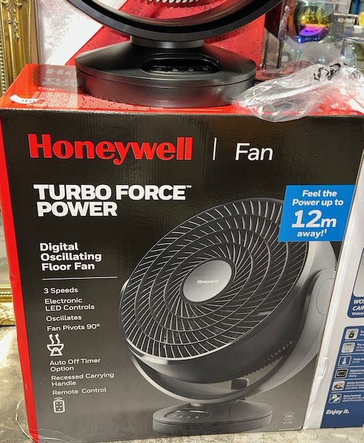 Honeywell Turbo Force Power Digital Oscillating Floor Fan - 3 Speeds, Electronic LED Controls, Oscillates, Fan Pivots 90 Degrees, Auto Off Timer Option, Recessed Carrying Handle, Remote Control - Unused/Boxed
