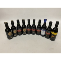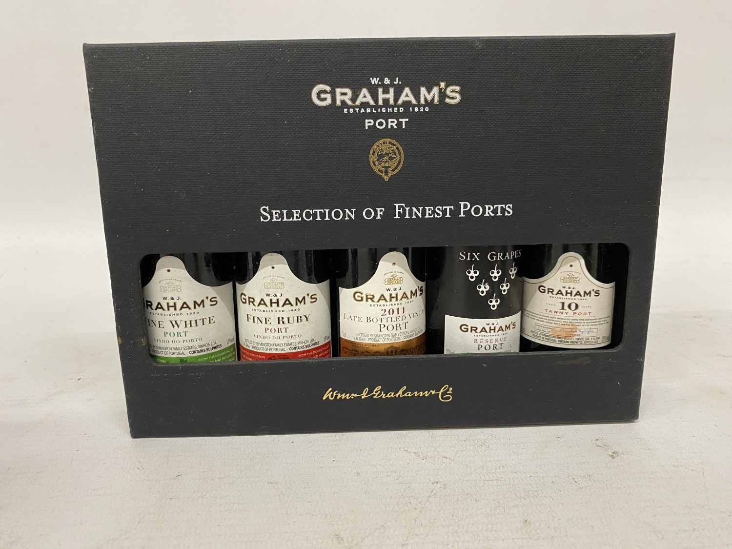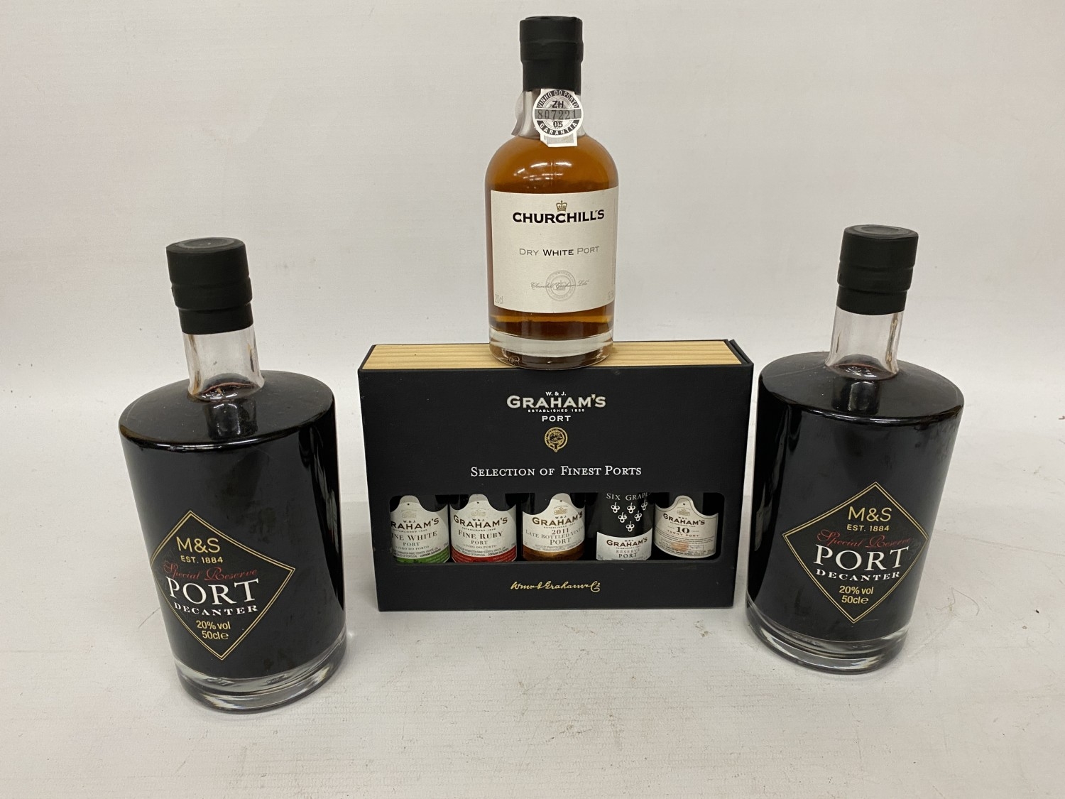 TWO 50CL BOTTLES OF M&S SPECIAL RESERVE PORT TOGETHER WITH A 20CL BOTTLE OF CHURCHILL'S DRY WHITE PORT AND A SELECTION OF FIVE 5CL GRAHAM'S FINEST PORTS IN A PRESENTATION PACK