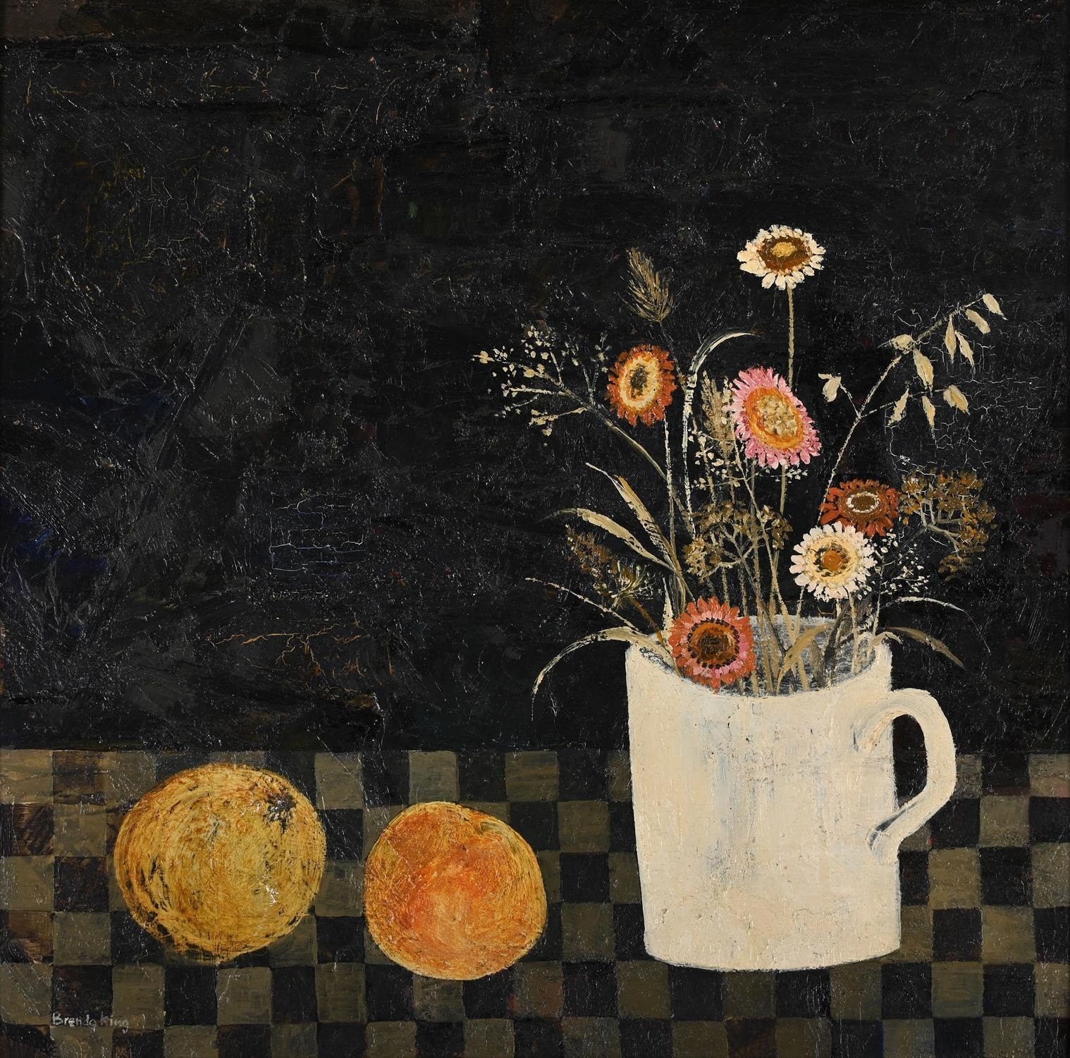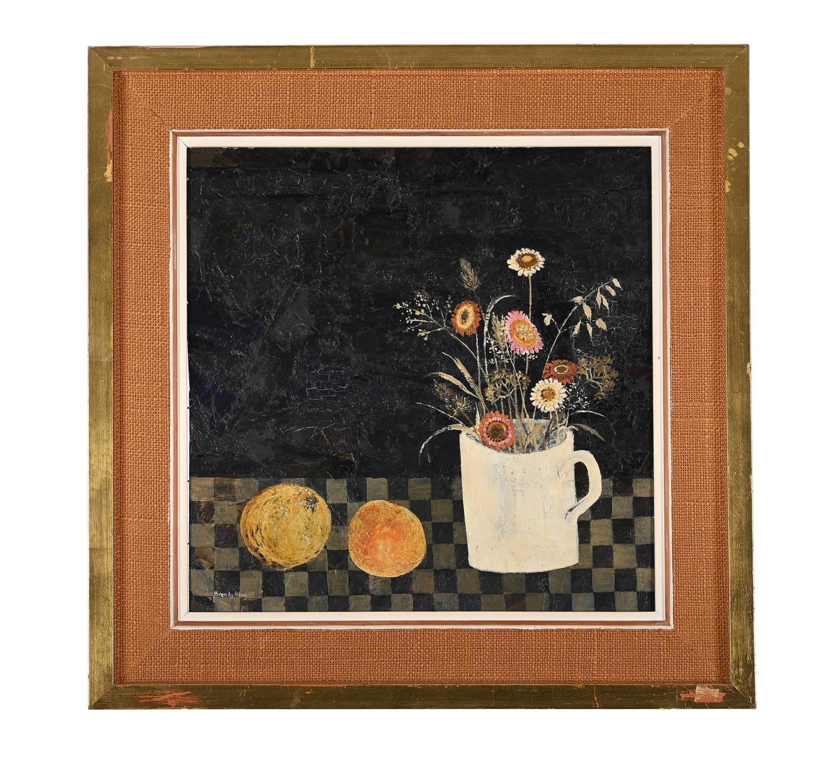 λ BRENDA KING (BRITISH 1934-2011)FLOWERS IN A WHITE BEAKEROil on board Signed (lower left), titled and inscribed to stretcher (verso)39 x 38cm (15¼ x 14¾ in.)Measurements do not include the frame unless specified. Please note Dreweatts are not liable for damage to frames or mounts.