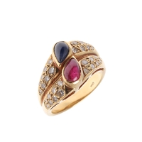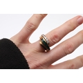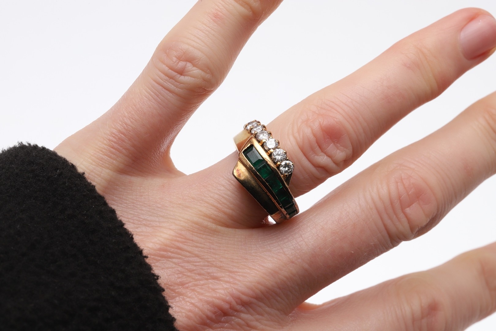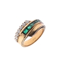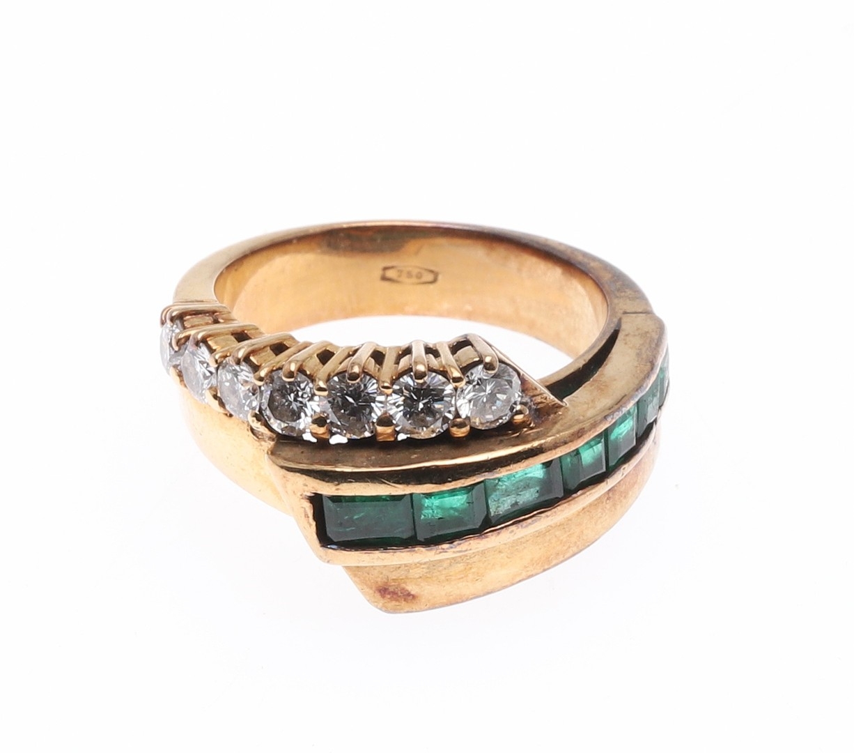 Two of the emeralds are quite rubbed, some damage to the mount, wear to the shank.
