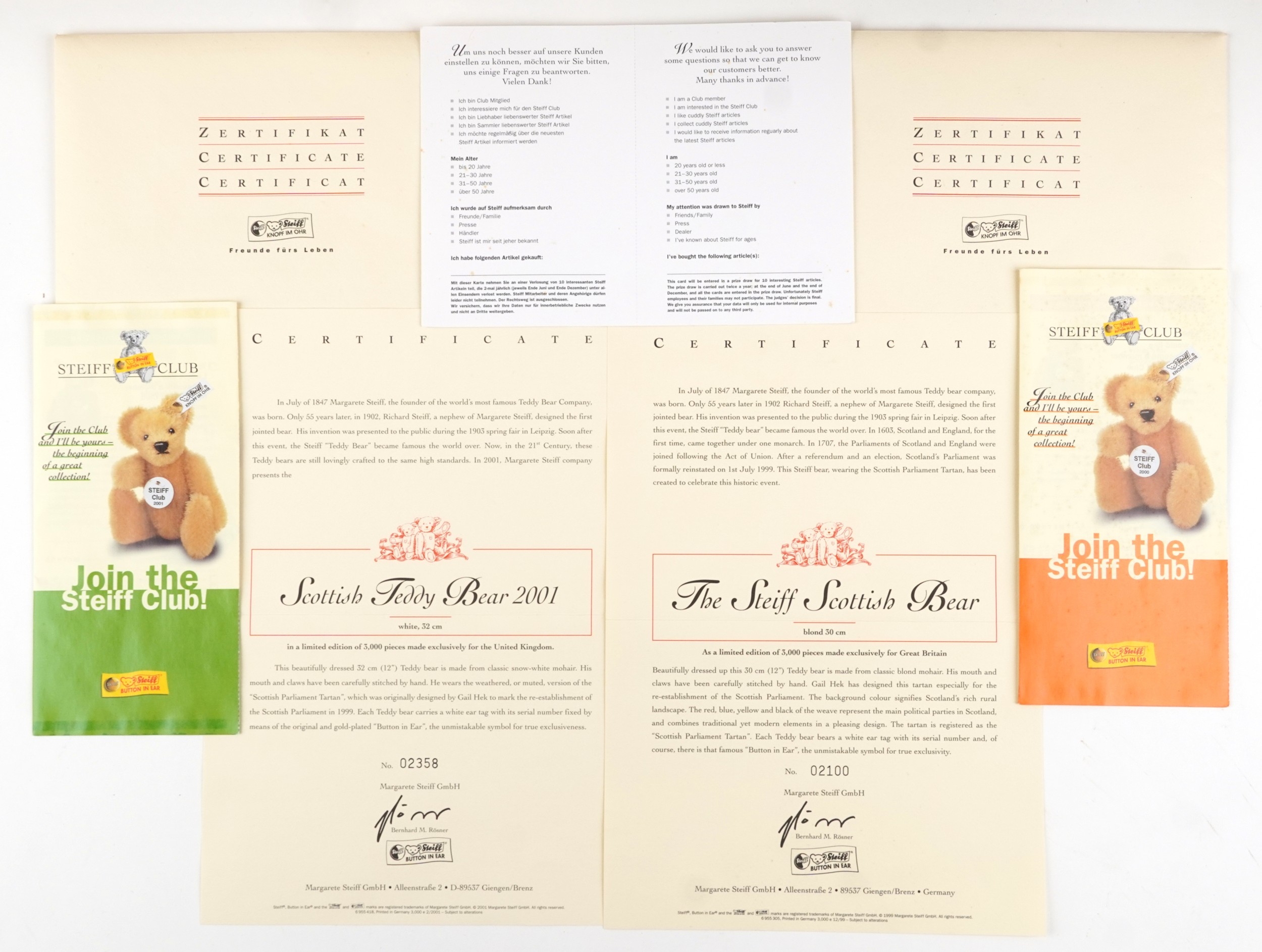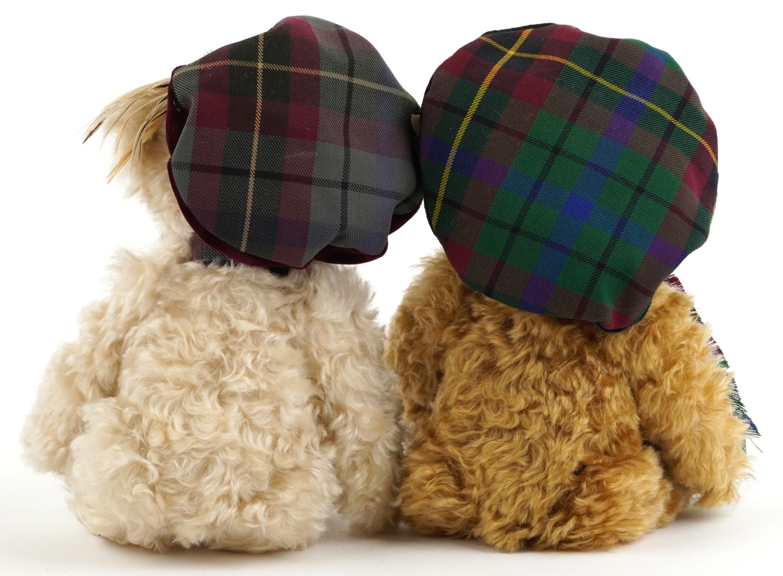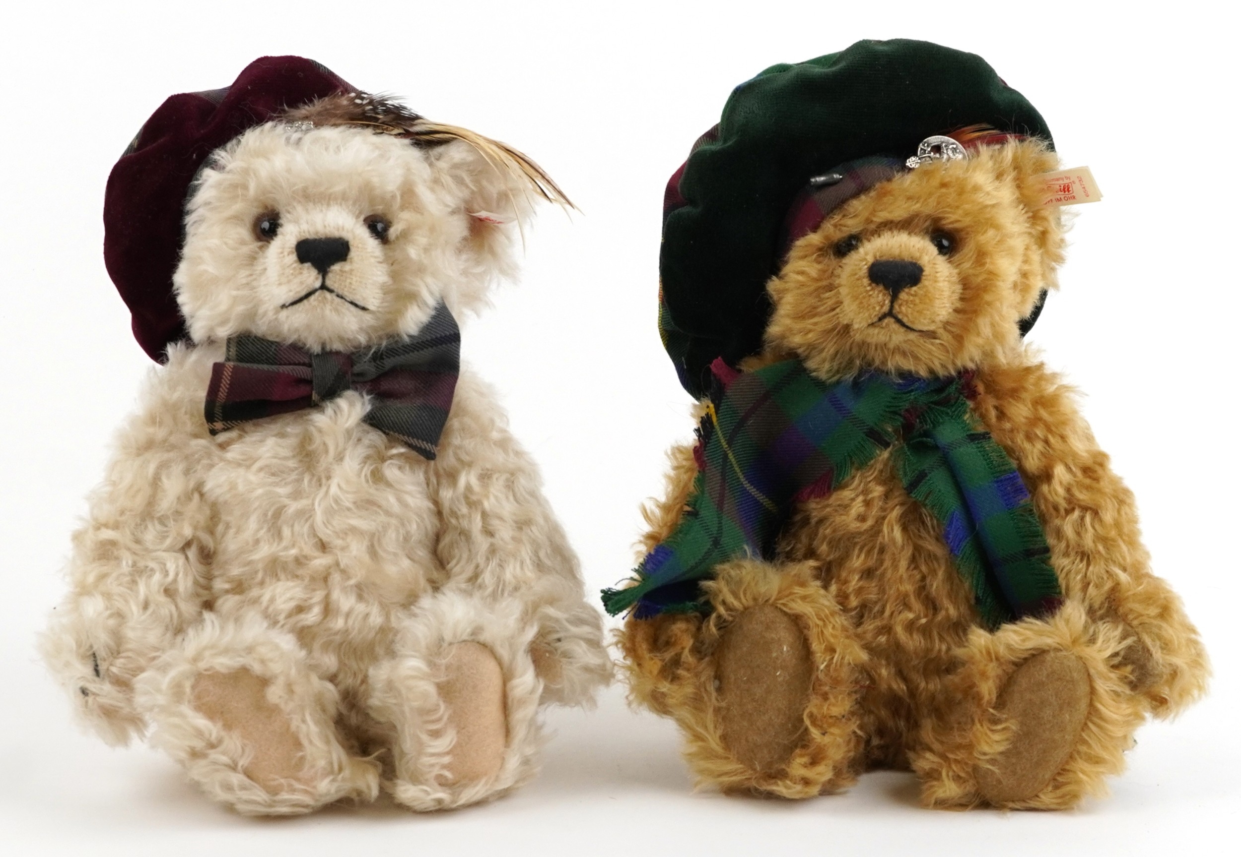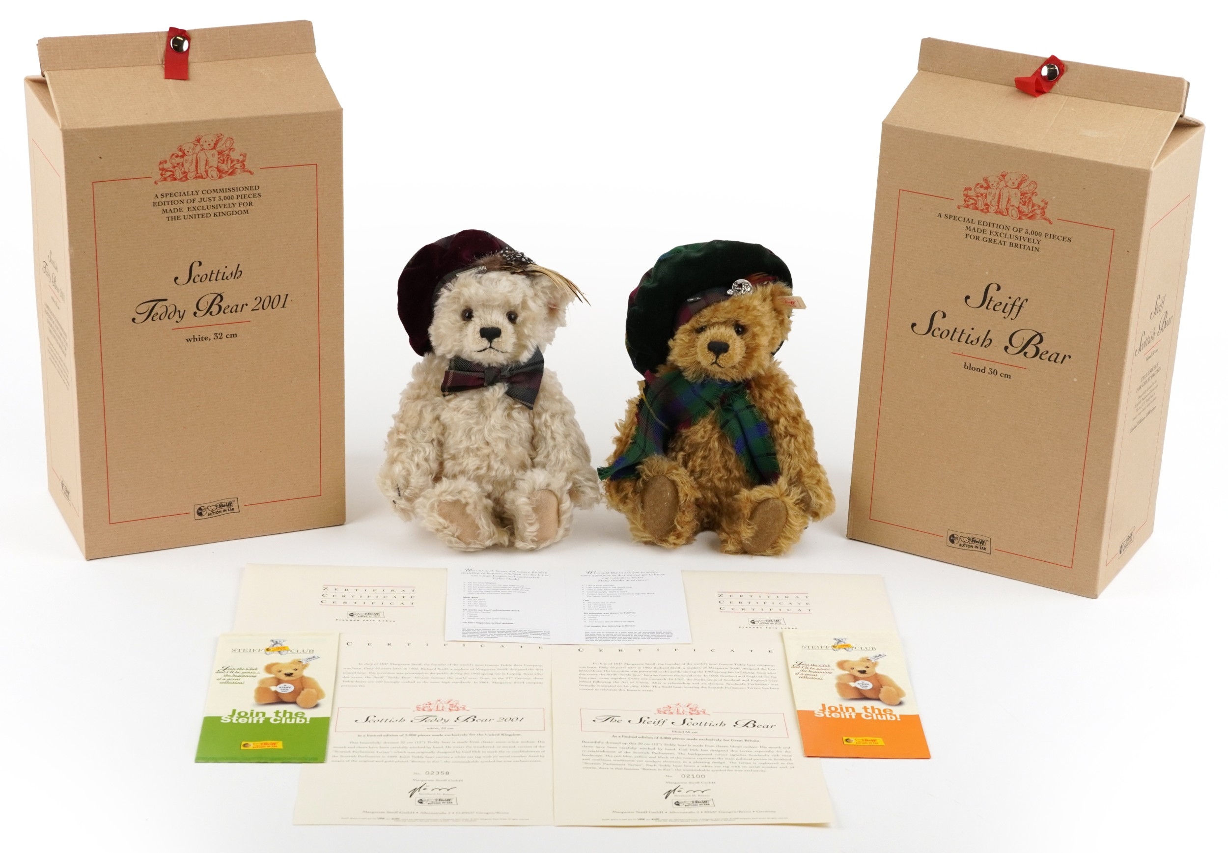 Two Steiff limited edition collectable teddy bears with boxes and certificates comprising the Steiff Scottish bear numbered 2100/3000 and Scottish Bear 2001 numbered 2358/3000, each 32cm in length.