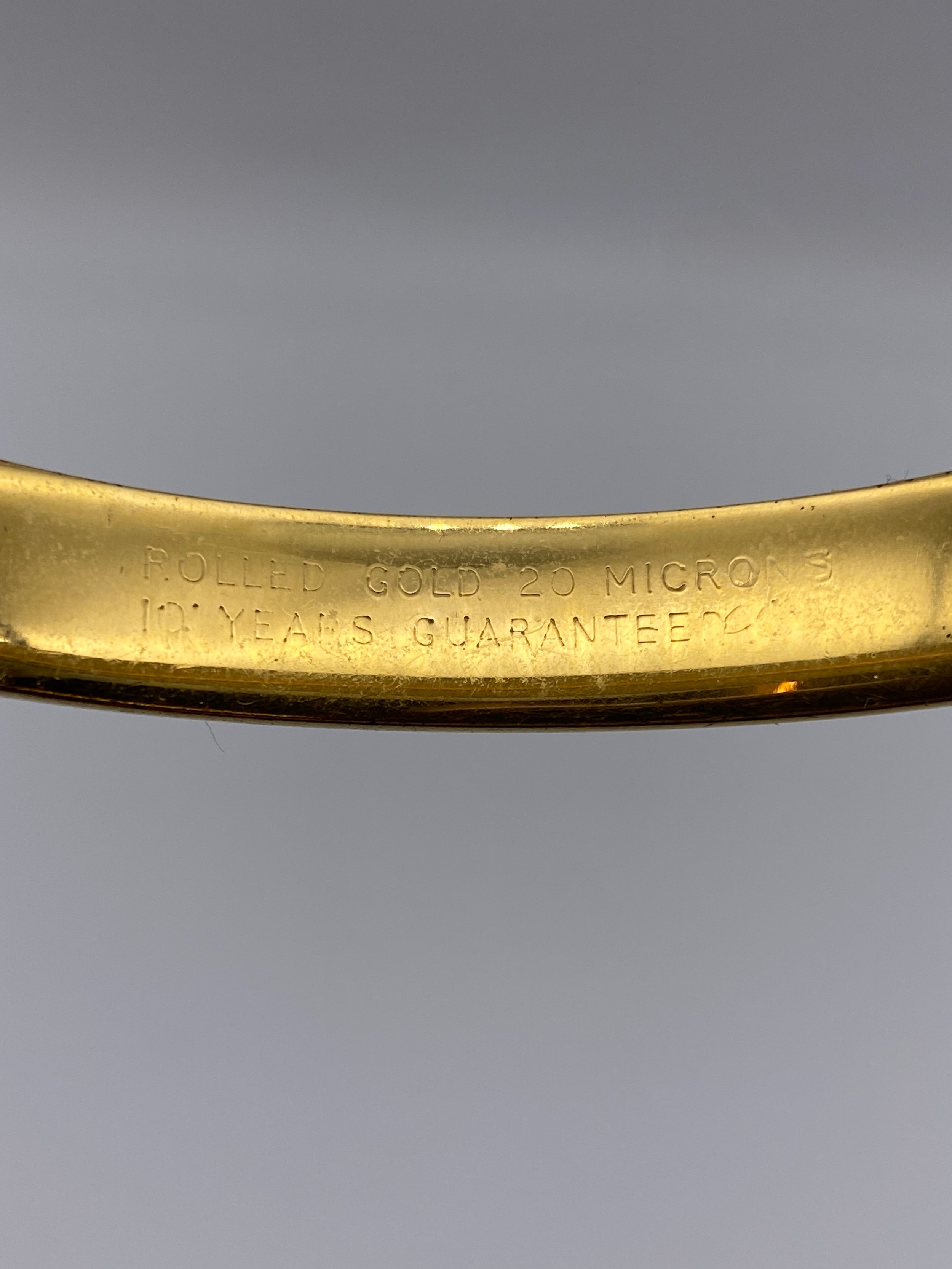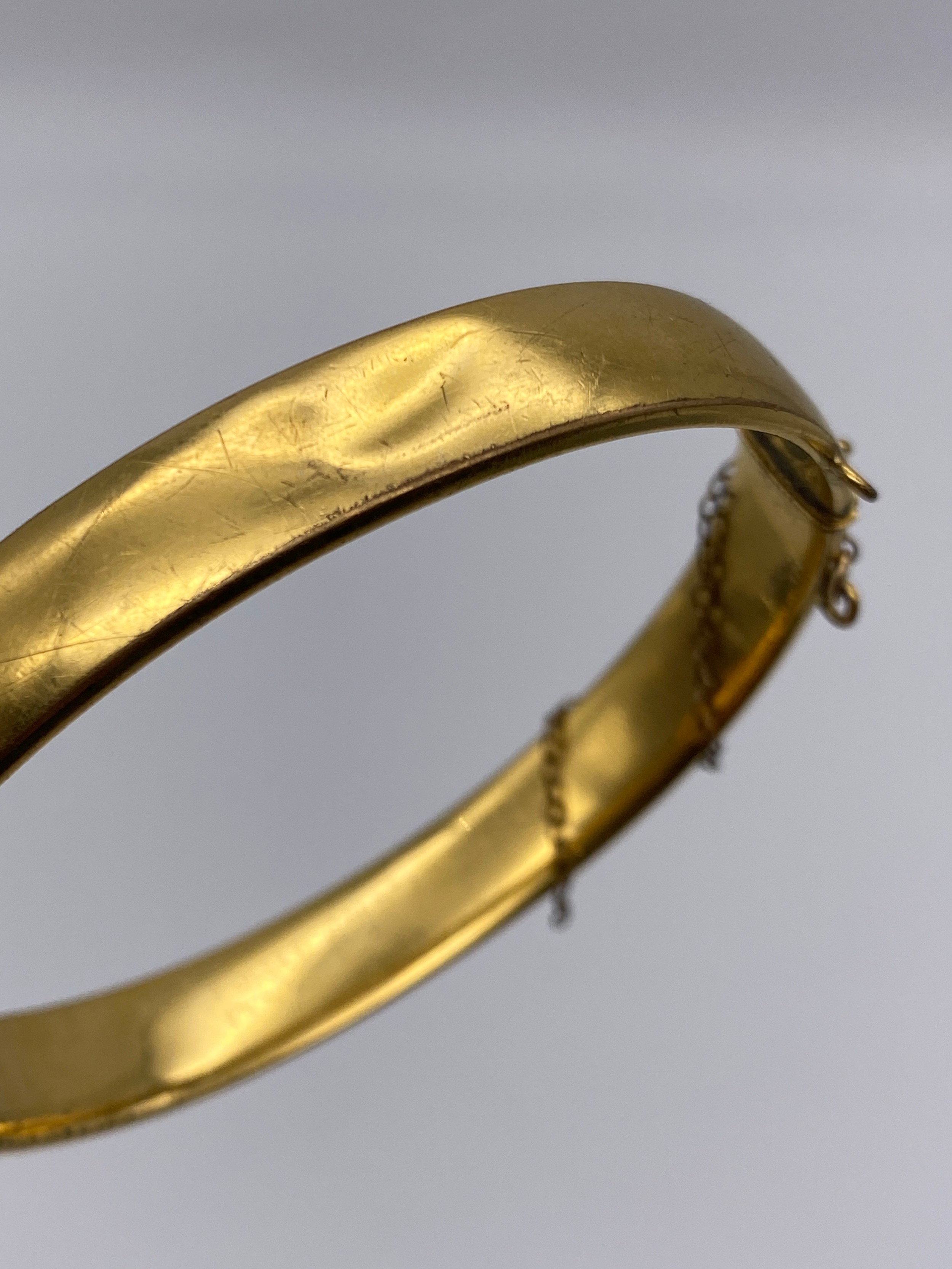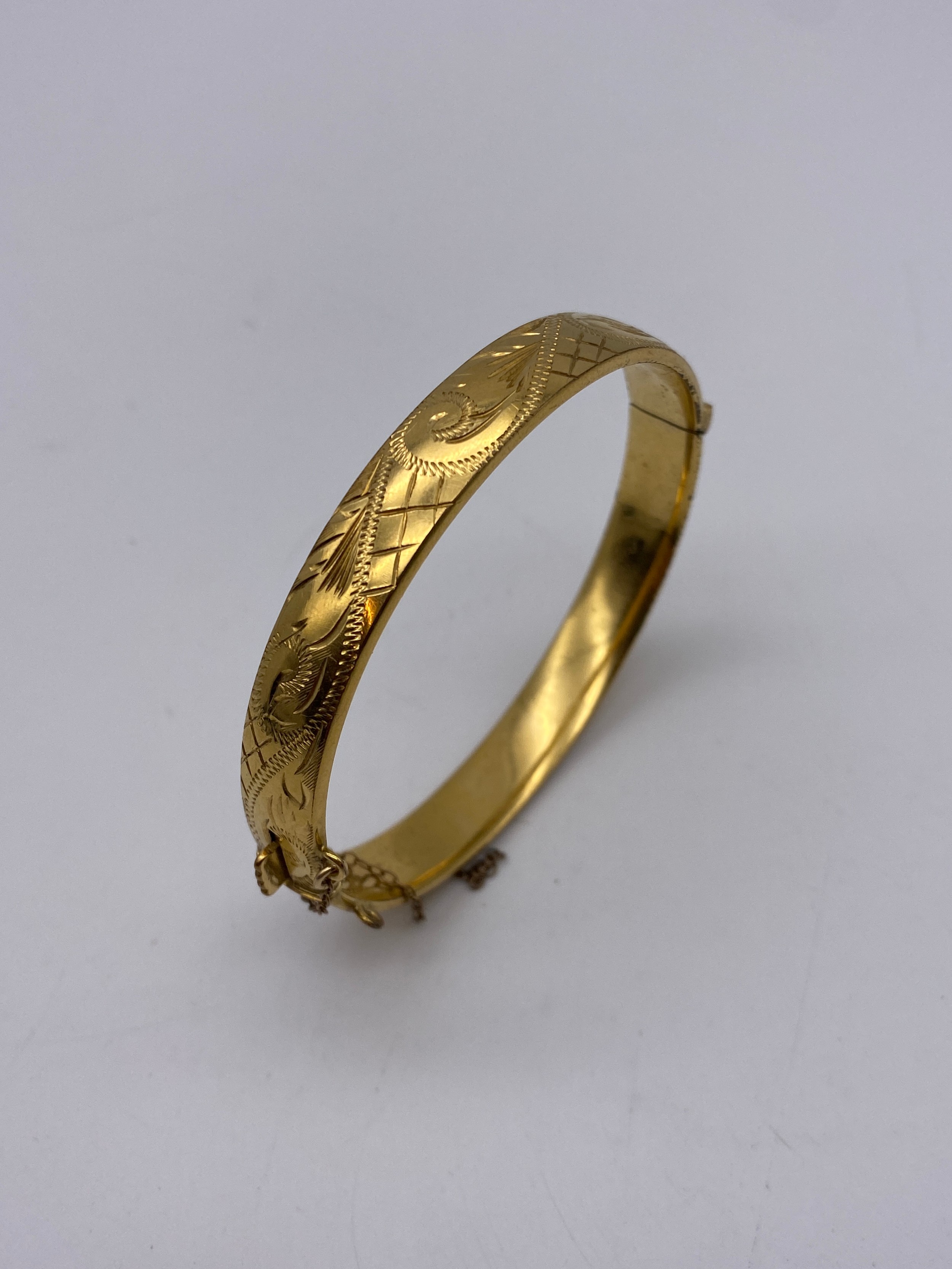 ROLLED GOLD ENGRAVED BANGLE WITH BROKEN SAFETY CHAIN 14G APPROX