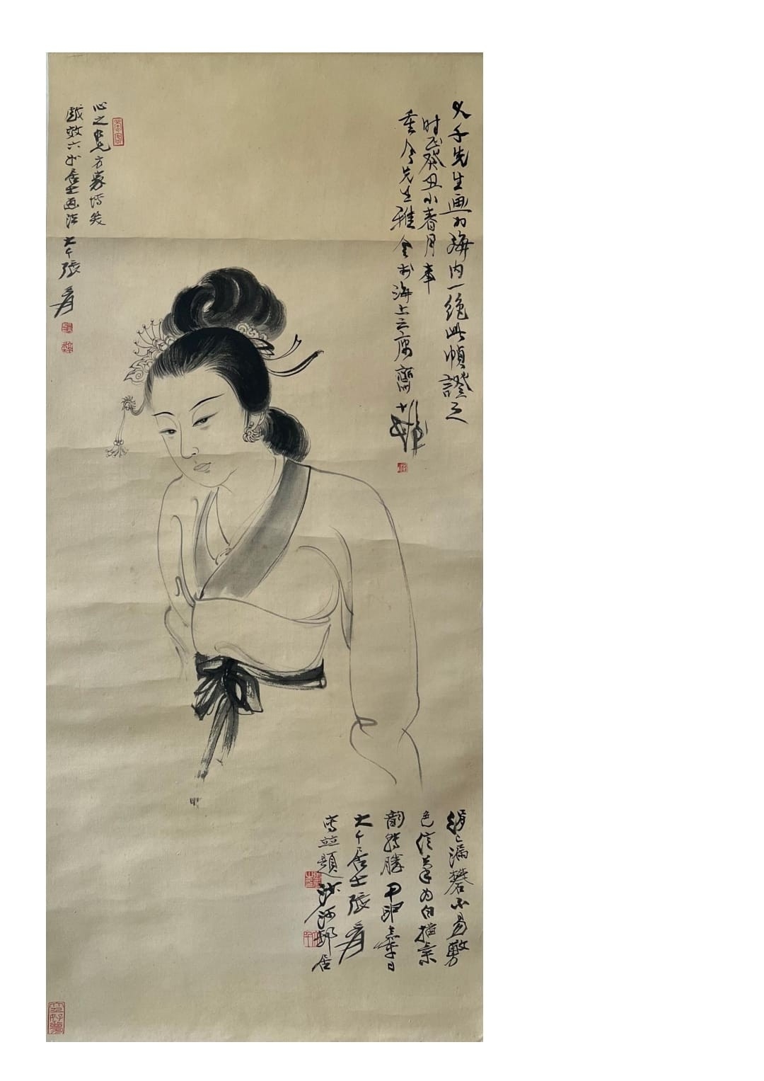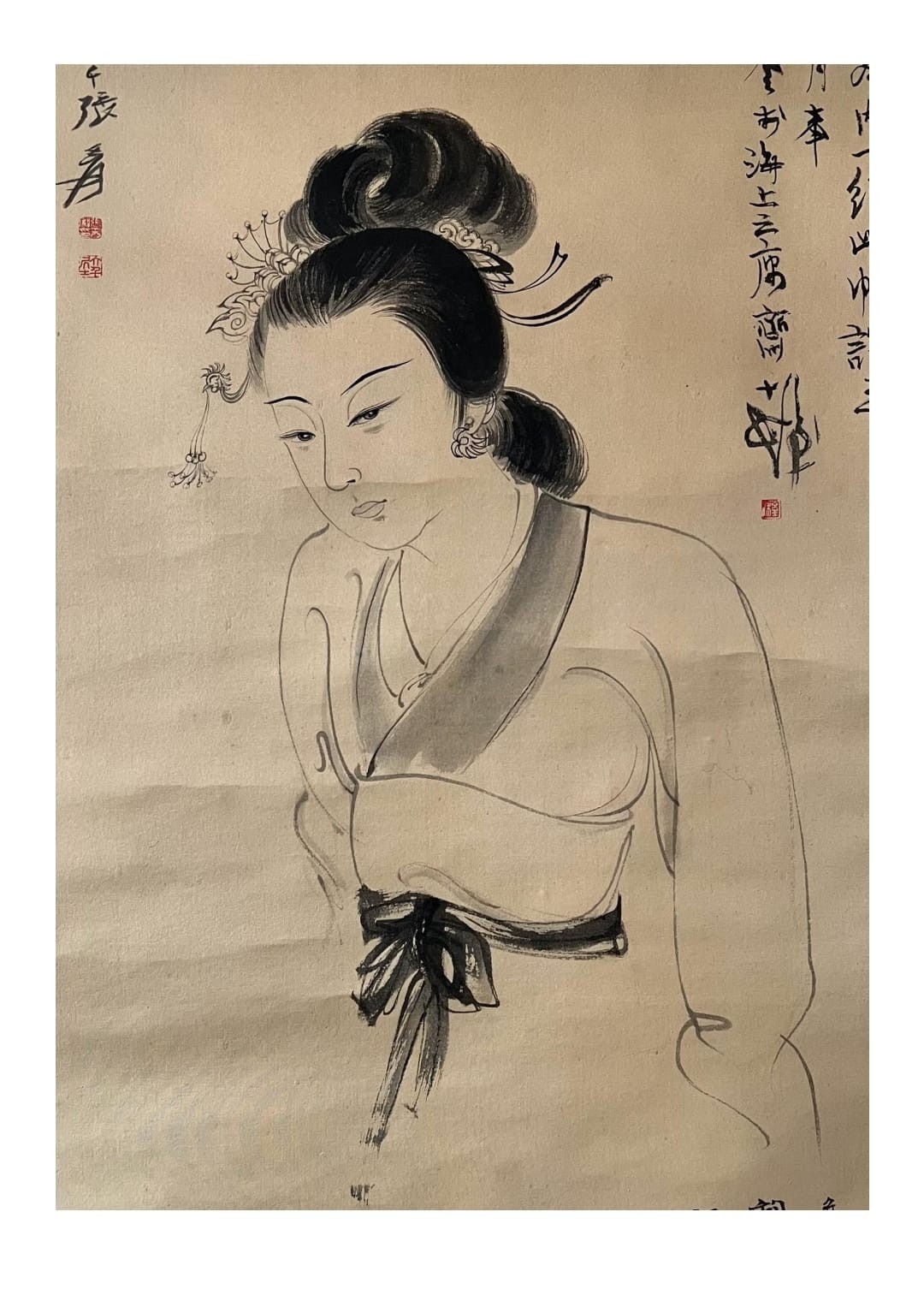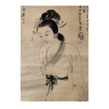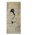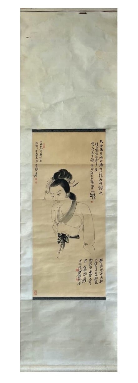 A female portrait on silk - Attribute to Zhang Daqian. The inscription described that Zhang Daqian intended to apply water color on it but due to alum was not appropriated applied on silk to function as the base of pigments, he switched to line drawing technique. The painting was appreciated by Cheng Shifa and received high admiration. Size approx: 84.5cm*38cm.