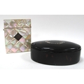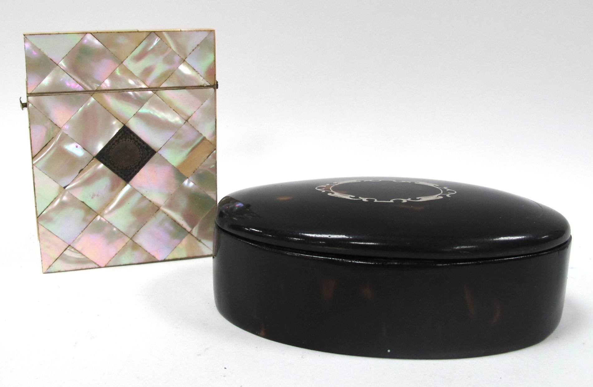 Oval Tortoiseshell Trinket Box, with silvered inlay, 13cm wide. XIX Century mother of pearl card case (four side panels absent) (2).