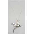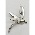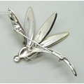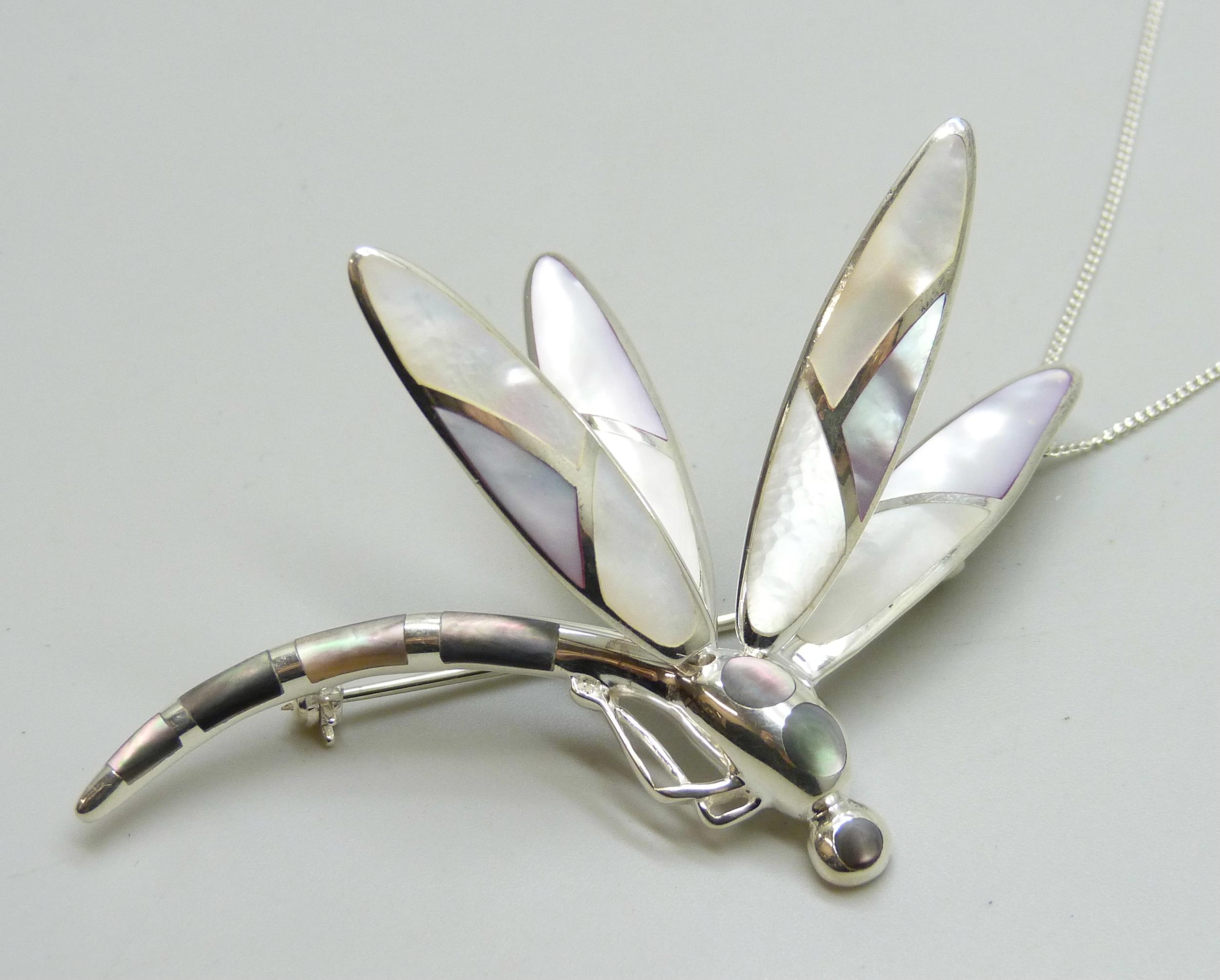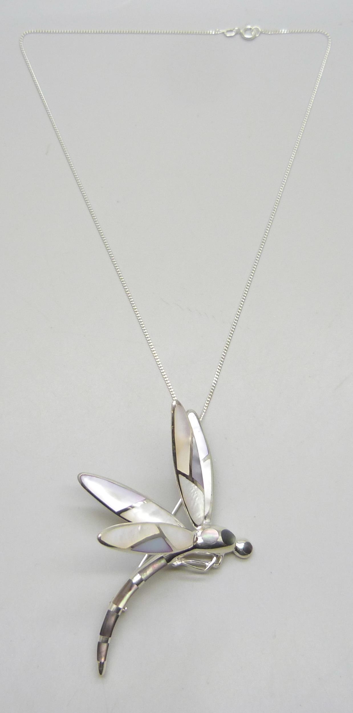 A large silver and mother of pearl dragonfly brooch or pendant, 8cm, on a silver chain