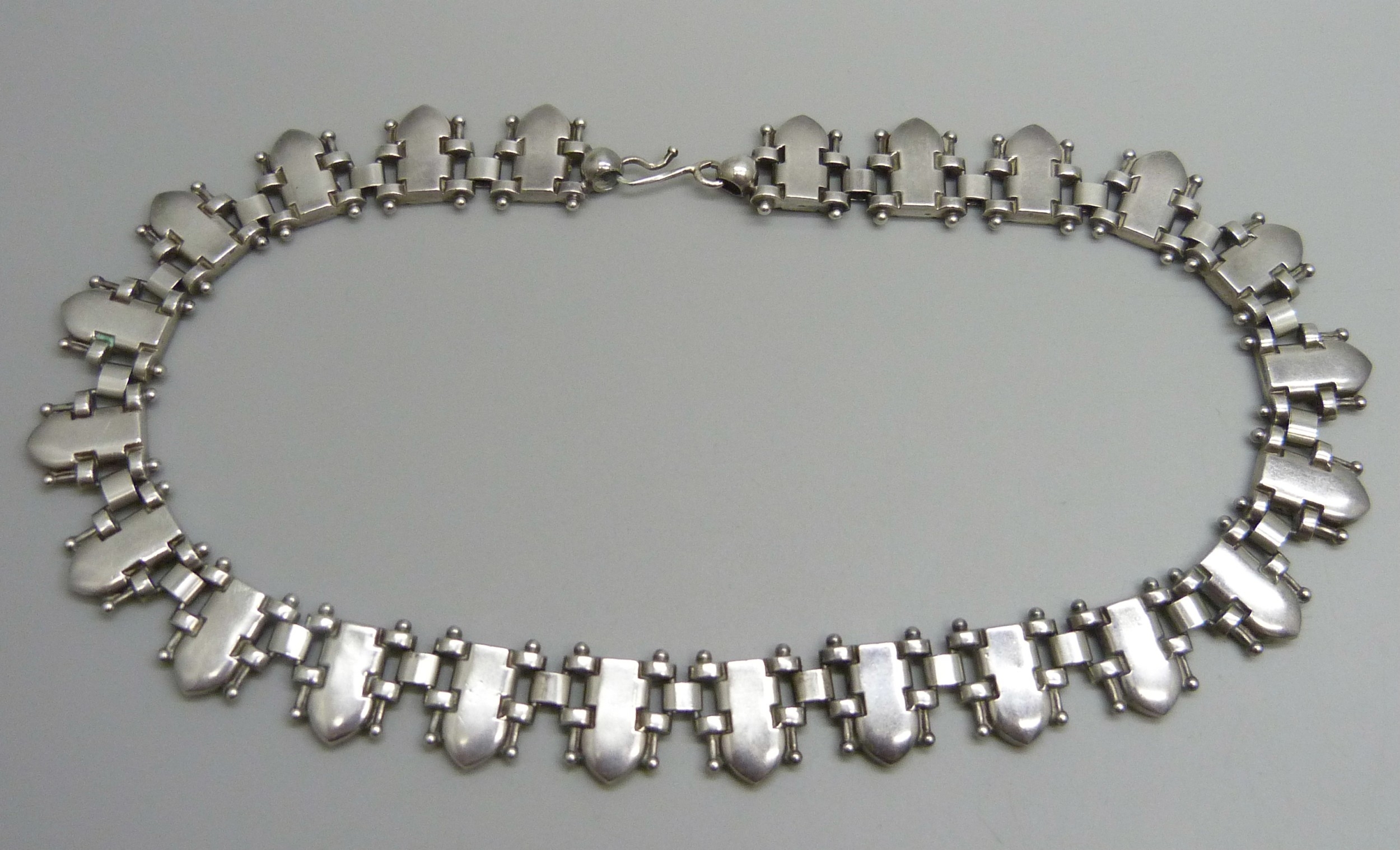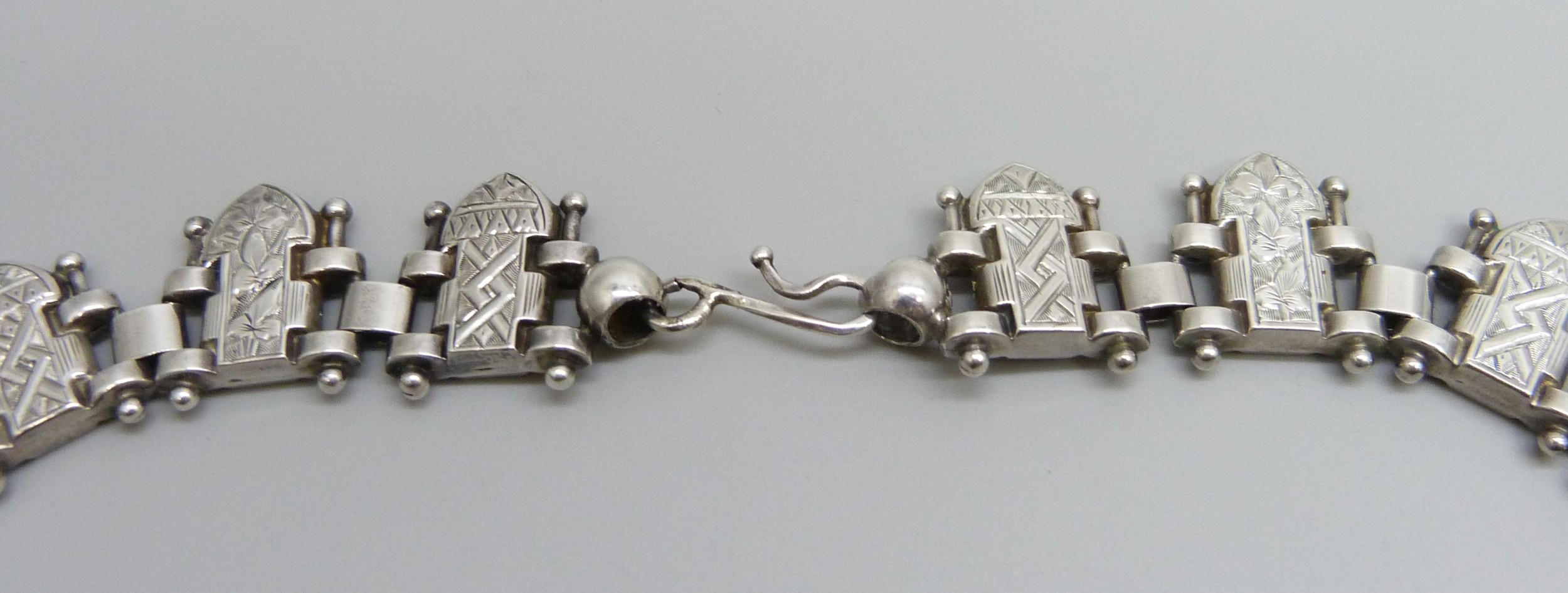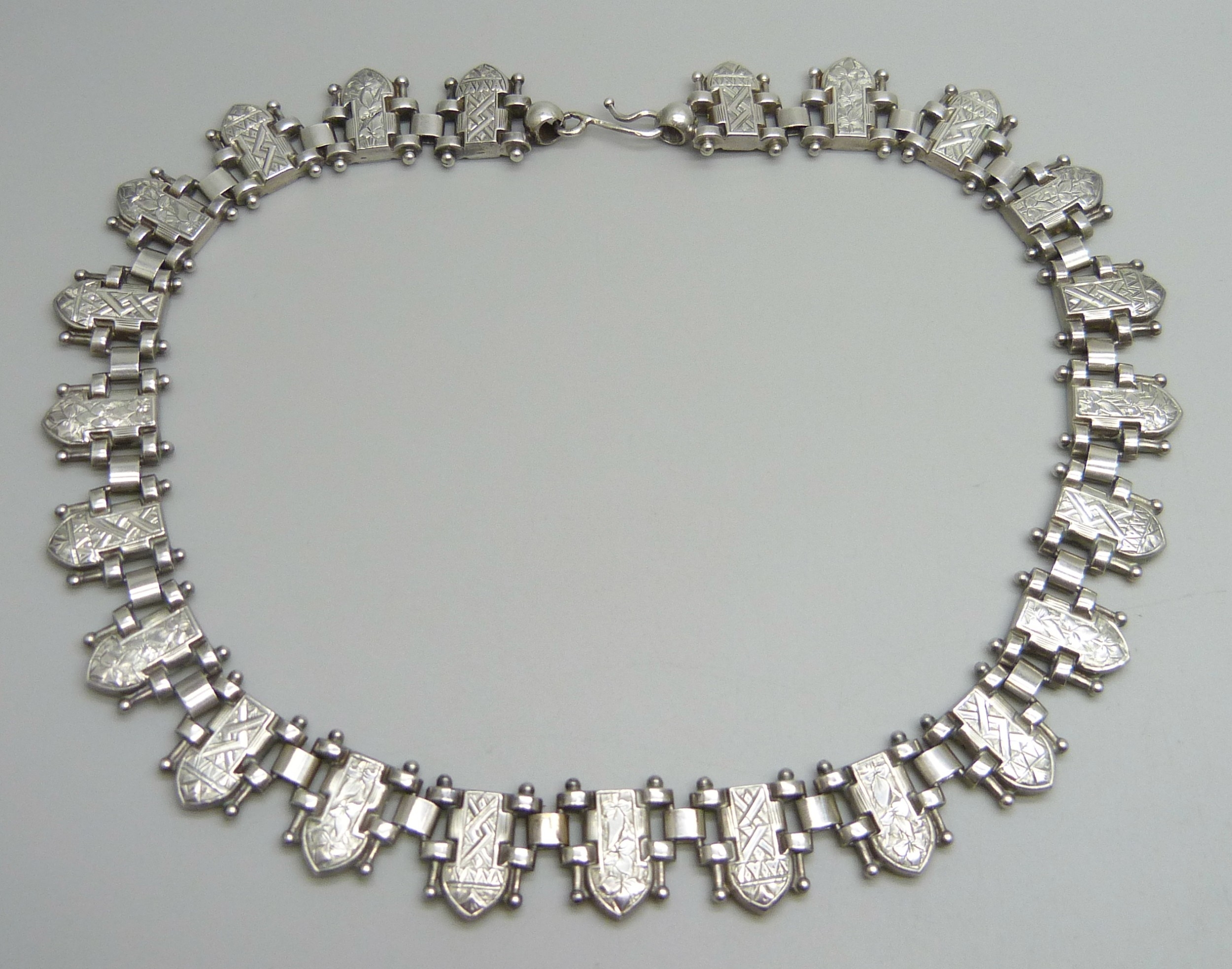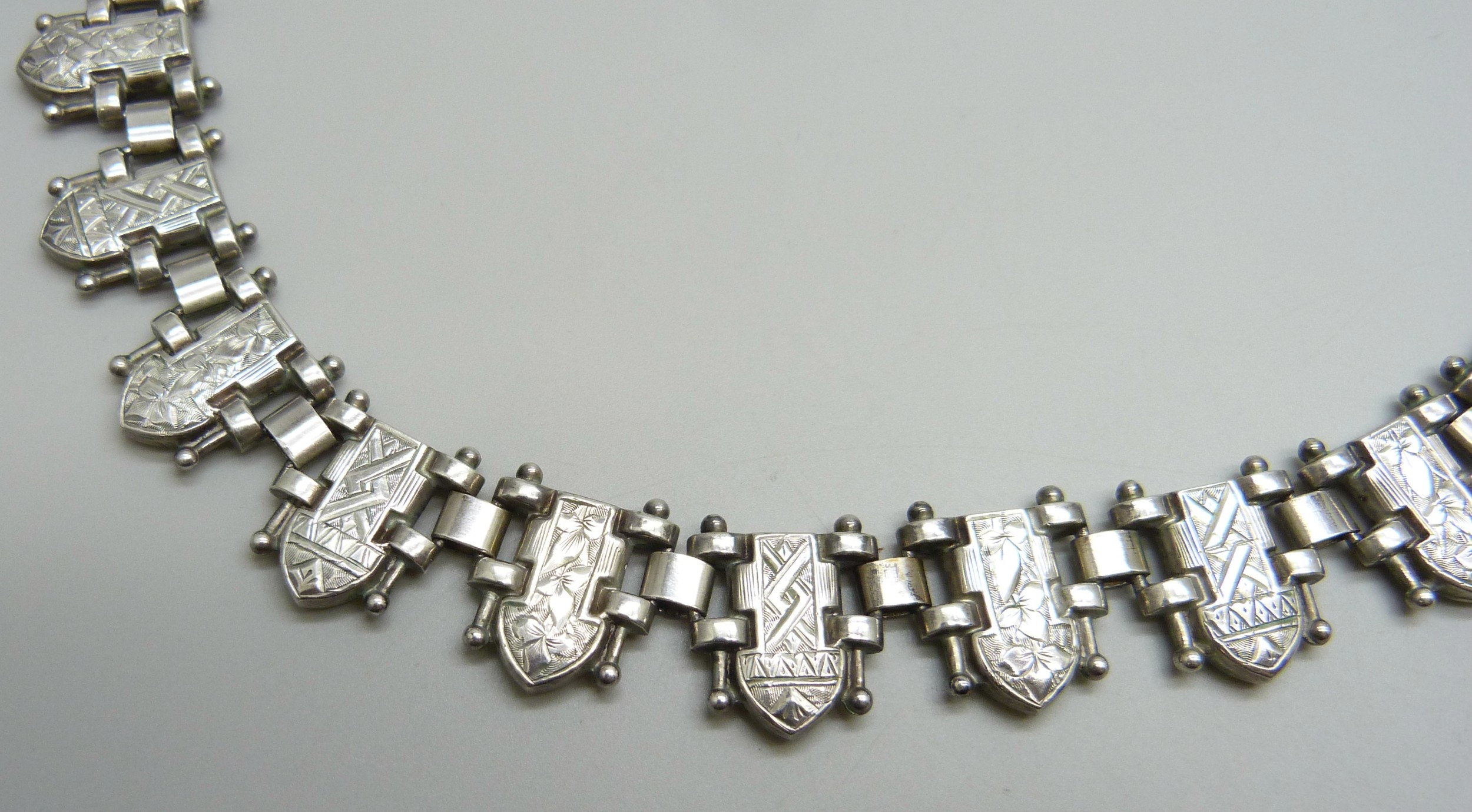 A white metal Victorian style collar with engraved design, 46g, 45cm
