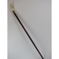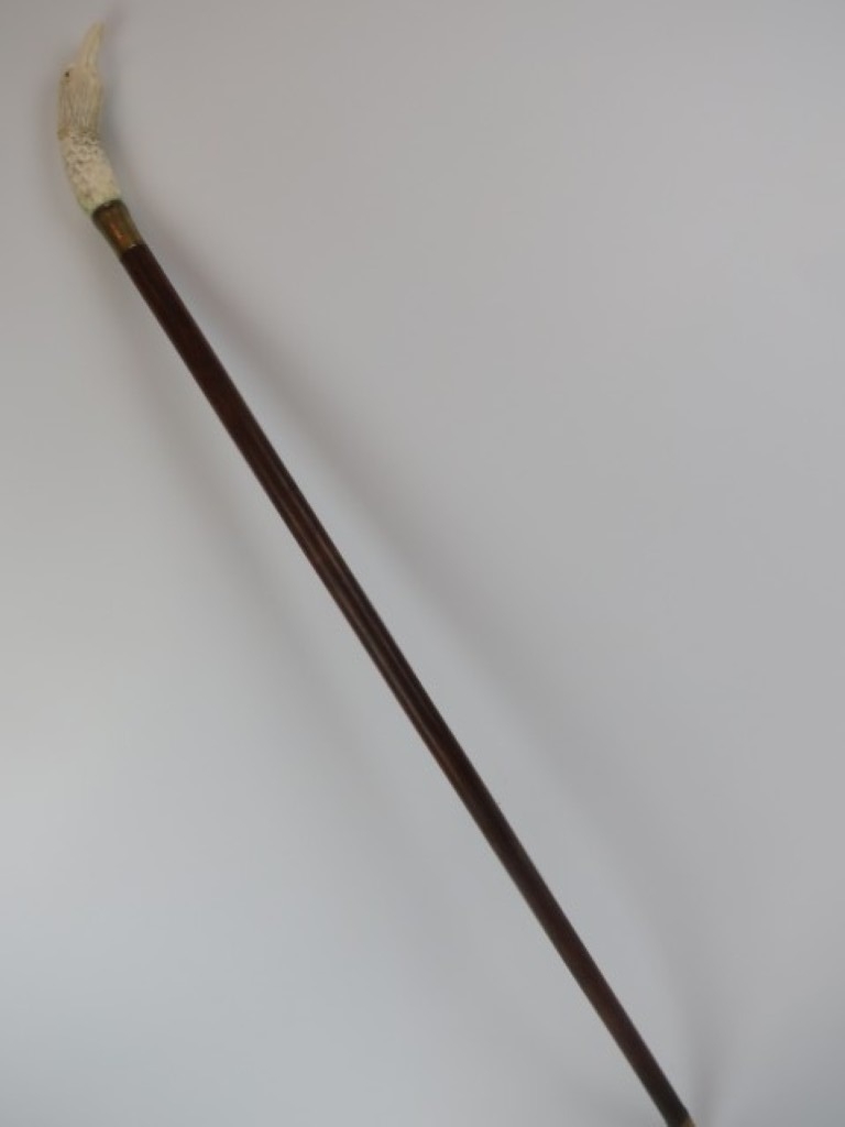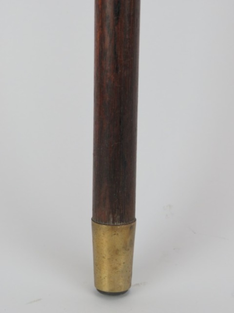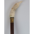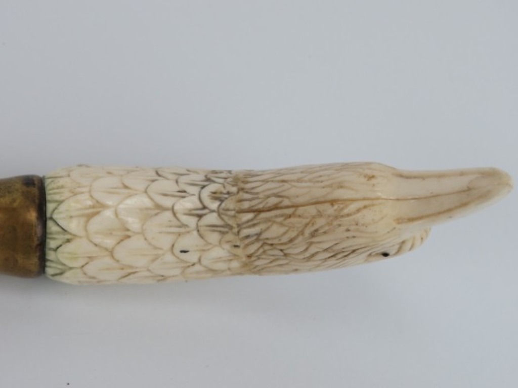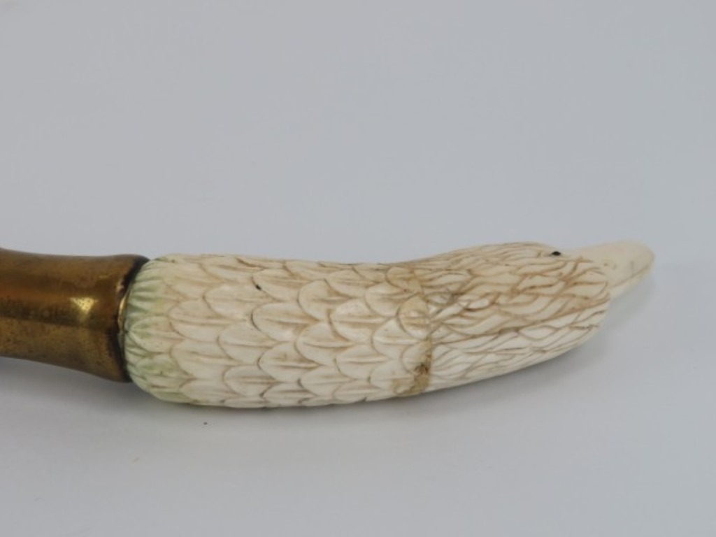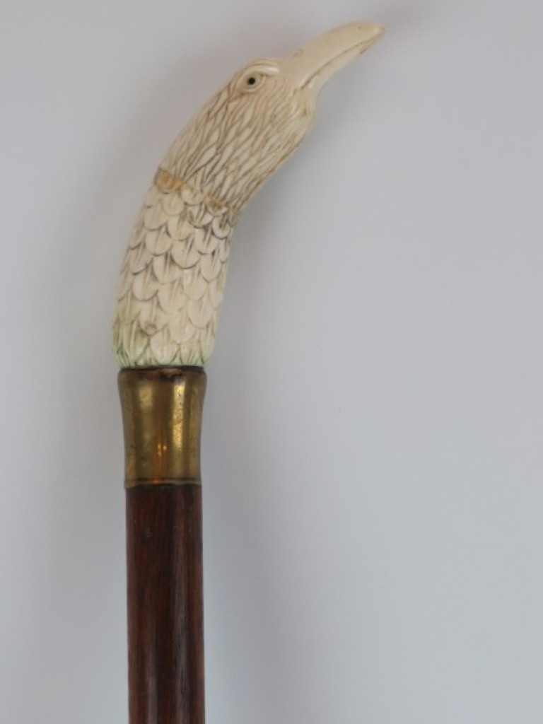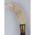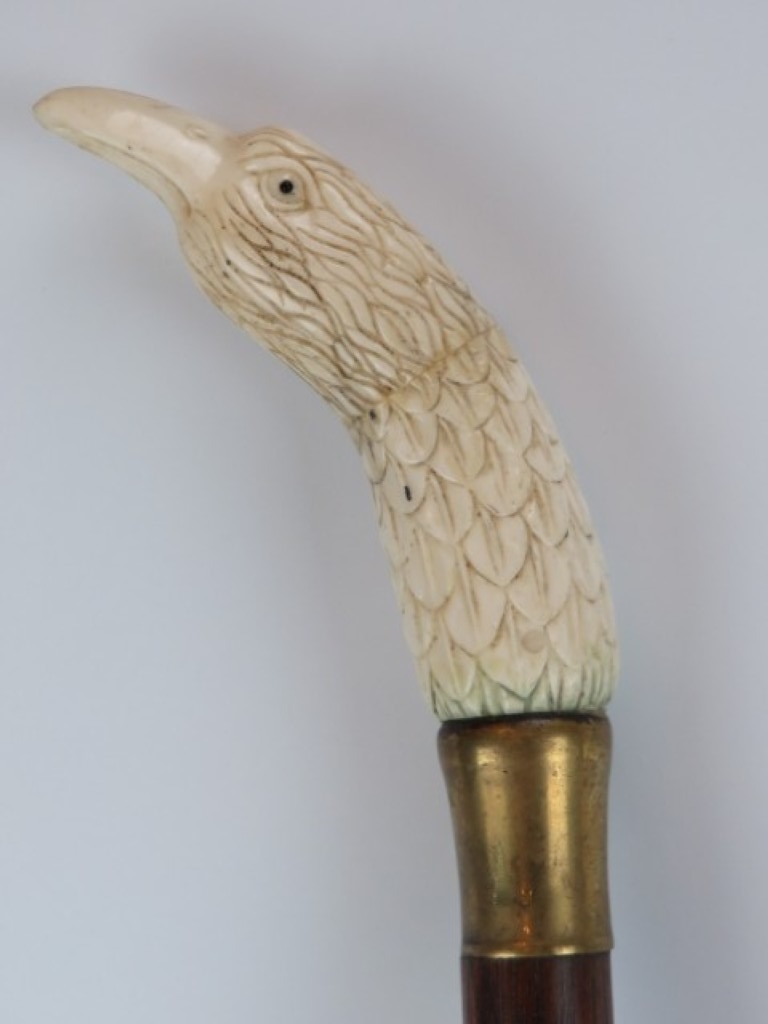 A carved bone eagle’s head handled walking cane, early 20th century. On a tapered oak shaft with brass collar and ferrule. 89.4 cm length.