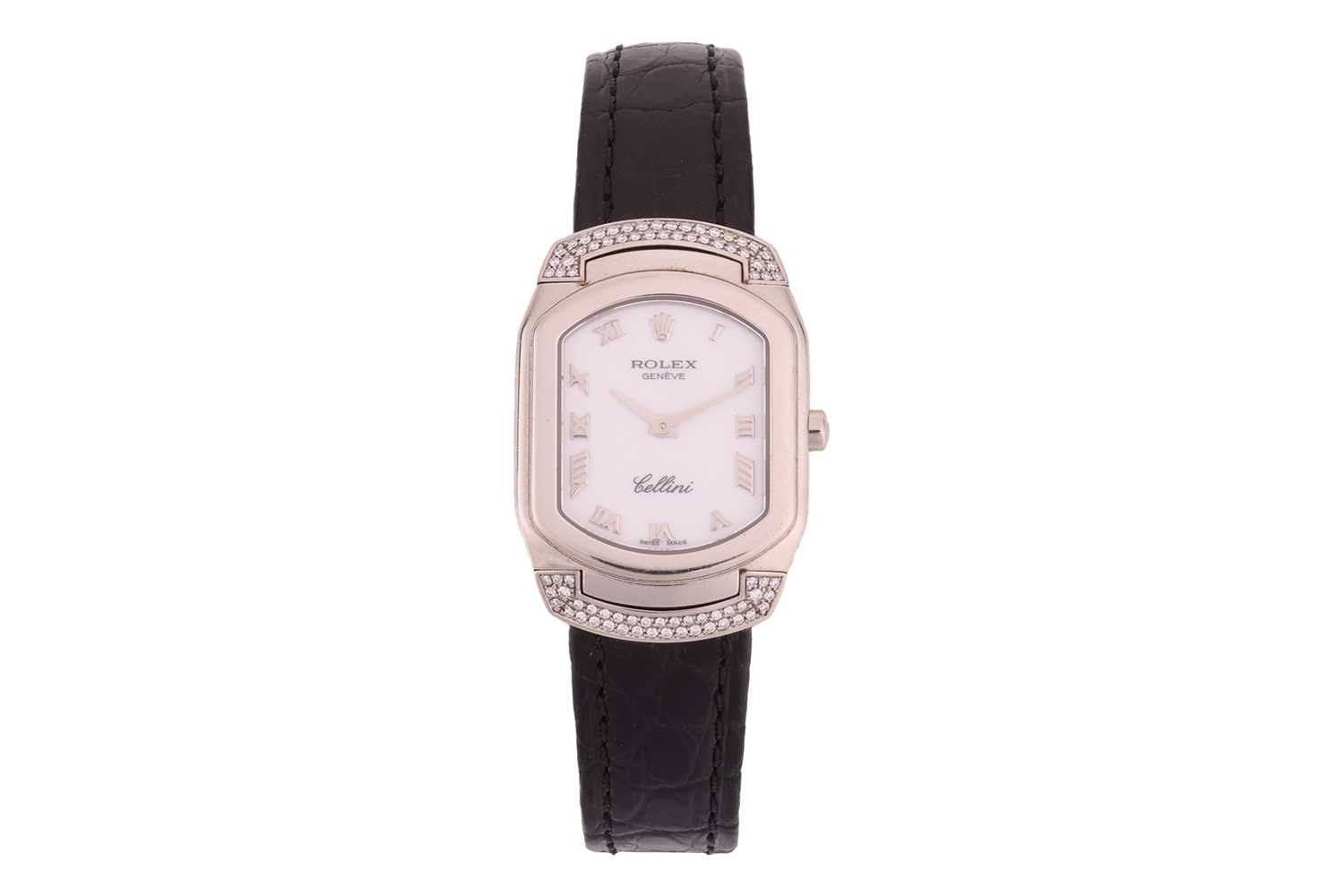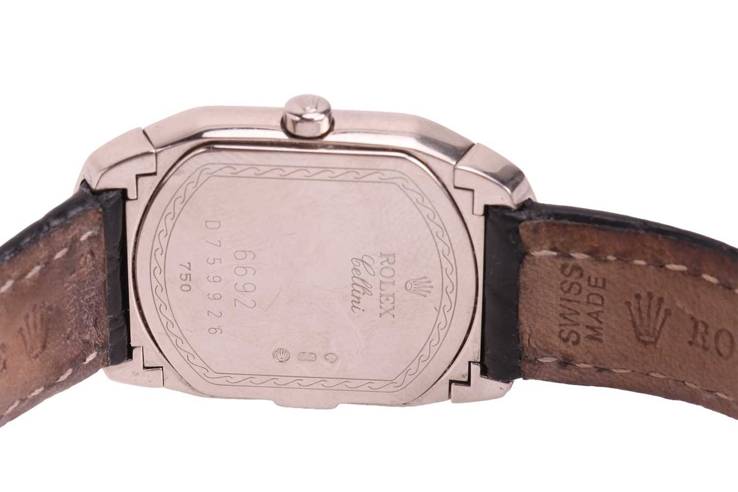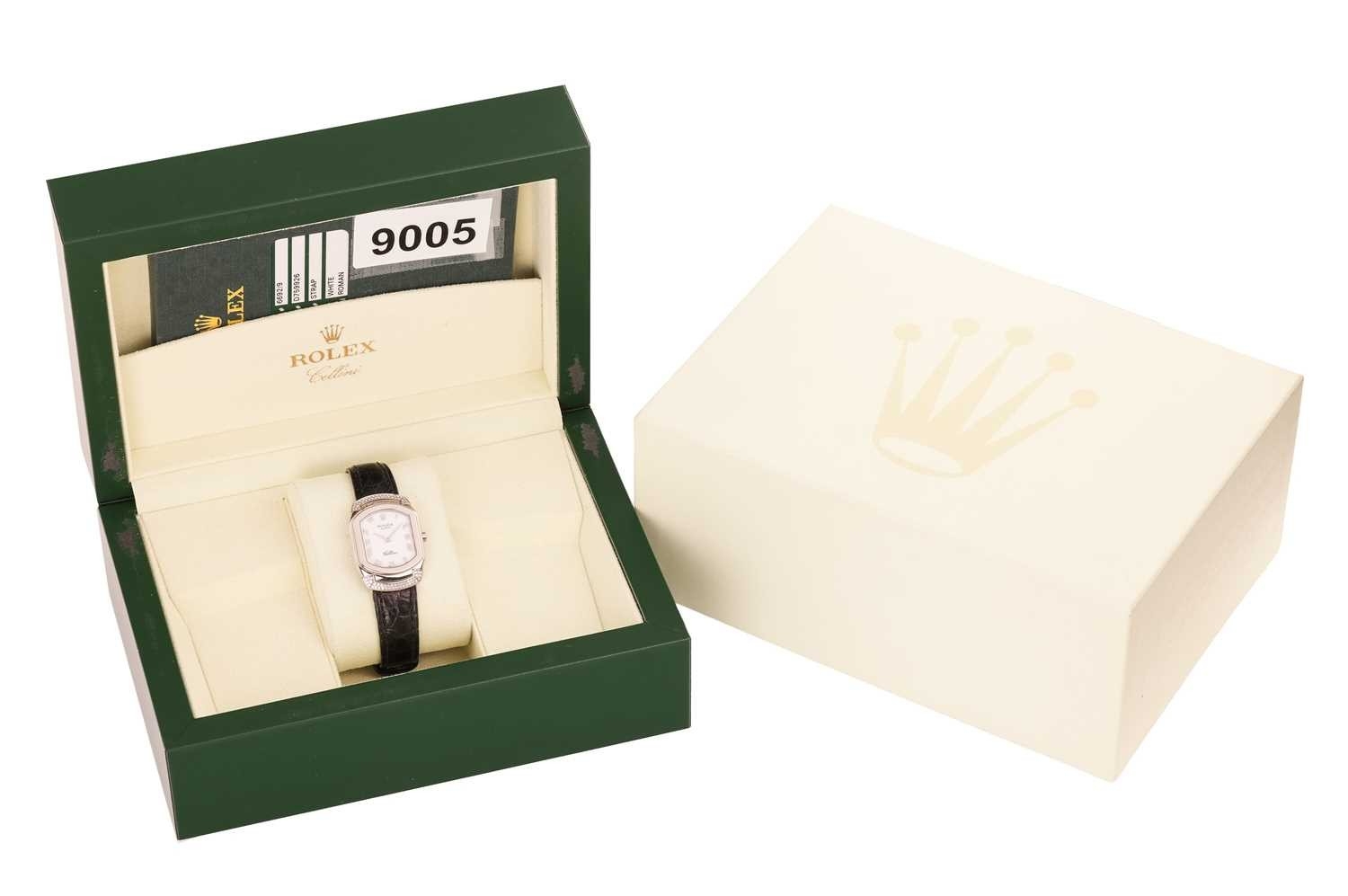 Rolex Cellissima Reference: 6692 Serial: D759926 Year: Purchased July 2008 Bezel: Smooth, Diamond-Set Case Material: 18ct White Gold Case Diameter: Approximately 24mm x 34mm Dial: White Numerals: Roman, Rolex Coronet at twelve o'clock Crown: Signed, Smooth Movement: Rolex Calibre 6621 Eight-Jewel Quartz Movement Strap: Signed, Black Crocodile Leather Inner Circumference: Approximately 15.5cm 18.0cm Buckle: Signed, 18ct White Gold Fold-Over Clasp, marked '24803' Box: Yes Papers: Guarantee Card & Service Centres Booklet Only Gross Weight: 47.3 grams Please Note: This lot contains a restricted species and therefore may be subject to additional shipping restrictions or regulations. Buyers are solely responsible for adhering to all regulations regarding the import/export of this lot prior to bidding. Buyers must obtain all necessary licences at their own expense. Inability to import/export this lot, or seizure by a government agency, does not justify delayed payment or cancellation of sale. For your protection, every watch with an estimate over £1,500 is checked against the Watch Register. This is an independent company who hold the world's largest, most established, international database of lost, stolen, and fake watches, containing data compiled over 35 years providing Dawsons' buyers with complete peace of mind. The watch is currently running, no long-term tests have been performed and accuracy cannot be guaranteed. A full service is advised on all watches and pocket watches once purchased. Surface scratches, scuffs and slight dents throughout. Dial in good condition. Crown in good working order. Clasp in good working order. Slight wear to strap. Slight wear to box and guarantee card. Note that the online condition report may not mention mechanical replacements or imperfections to the movement, case, dial, pendulum, separate base(s) or dome. Watches with water-resistant cases may have been opened to examine movements, but no warranties are given regarding their water resistance. Note that this piece is available to view, and we recommend that you do as that we cannot guarantee the authenticity or originality of individual components, such as wheels, hands, crowns, crystals, screws, bracelets, and wrist bands, since subsequent repairs and restoration may have changed the original components. Also, we cannot guarantee the authenticity or originality of any engraving or re-engraving on watch cases, case backs, bracelets, straps, or internal movements.