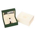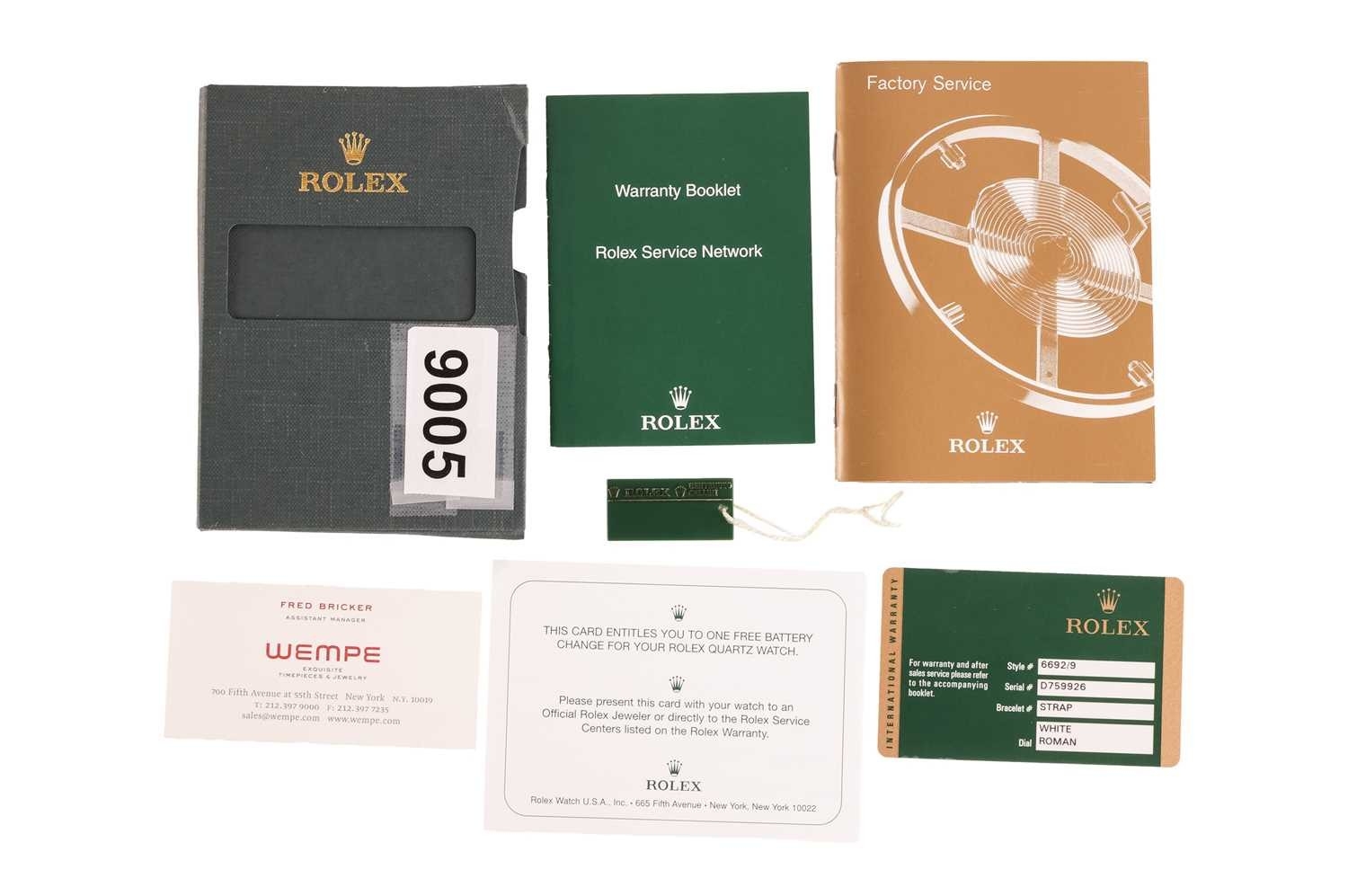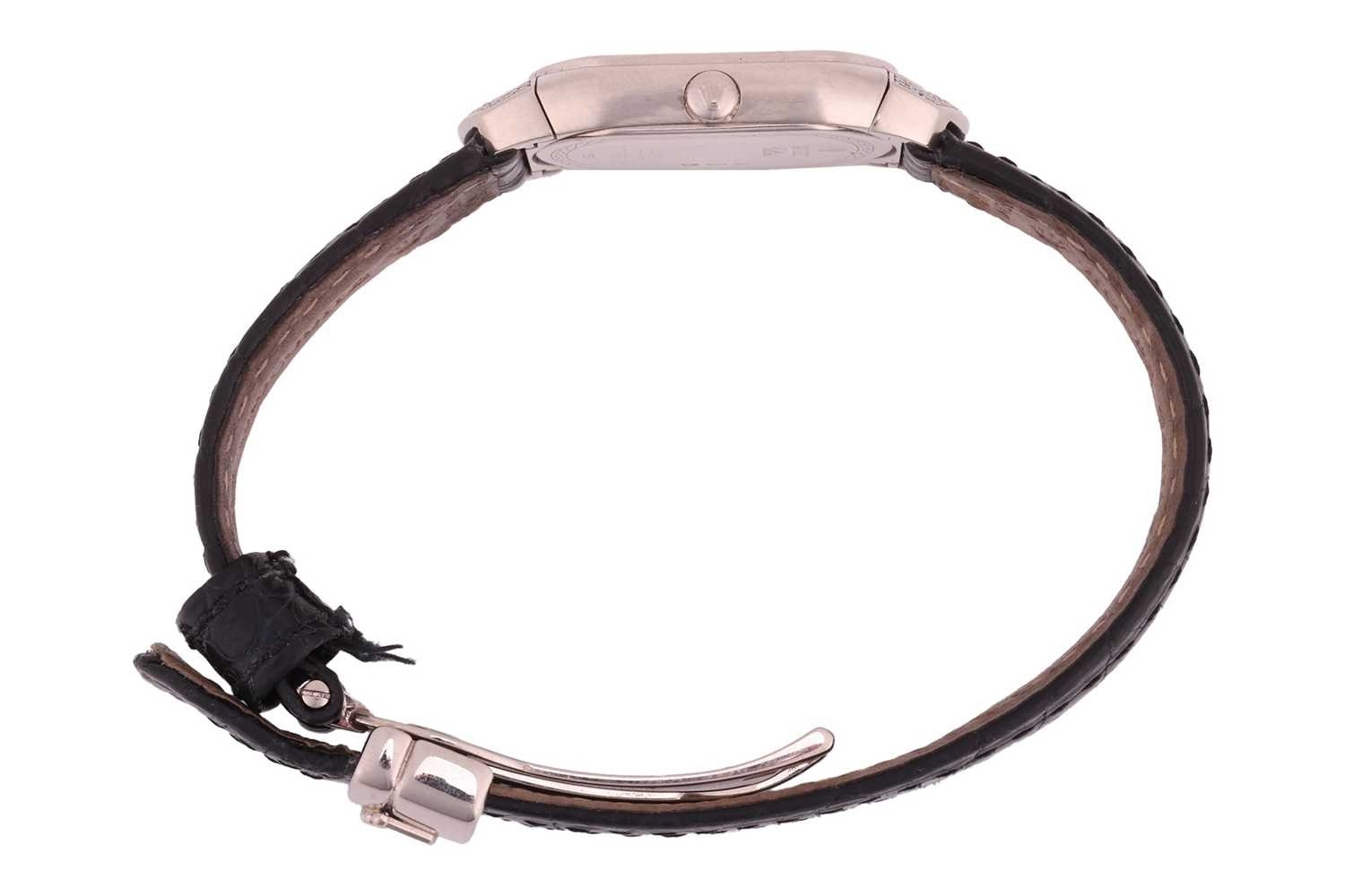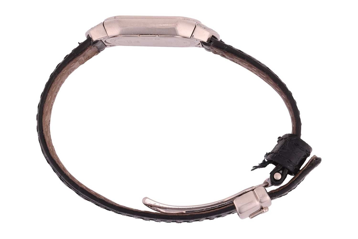 Rolex Cellissima Reference: 6692 Serial: D759926 Year: Purchased July 2008 Bezel: Smooth, Diamond-Set Case Material: 18ct White Gold Case Diameter: Approximately 24mm x 34mm Dial: White Numerals: Roman, Rolex Coronet at twelve o'clock Crown: Signed, Smooth Movement: Rolex Calibre 6621 Eight-Jewel Quartz Movement Strap: Signed, Black Crocodile Leather Inner Circumference: Approximately 15.5cm 18.0cm Buckle: Signed, 18ct White Gold Fold-Over Clasp, marked '24803' Box: Yes Papers: Guarantee Card & Service Centres Booklet Only Gross Weight: 47.3 grams Please Note: This lot contains a restricted species and therefore may be subject to additional shipping restrictions or regulations. Buyers are solely responsible for adhering to all regulations regarding the import/export of this lot prior to bidding. Buyers must obtain all necessary licences at their own expense. Inability to import/export this lot, or seizure by a government agency, does not justify delayed payment or cancellation of sale. For your protection, every watch with an estimate over £1,500 is checked against the Watch Register. This is an independent company who hold the world's largest, most established, international database of lost, stolen, and fake watches, containing data compiled over 35 years providing Dawsons' buyers with complete peace of mind. The watch is currently running, no long-term tests have been performed and accuracy cannot be guaranteed. A full service is advised on all watches and pocket watches once purchased. Surface scratches, scuffs and slight dents throughout. Dial in good condition. Crown in good working order. Clasp in good working order. Slight wear to strap. Slight wear to box and guarantee card. Note that the online condition report may not mention mechanical replacements or imperfections to the movement, case, dial, pendulum, separate base(s) or dome. Watches with water-resistant cases may have been opened to examine movements, but no warranties are given regarding their water resistance. Note that this piece is available to view, and we recommend that you do as that we cannot guarantee the authenticity or originality of individual components, such as wheels, hands, crowns, crystals, screws, bracelets, and wrist bands, since subsequent repairs and restoration may have changed the original components. Also, we cannot guarantee the authenticity or originality of any engraving or re-engraving on watch cases, case backs, bracelets, straps, or internal movements.