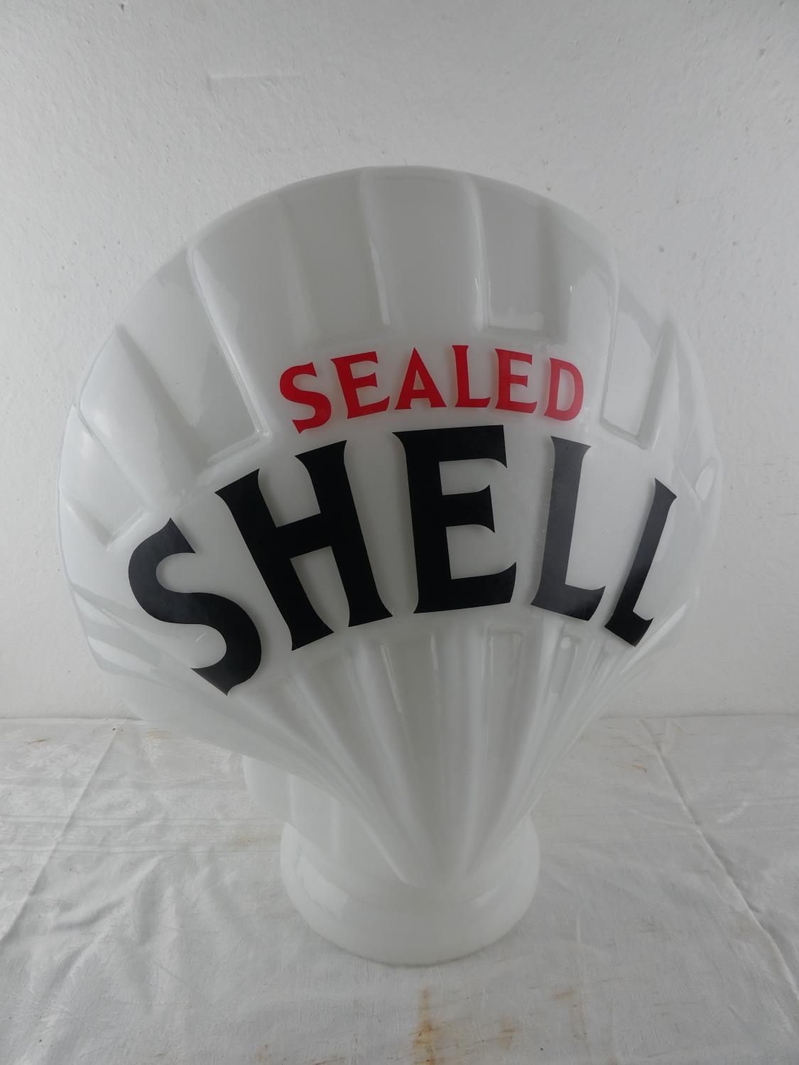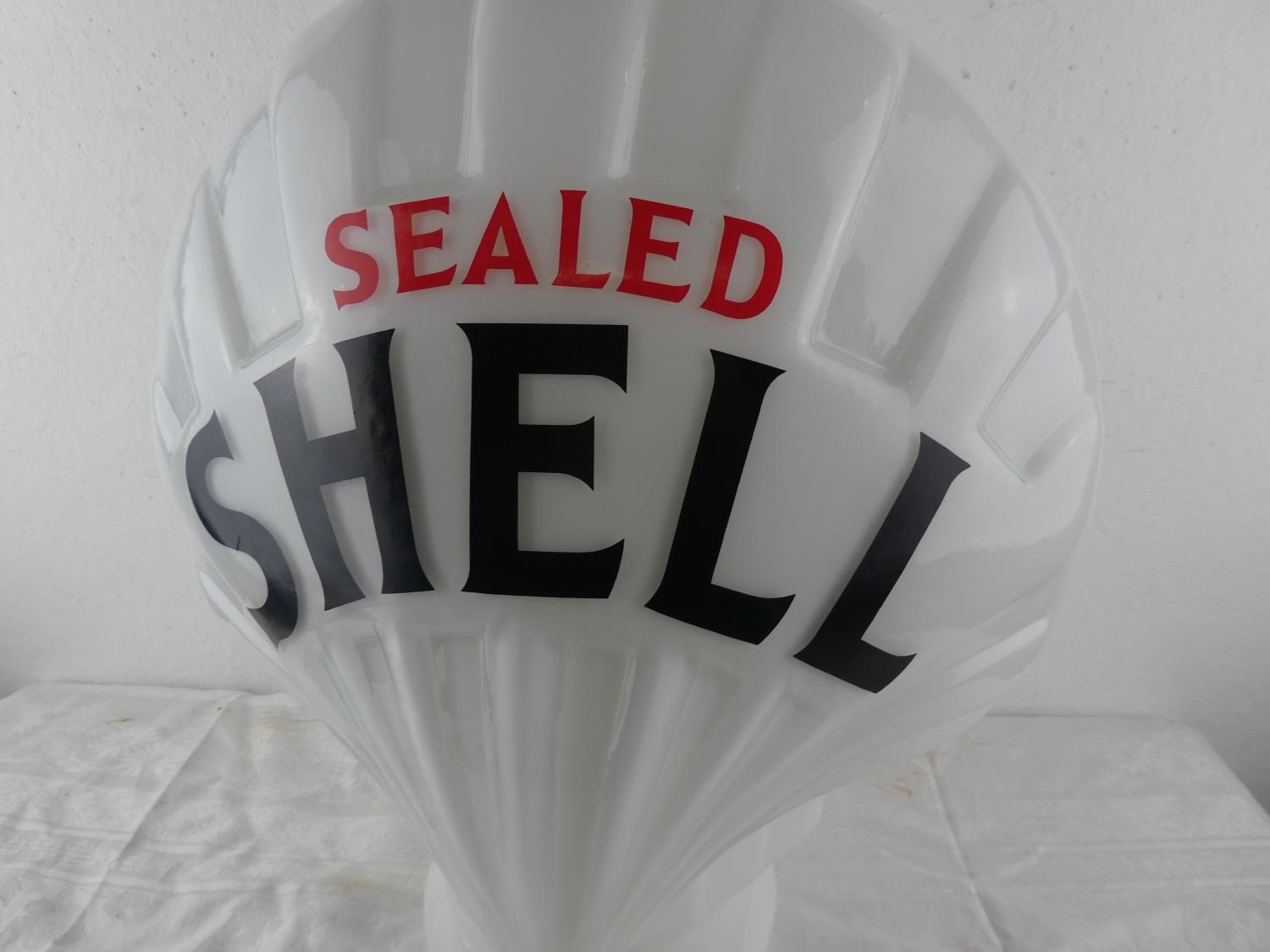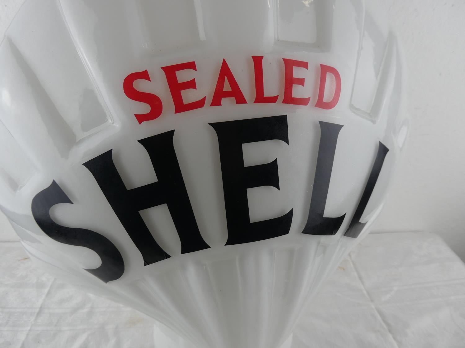 A large reproduction glass clam shaped 'Shell' gas pump globe.