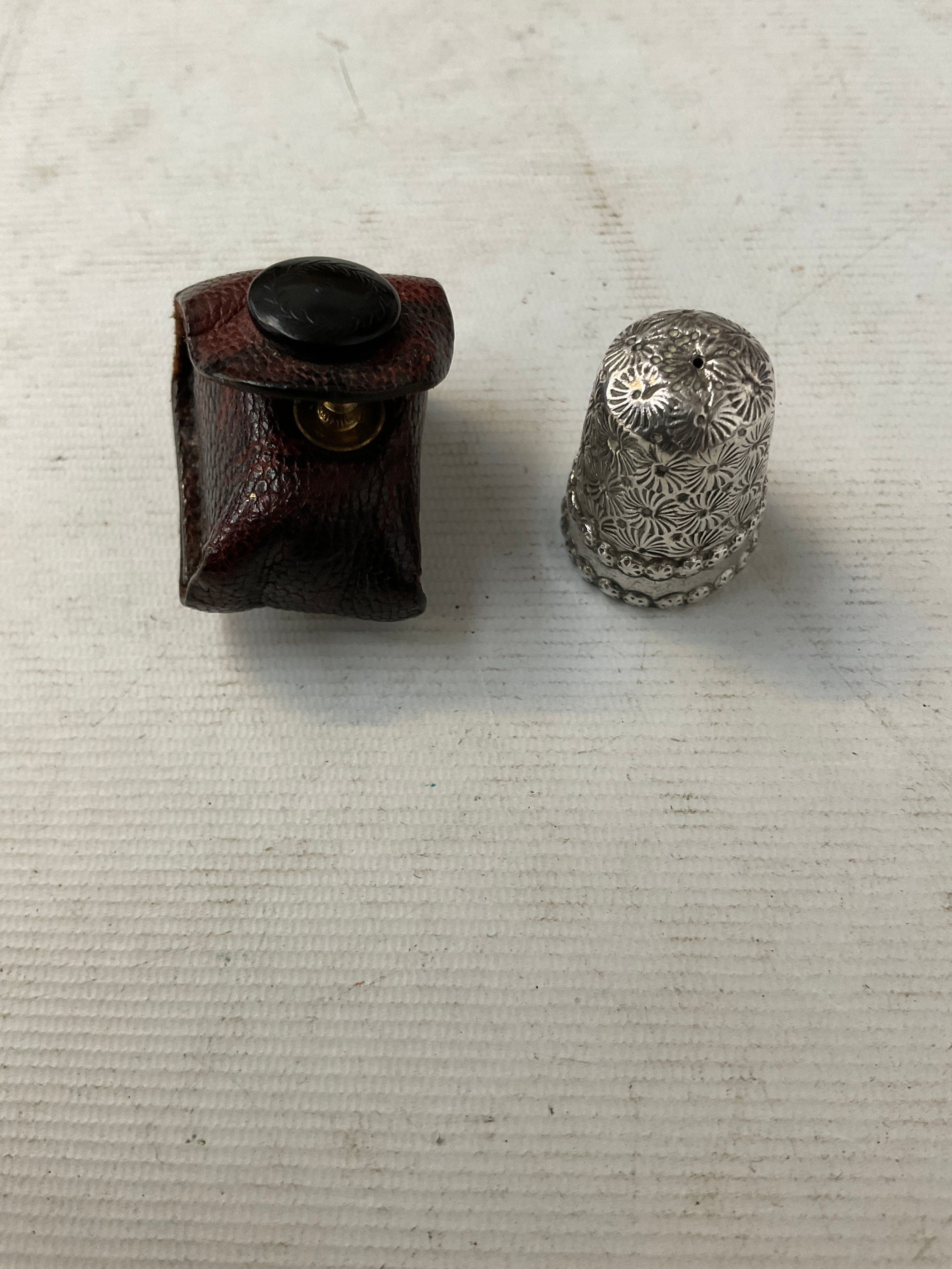 Silver hallmarked thimble with leather pouch, weight 6.2 grams