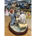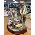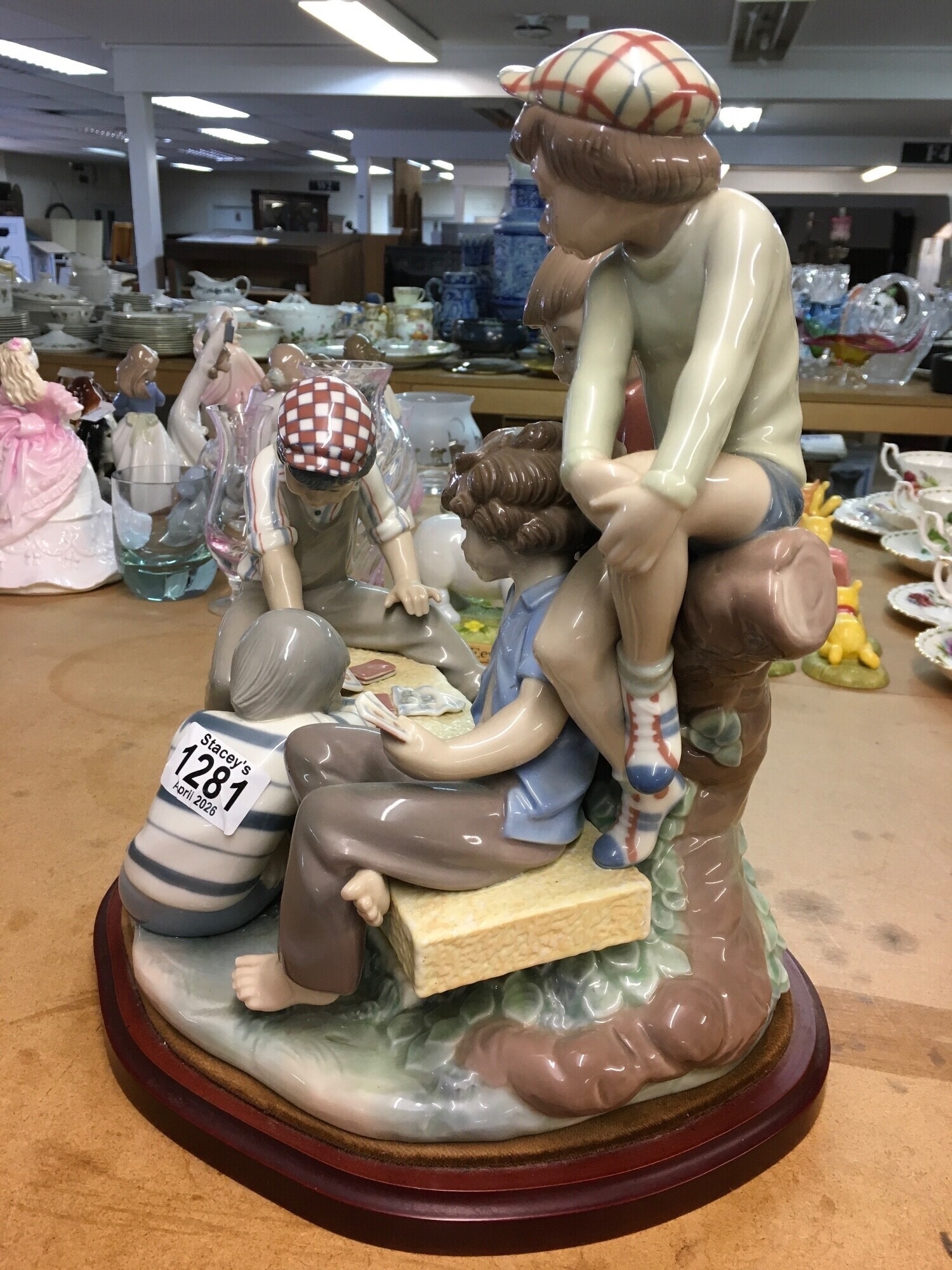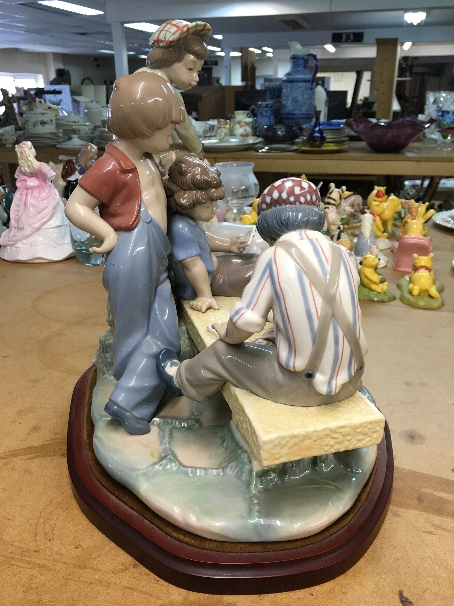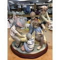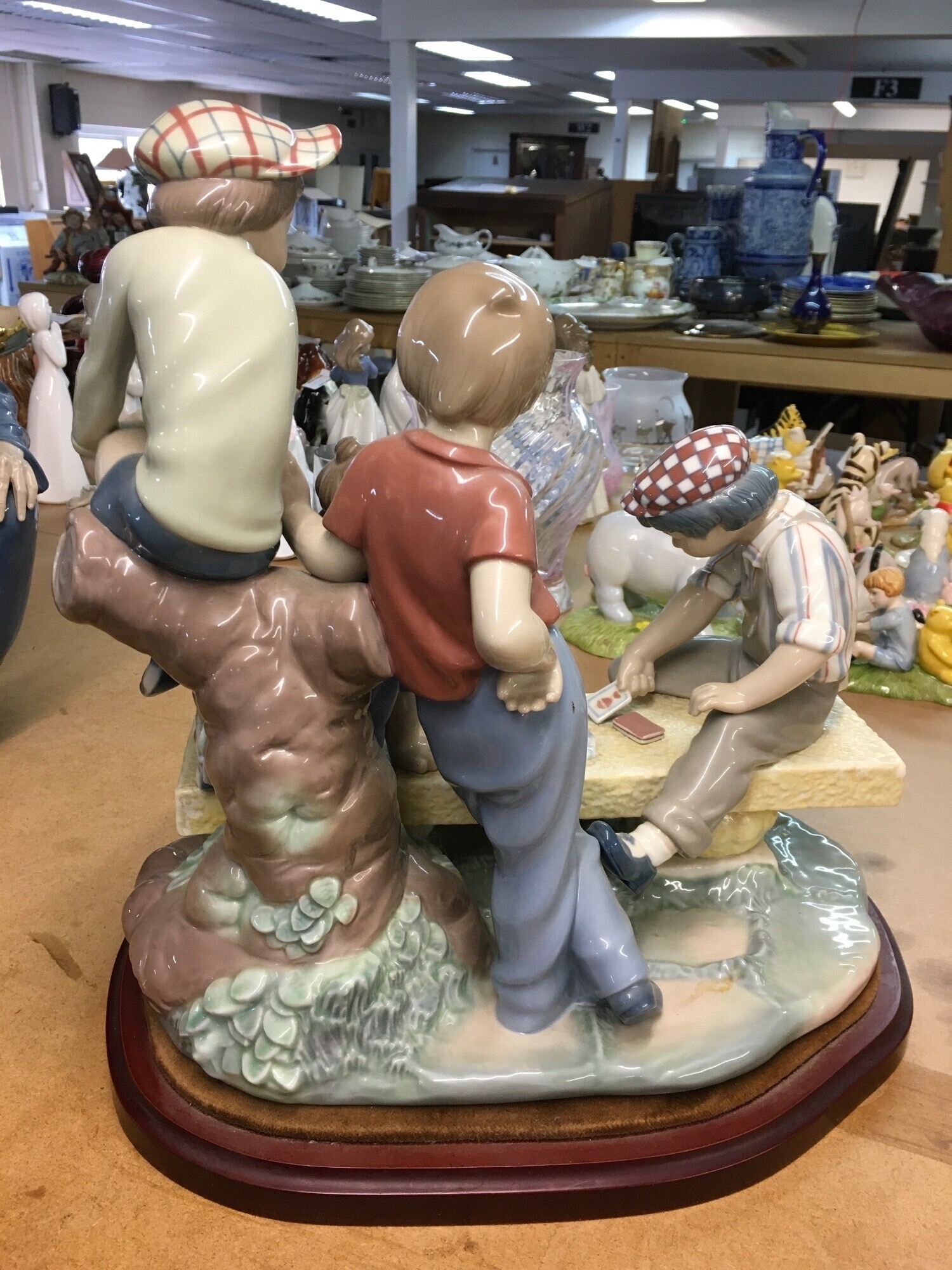 A large Lladro figure group of young boys playing cards on a bench. 30cm in height, not including wooden base