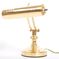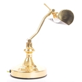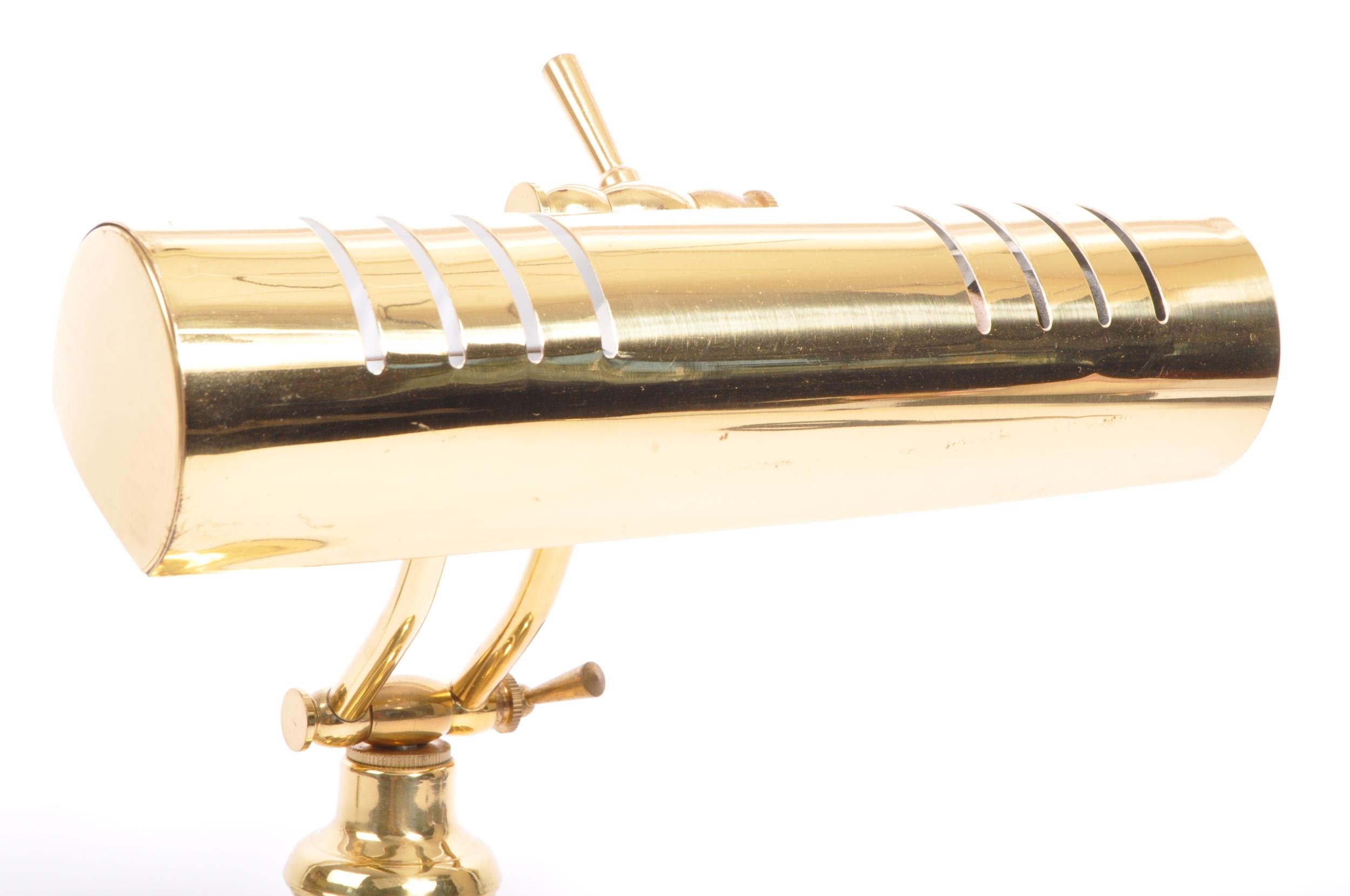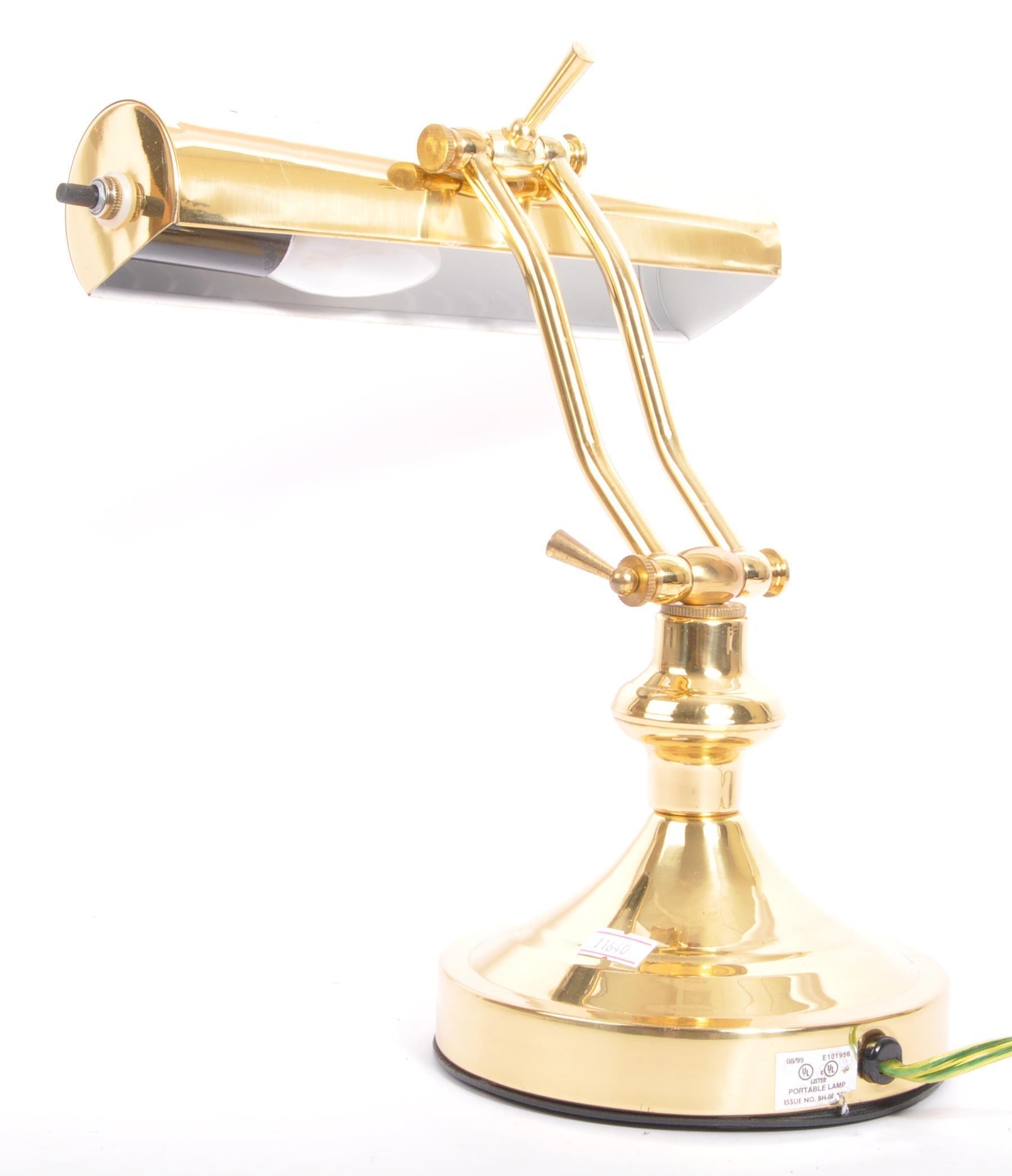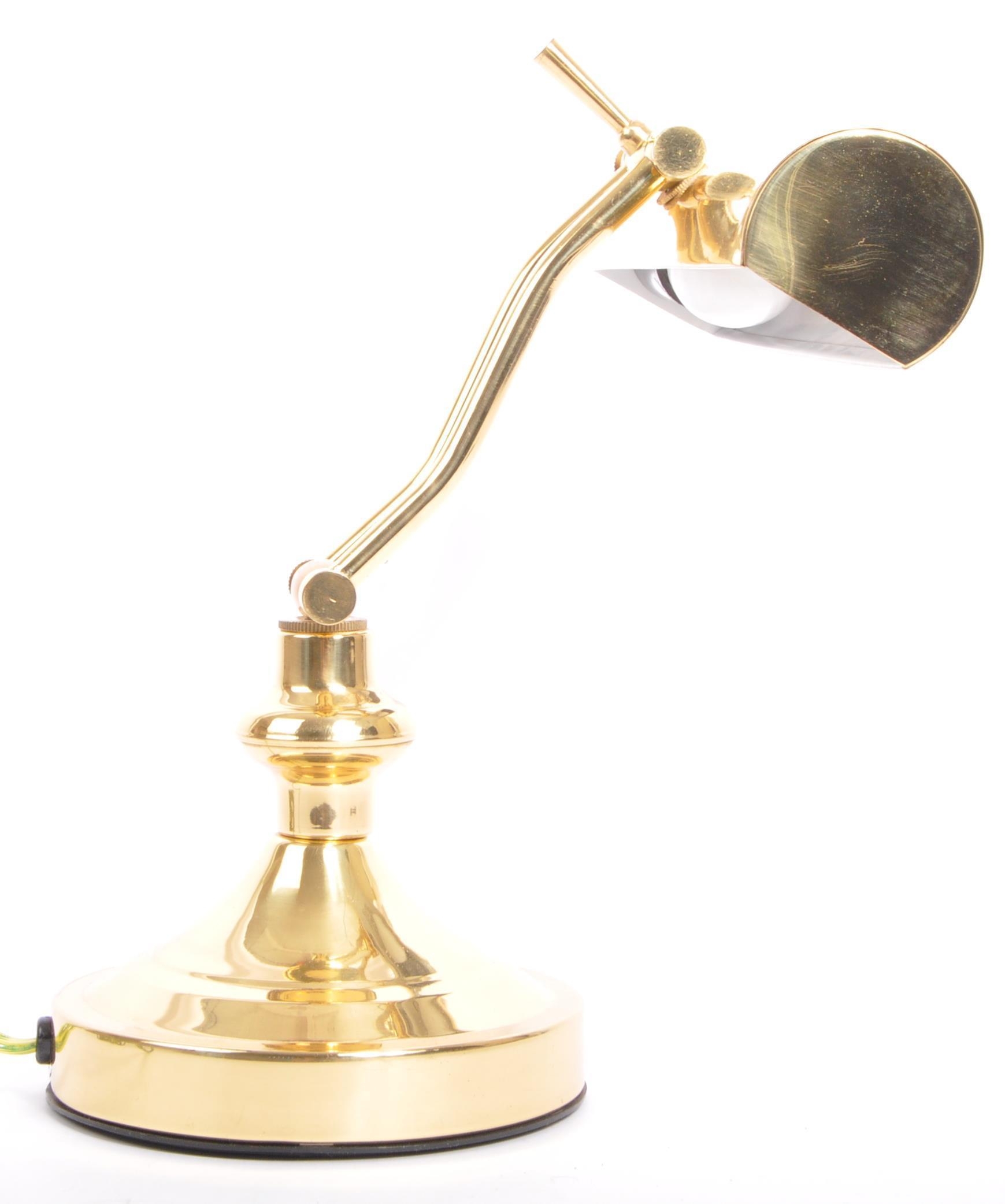 A retro vintage 20th Century brass bankers, office / desk / bankers lamp light. With adjustable vented shade, supported on twin curved bars on a circular base. Measures approx. 30cm tall.