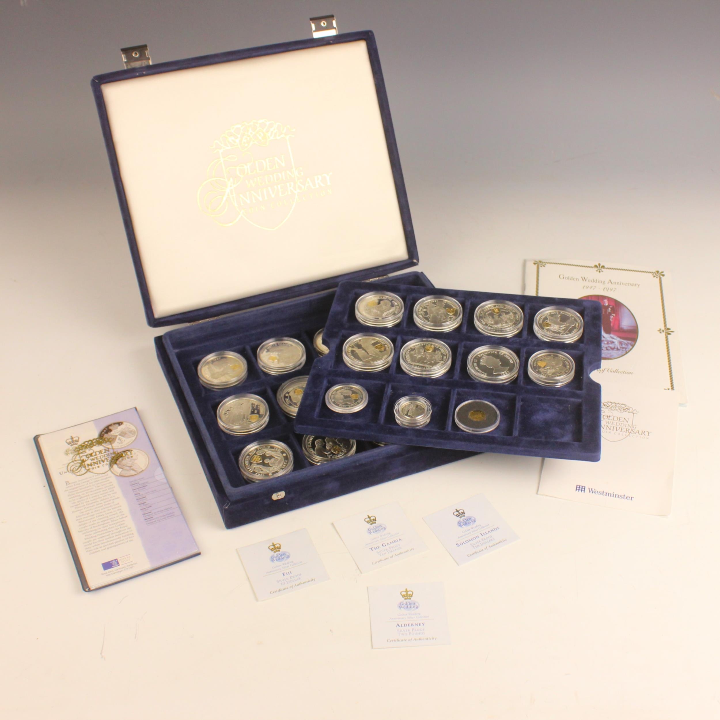 The Royal Mint Golden Wedding Anniversary 1947-1997 coin collection, comprising twenty encapsulated coins, including 1000 kwacha, 10 dollar coin, etc, cased with partial paperwork, and further coins including an Elizabeth Bailiwick of Guernsey coin (qty) (at fault)