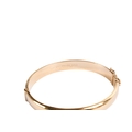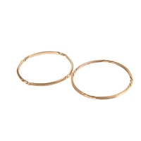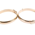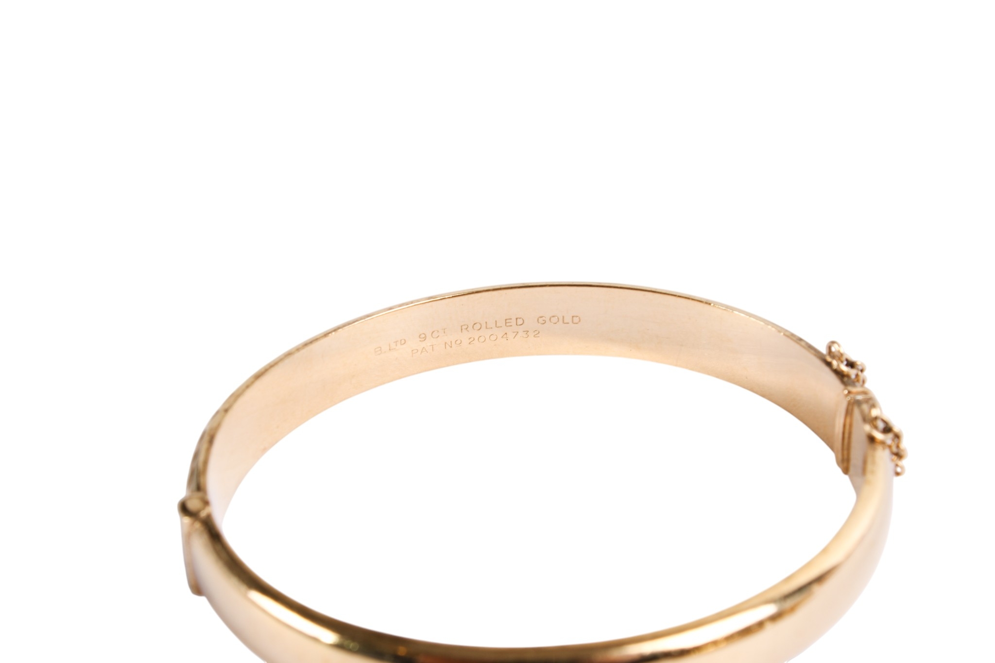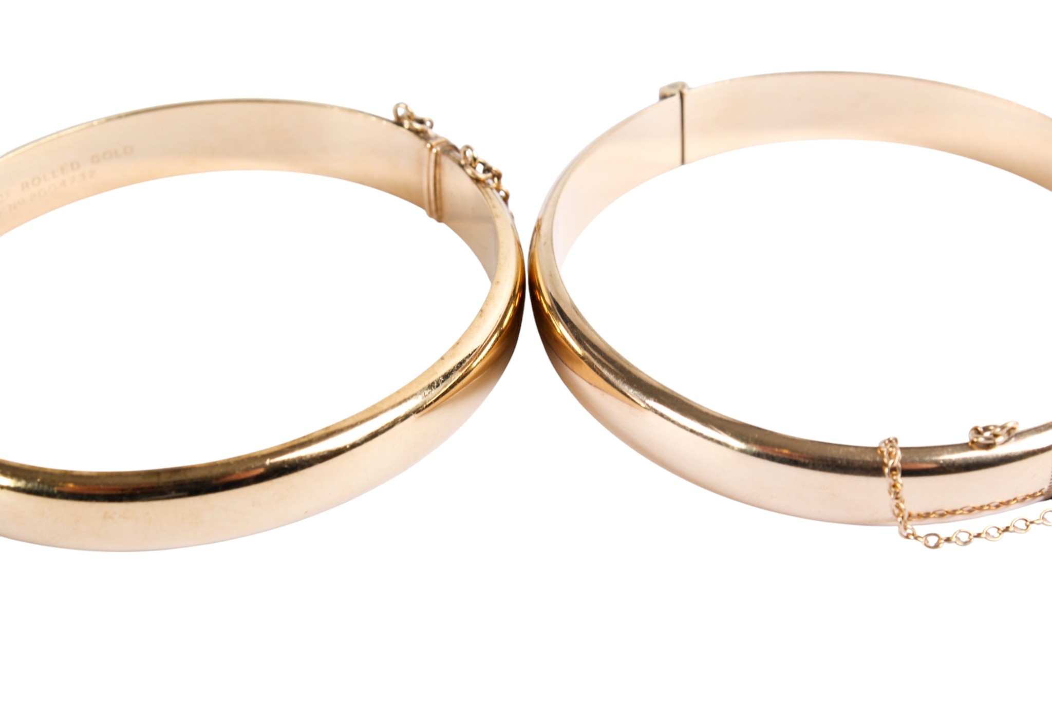 A 9ct gold bangle and a rolled gold example. With matching engraved design to one half, both with security chain, one hallmarked, this weighing 10.7g. Gross weight 22.8g.