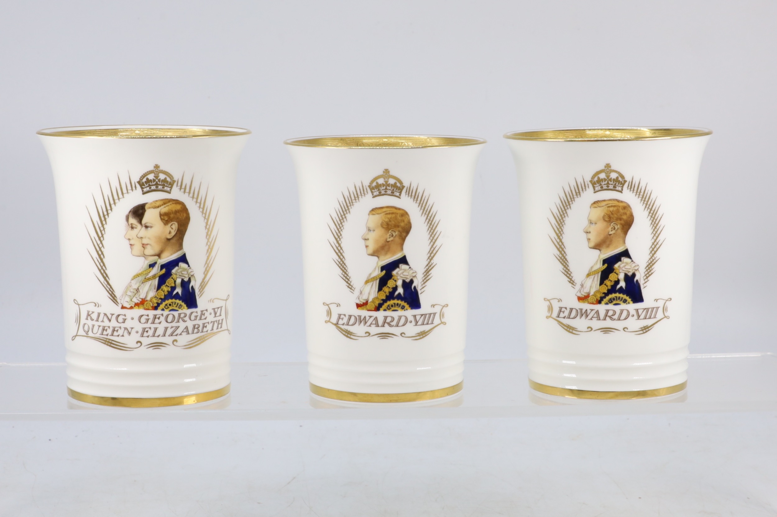 Three Minton limited edition beakers Two Edward VII and One King George VI and Queen Elizabeth