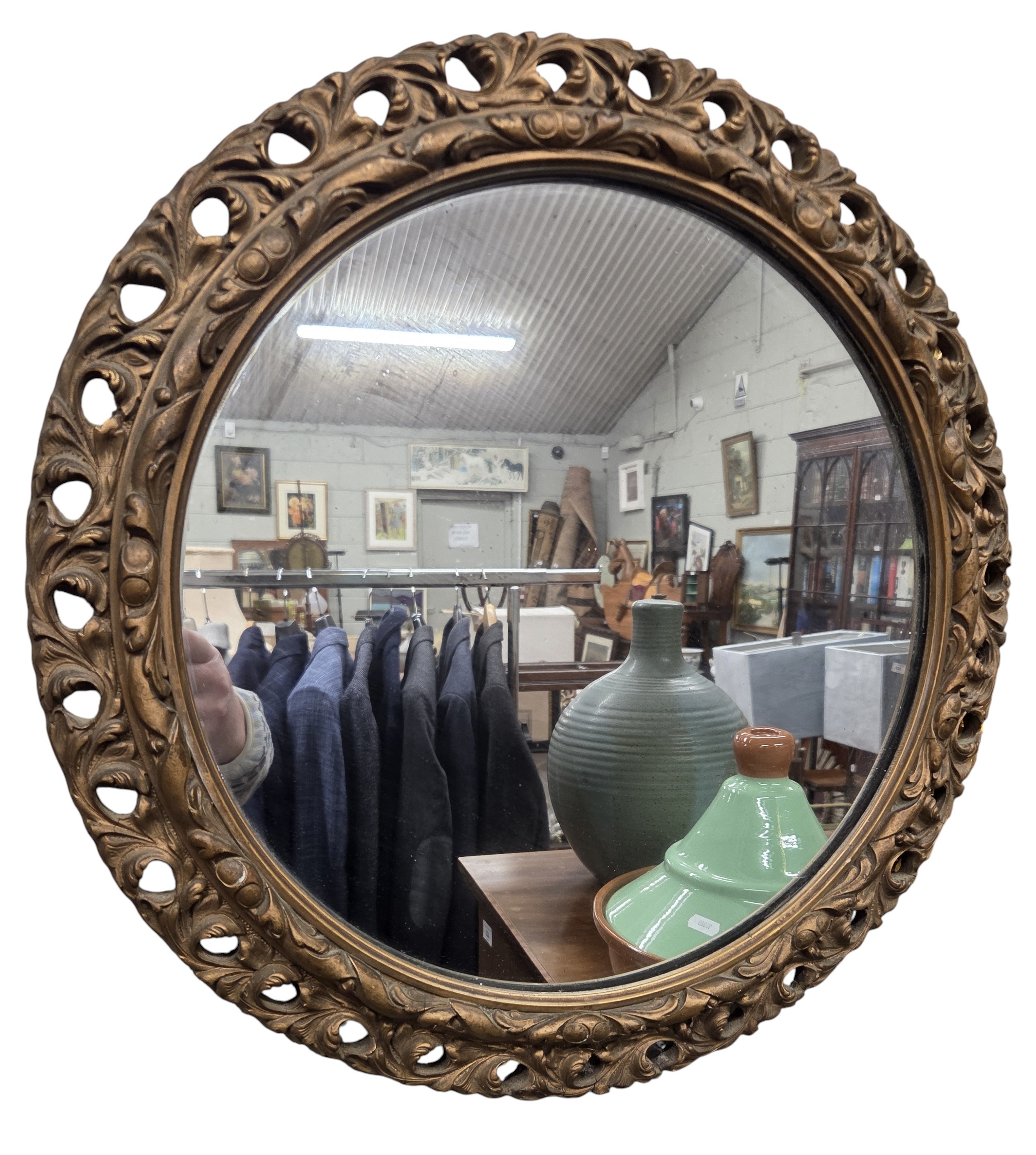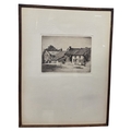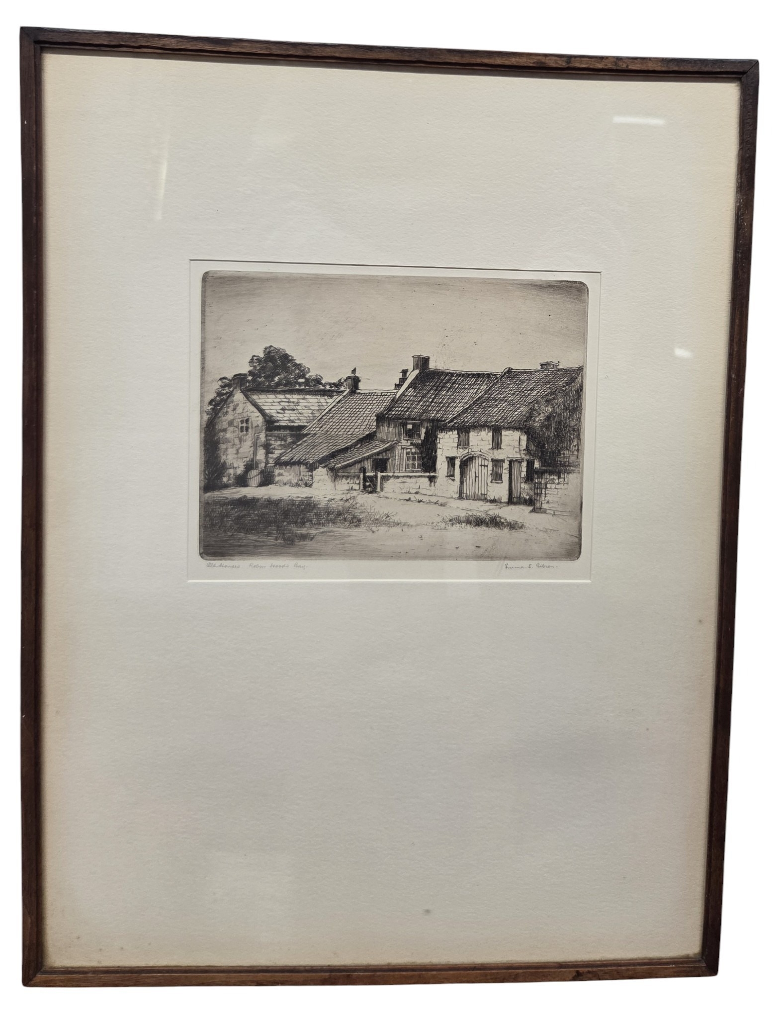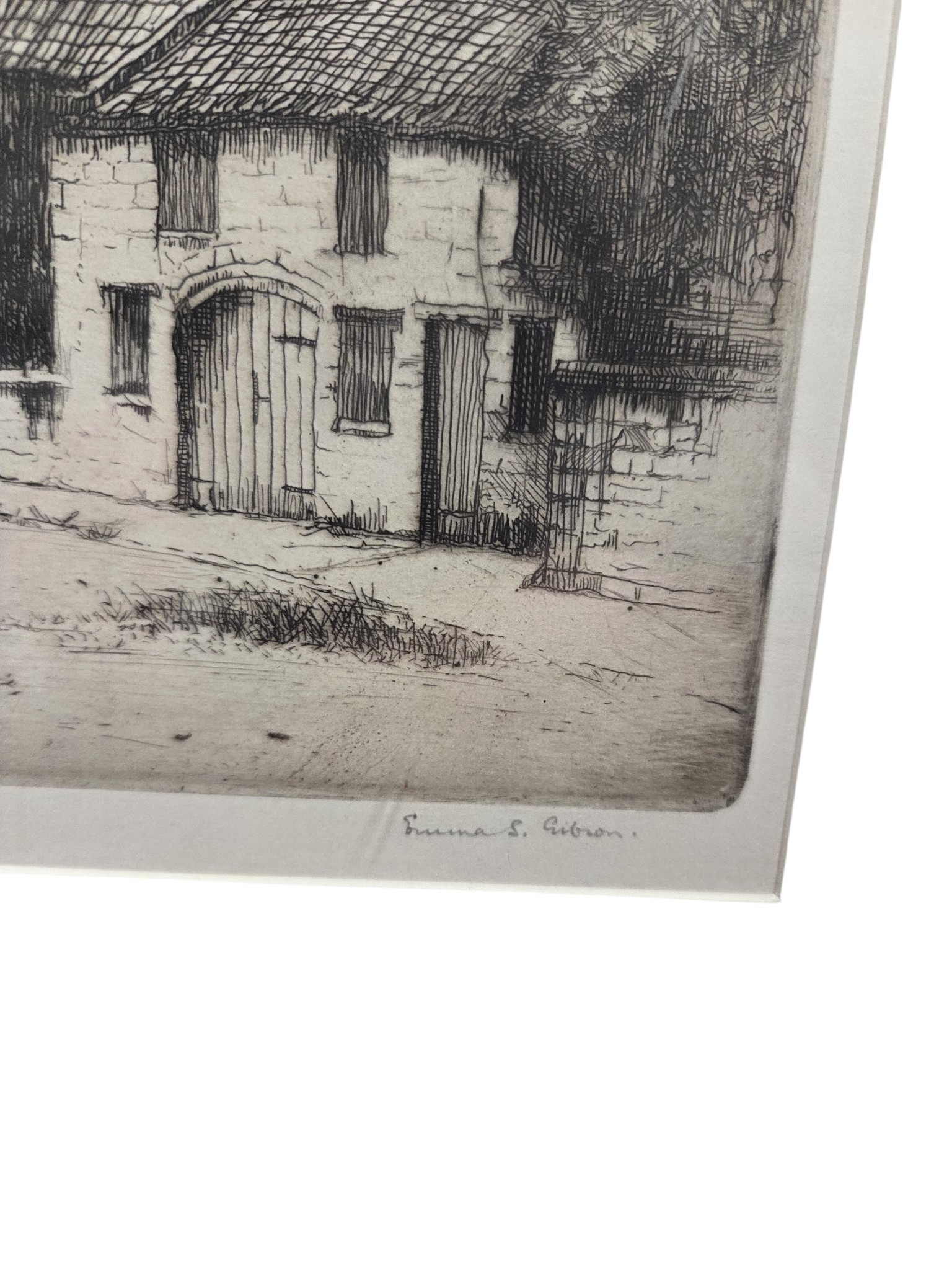 A good 19th Century Etching of a Farmhouse after Emma Gibson signed in the margin in a Pencil along with a late 19th early 20th Century Plaster Gilt circular Mirror with pierced outline.