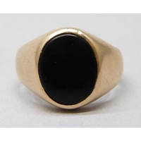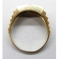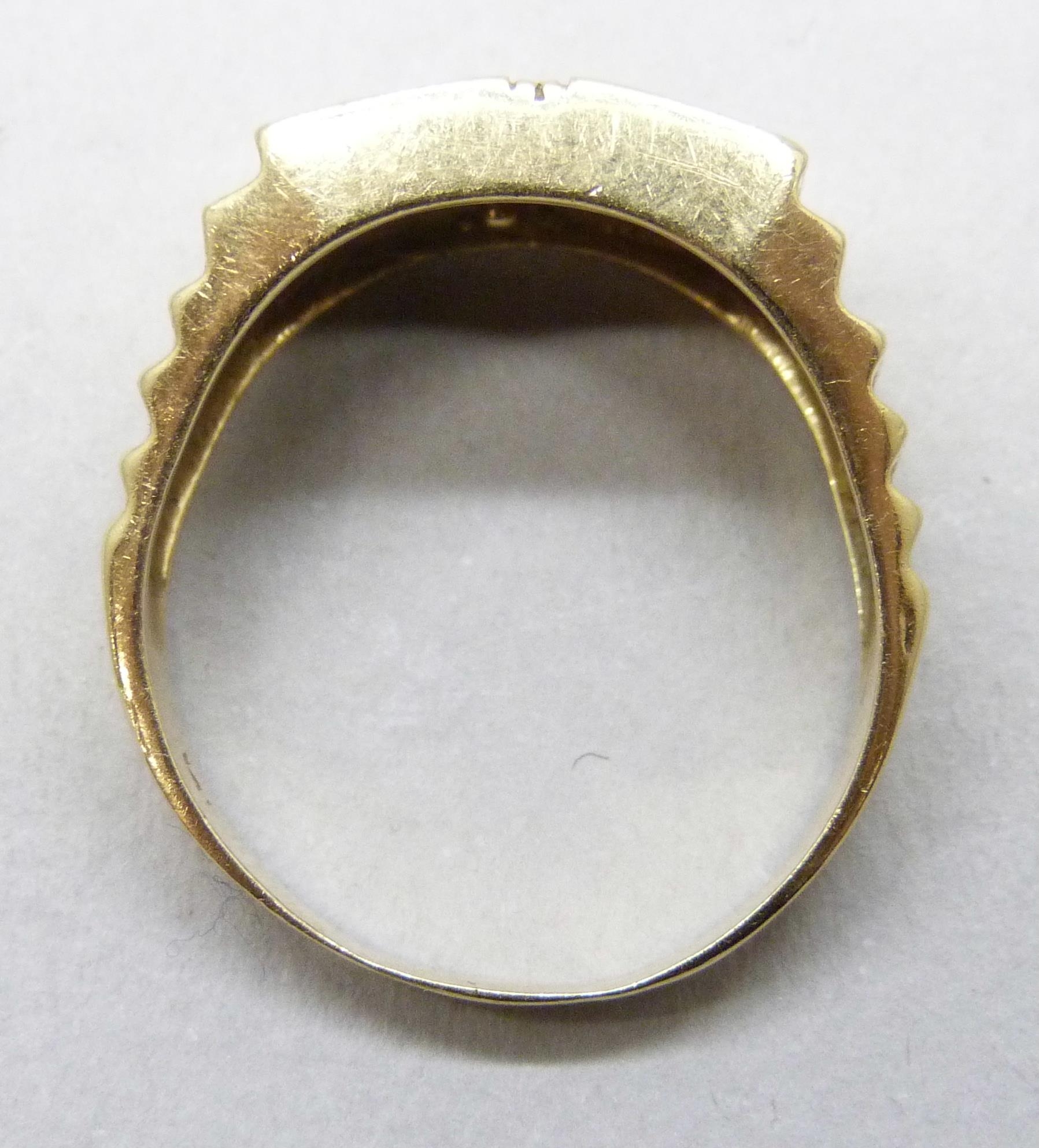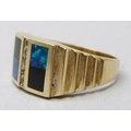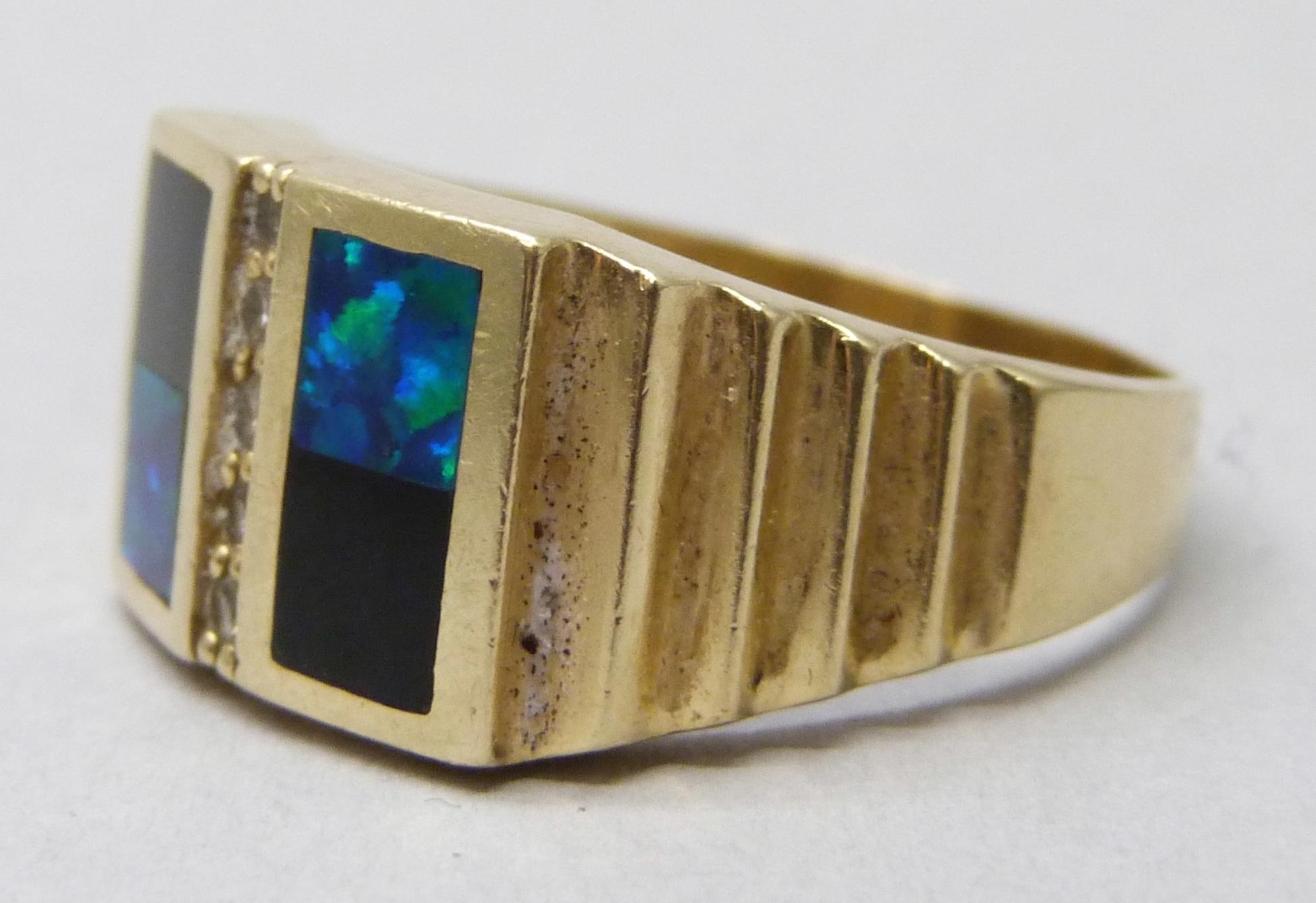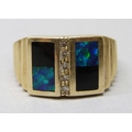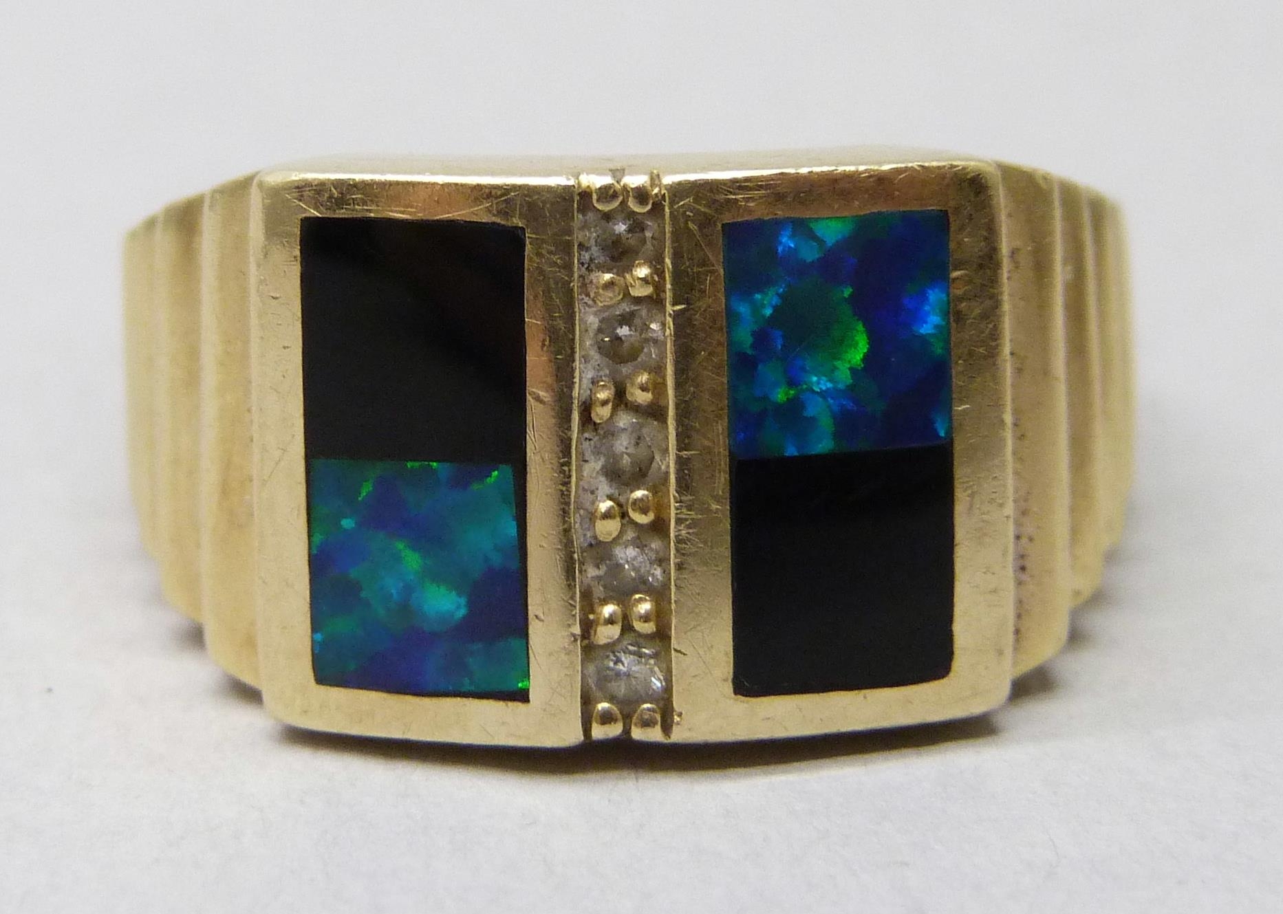 A 14ct gold ring set with onyx and opal style inlay, and a central row of diamonds, 9.9g, W/X